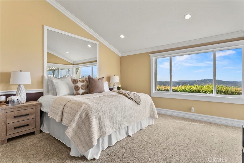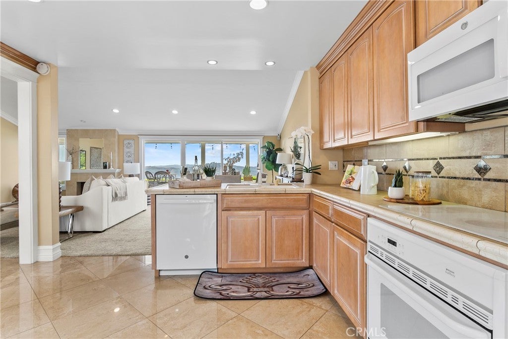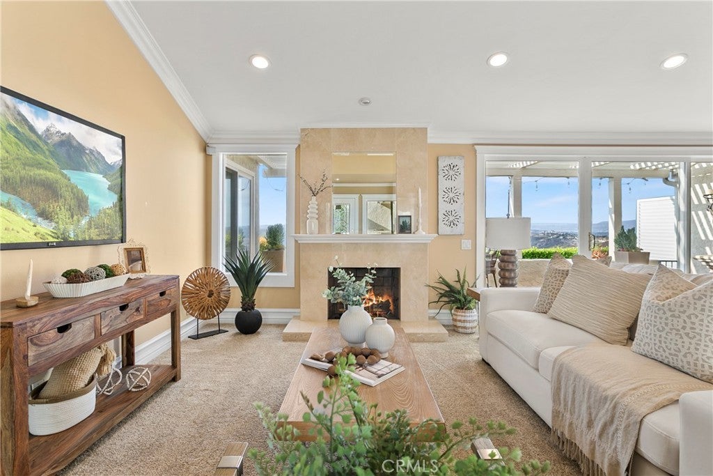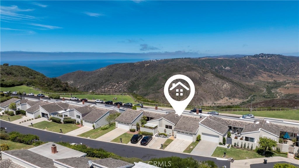 Rare opportunity, this attached home is on the most sought after street in Monarch Summit II, featuring Spectacular Ocean, Catalina, Saddleback Valley Mountains, Sunsets & City Lights Views, located on a single loaded street. This home has unobstructed panoramic views, without rooftop intrusion and sits across from Seaview Park where you can take in the joys of people watching & trails by day & quiet serenity & majestic city lights by night.This 1,400 sq ft single level floor-plan offers quality craftsmanship throughout with an updated, large dine in kitchen, custom maple cabinets, countertops with marble bullnose, built in cooktop, oven, dishwasher & refrigerator. It also features a computer desk with cabinetry & a centered wine rack. Additional features consist of an attached 2 car garage, Bose speaker systems, large format porcelain floors, crown moldings, custom baseboards, recessed lighting, paneled doors, custom window casings & large glass sliders throughout the house & a BBQ island off the kitchen courtyard.The kitchen’s walls are open to create one fabulous “great room” with a living room and additional dining space which enhances the sensational unobstructed views. The “great room” also features a polished marble fireplace, vaulted ceiling & a large slider opening to the back patio view. A large primary bedroom with vaulted ceilings that has a spectacular night-light view of the Saddleback Mts, Canyon below, while still providing ocean views from various perspectives. The adjoining bathroom has a large skylight, ceramic tile shower & tub, double vanity, polish porcelain floors & elaborate crown molding, backlit with custom lighting & a large closet area with mirrored sliders. The secondary bedroom has vaulted ceilings, crown molding, recessed lights & mirrored wardrobe closets. The remolded hall bath has porcelain tiled shower with glass doors, skylight and a beautiful custom vanity. This is resort style living in a 55 + community that has a pool, jacuzzi, clubhouse, nearby world class beaches, dining & shopping.