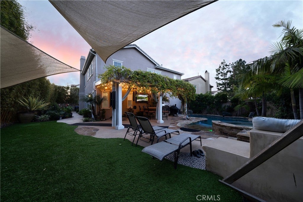 Just off the luscious Mesa Verde golf course is the Cornerstone private gated community featuring a play scape and open guest parking. The home is the largest lot in the community and is the only home with a heated private pool and Jacuzzi. It's a corner lot nestled in the back of the community and shares the drive up with four other homes. The drive up leads to an attached two car garage with extended storage space and above head racks. The house is 4 bedroom 3 full bathrooms. Recent remodel included an electrical panel upgrade and is equipped with USB-C outlets throughout, complete Kitchen remodel great for hosting. The farm doors take you out back to your own private oasis with an outdoor kitchen, TV for entertainment, a large gathering gas fire pit and a private play scape. Fruit trees, herb garden and beautiful, thick bamboo enhance the privacy and tropical aesthetic. Costa Mesa is close to world class beach city, known for the Orange County fairgrounds, South Coast Plaza, Vanguard University, Hoag Hospital and Orange Coast College.