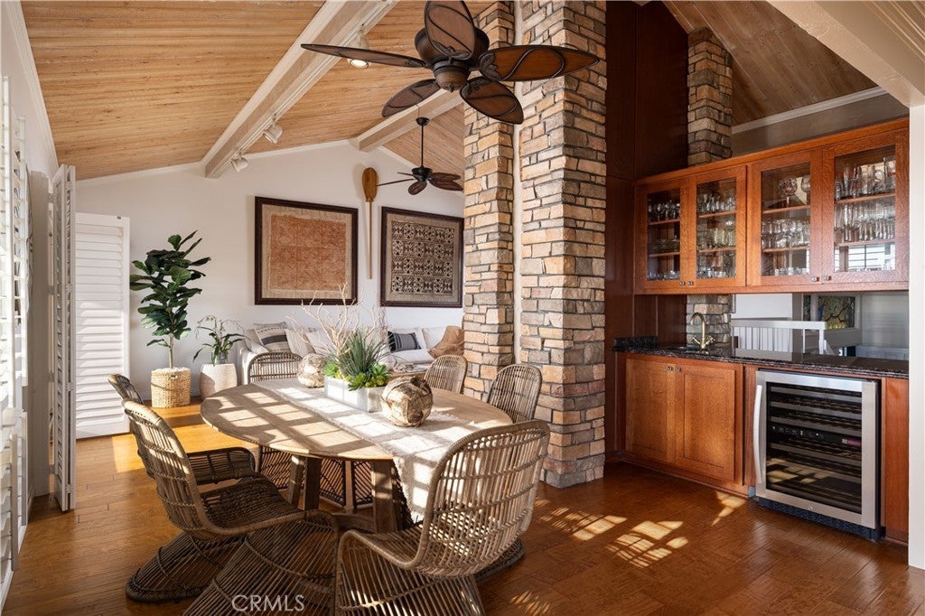 Beamed Ceilings, Wet Bar, Breakfast Bar, Built-in Features, Balcony, Breakfast Area, Ceiling Fan(s), Crown Molding, Cathedral Ceiling(s), Separate/Formal Dining Room, Granite Counters, High Ceilings, Living Room Deck Attached, Multiple Staircases, Open Floorplan, Pantry, Recessed Lighting, Track Lighting, Bar, All Bedrooms Down, Entrance Foyer