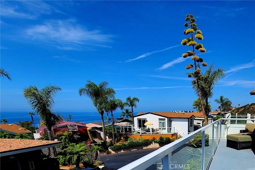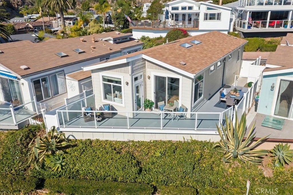 “Sea” the best ocean, island & sunset views from nearly every inch! Awaken to the ocean. Fall asleep to sunsets. Here's coastal living at its finest: A turnkey, modern beach home with 180° panoramic view. A quiet location - protected from noise of hwy and parking. Luxury constructed with high ceilings and doors. Filled with light from skylights and clerestory windows. A fresh, cool, neutral interior. All new quartz counters and faucets. An open-concept great room of living, dining, kitchen, and niche. Outstanding outdoor living with wrap-around deck, green faux-lawn at entry and side yard, and a bearing orange tree. Two bedrooms with walk-in closets. Bedroom I with incredible ocean views. Bedroom II "seas" the big blue thru its entry and mountains thru its window. Home is fully-fenced with a gated parking space and dog run. Plus, convenient 2-car parking at its front gate. | This is the quintessential turnkey beach home. It includes A/C and all appliances. Its furnishings and decor may be purchased, as well. | Located in terrific Laguna Terrace! Enjoy fun and relaxation at your doorstep. Amenities include a fabulous community clubhouse; heated-year-round pool and spa; well-equipped gym; event room with fireplace lounge; kitchen; WIFI and patios. Plus, impeccable staff who keep it in tip-top shape. | And, leave the car behind! This home is perfectly situated: Above Aliso Plaza shops and dining. Across PCH from The Montage Resort and Treasure Island paths, beach, and tidepools. Around the corner from Aliso Beach on-the-sand Lost Pier Cafe and The Ranch Resort golf course. Then, travel by trolley thru Laguna and neighboring coastal towns. Board a boat to Catalina Island from Dana Point Harbor. And, don't miss the Festival of Arts, Pageant of the Masters, Sawdust Festival, outdoor concerts, and so much more. It's great for all ages: within the prestigious Laguna Beach School District, plus classy downtown Susi Q Senior Center. | This is an incredible value. To buy on fee land in Laguna, you’d pay about $3,000,000 plus $33,000 yearly tax. In Laguna Terrace, it’s just $477,000 plus $5,250/month land lease with tiny annual tax. And, it may qualify for the $7,000 Homeowner's Exemption. Don’t miss this value. Come “seas” the day!