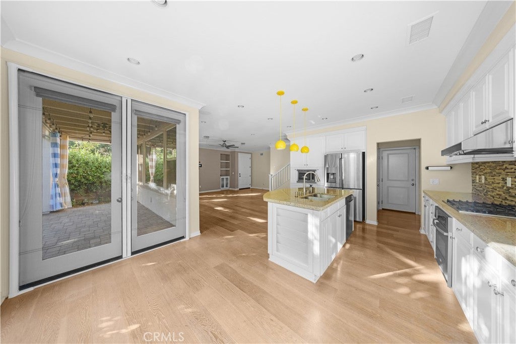 This beautifully upgraded corner-lot home in Stonegate East offers 4 bedrooms and 3 bathrooms across 1,956 sq. ft. of living space. With no neighbors above or below, the two-story layout combines privacy with modern comfort. The gourmet kitchen features granite countertops, shaker cabinetry with a showcase cabinet, stainless steel appliances, a butler’s pantry, and a spacious island that flows into the dining area. Wide-plank hardwood floors, crown molding, recessed lighting, and built-in surround sound speakers highlight the main living spaces, while new energy-efficient windows and motorized shades add convenience and style. Upstairs, the primary suite includes high ceilings and a spa-inspired bath with a soaking tub, walk-in shower, and dual sinks. Three additional bedrooms and two upgraded bathrooms provide ample flexibility, and the private backyard with covered patio and gas hookup is perfect for outdoor entertaining. Located within walking distance to Woodbury Town Center and Crean Lutheran High School, and part of the award-winning Irvine Unified School District, this home also offers easy access to resort-style community amenities, parks, freeways, and popular destinations including Irvine Spectrum, Great Park, and Disneyland.