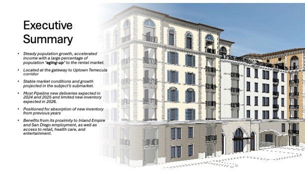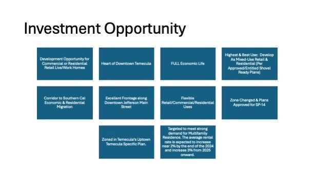 Temecula Multi-family Development Opportunity for 233 Keys Status: Stamp Approved, Fully Entitled, Shovel Ready This is a rare shovel-ready project in one of California’s high-growth mid-level markets, ideally positioned to meet the demands of young professionals and lifestyle renters. Highlights: • Prime Uptown Temecula location in the heart of Wine Country and Uptown Temecula Specific Plan. • Fully approved entitlements after a lengthy process – ready to pull permits immediately. • Strong market fundamentals: population growth, accelerated incomes, large percentage of residents 'aging-up' into rental market. • Two-building design totaling 238 Class-A units plus ~27,000 SF retail/restaurant/event space. • Positioned for strong absorption post 2026. • Rare opportunity in one of California’s fastest-growing lifestyle-driven markets.