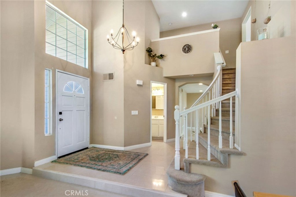 Experience the best of Robinson Ranch living —a beautiful two-story home perfectly positioned on a quiet street just steps from parks, playgrounds, and the community pool. This spacious residence features 4 bedrooms, all conveniently located upstairs, and 2.5 bathrooms across approximately 1,700 square feet, offering an ideal layout for families and modern lifestyles. Step inside to discover soaring cathedral ceilings, designer finishes, and abundant natural light throughout the inviting living and dining spaces. The family room boasts a cozy fireplace, while the open kitchen is equipped with a breakfast nook and ample storage, making it the heart of the home. Retreat to a generous primary suite, complete with a scenic view of city lights and rolling hills, dual sinks, soaking tub, and separate shower—perfect for unwinding after a busy day. Each bedroom comes with mirrored wardrobes and contemporary fixtures, ensuring comfort and style. Outdoor living is yours in the landscaped backyard featuring a covered patio, and lawn—ideal for entertaining or relaxing with loved ones. Enjoy direct garage access, room for four-car parking, and practical amenities including central air, forced air heating, laundry hookups for both gas and electric dryers, and low Mello Roos and HOA fees. With top-rated Saddleback Valley schools and vibrant neighborhood amenities just a short walk away, this outstanding property delivers the quintessential California lifestyle in a sought-after Robinson Ranch location. Don’t miss the opportunity to make this move-in ready home yours!