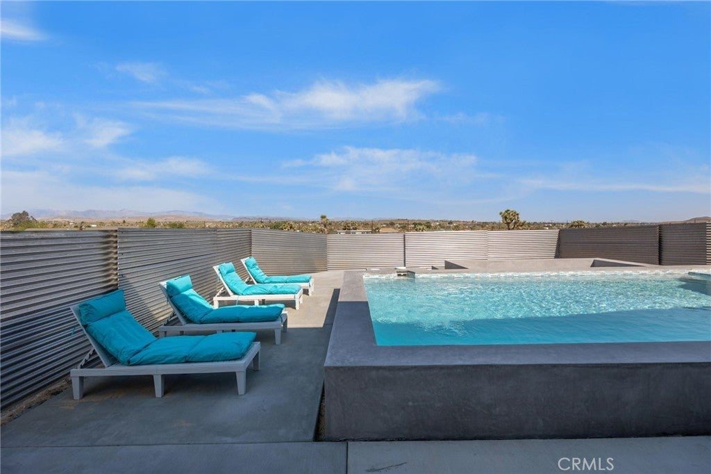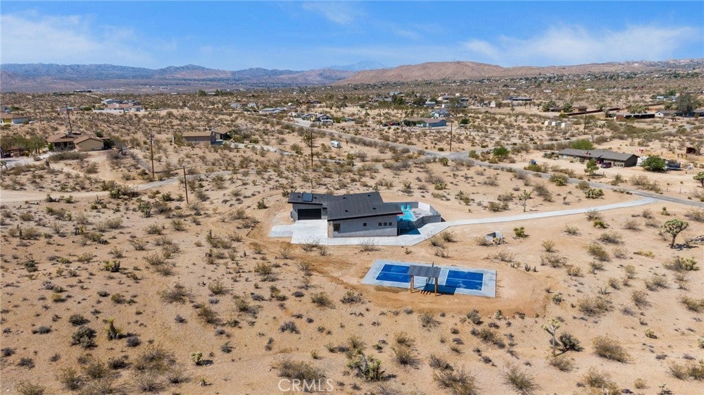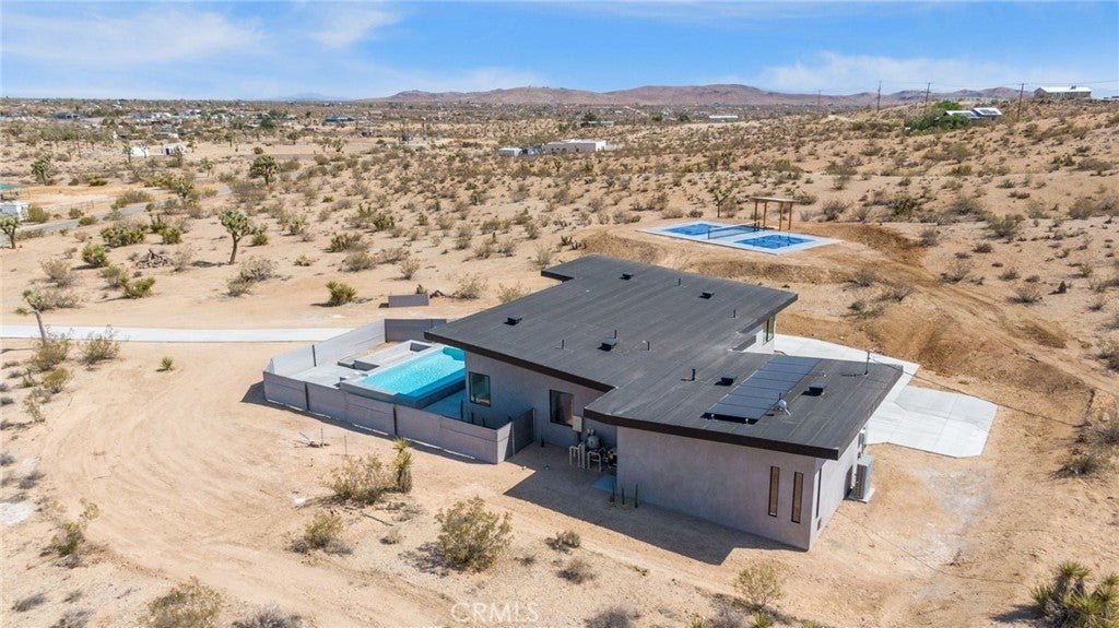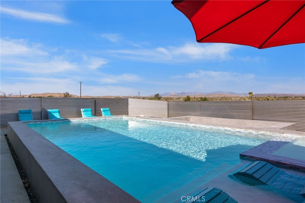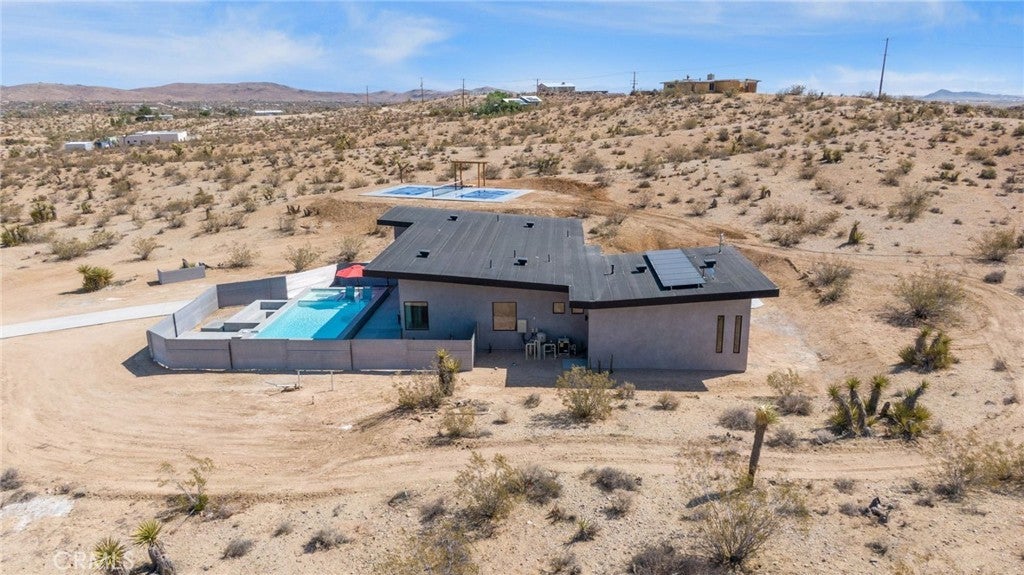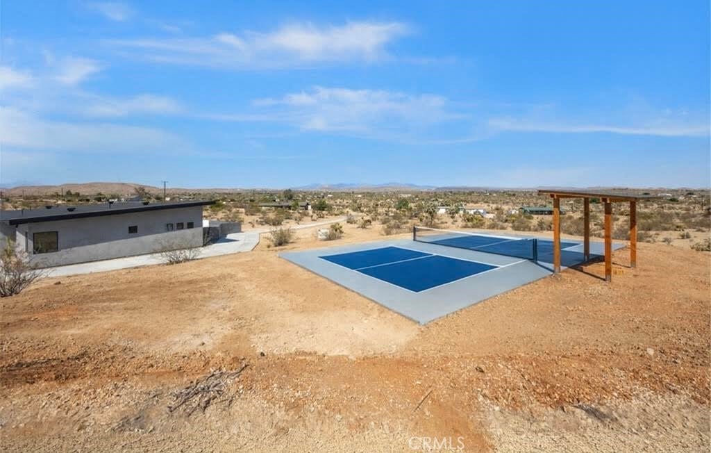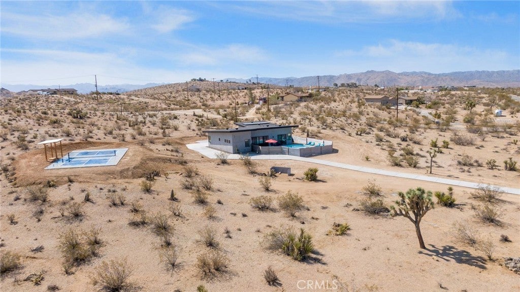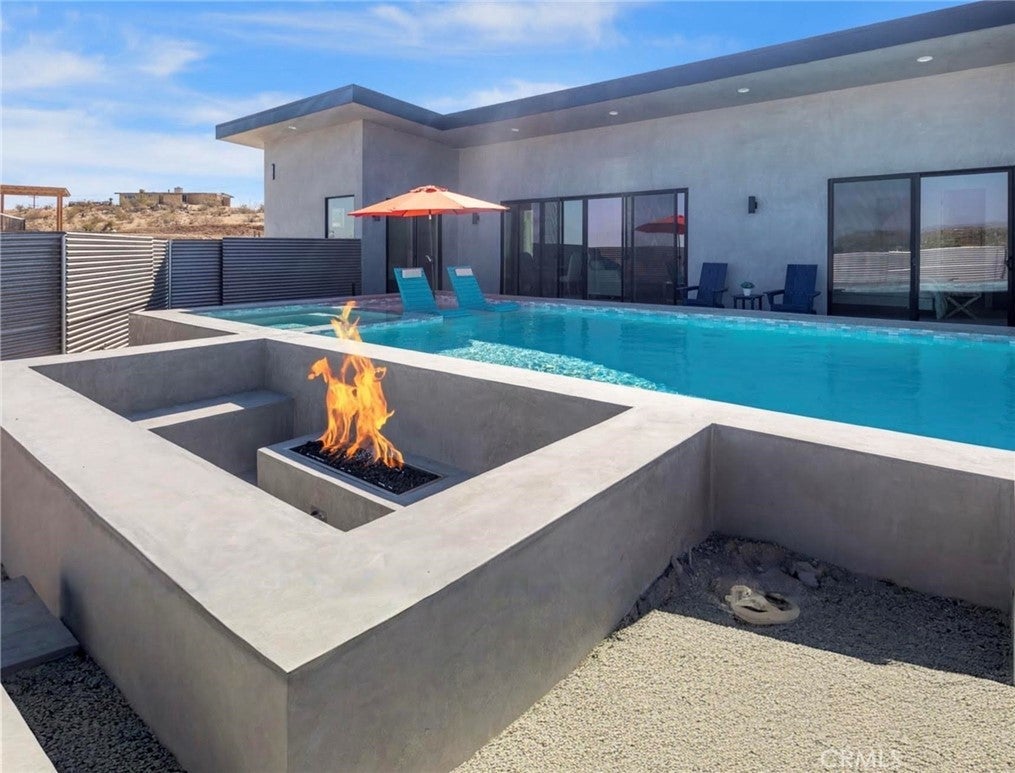 Luxury Desert Retreat with Pickleball Court, Pool & Spa, and Sunken Fire Pit: 3 Bedrooms 2 Bathrooms 2 Car Garage Fully Furnished. Experience the ultimate desert lifestyle in this brand-new modern home, perfectly designed for both relaxation and entertainment. Located in the highly sought-after Joshua Tree area, this property immediately impresses with its resort-style outdoor amenities—a private pickleball court, sparkling in-ground pool and spa, and an expansive sunken fire pit, all set against breathtaking desert and mountain views. Set on 2.09 private acres with convenient paved-road access via a concrete driveway, this custom-built residence combines contemporary architecture with desert serenity. The home was masterfully crafted by renowned local builder Darrell Danielson, who brings over 40 years of expertise to every detail. The striking butterfly roofline and walls of glass frame panoramic views of Pipe Canyon and the San Gorgonio Mountains. Inside, the open-concept great room features soaring ceilings, polished concrete floors, and a sleek linear electric fireplace. Oversized sliding glass doors connect indoor living with the dramatic outdoor landscape, creating seamless flow throughout. The chef’s kitchen is both functional and stylish, showcasing a quartz waterfall island, custom European-style cabinetry, premium appliances, and a wine fridge—ideal for entertaining or enjoying everyday meals in style. Retreat to the spa-inspired bathroom, designed with a soaking tub, walk-in shower, and rain showerhead for ultimate relaxation. Elevated finishes continue throughout with 8-foot doors, an oversized slider, and an insulated 8’ garage door. Energy efficiency is built into the home with high-efficiency AC and appliances, ensuring modern comfort in every season. Every feature of this property was thoughtfully chosen to enhance the desert lifestyle. Whether you’re enjoying a quiet evening by the fire pit, a friendly pickleball match, or a sunset swim, this home offers an unparalleled retreat. Perfect as a full-time residence, weekend getaway, or high-demand vacation rental, this is truly a one-of-a-kind opportunity to own modern luxury in Joshua Tree.