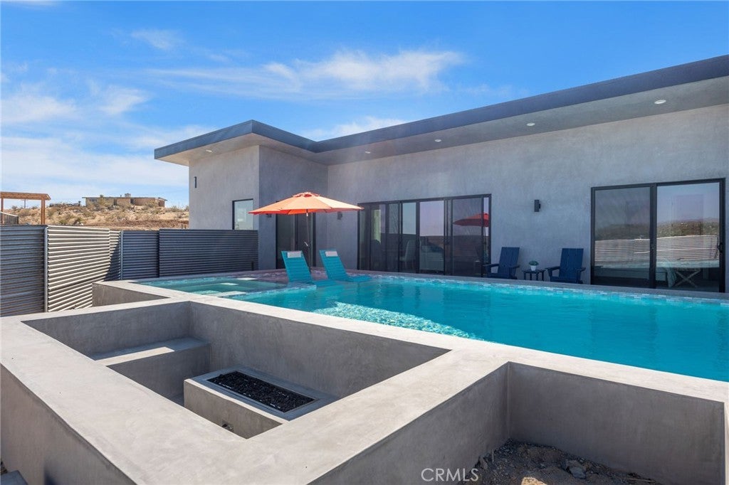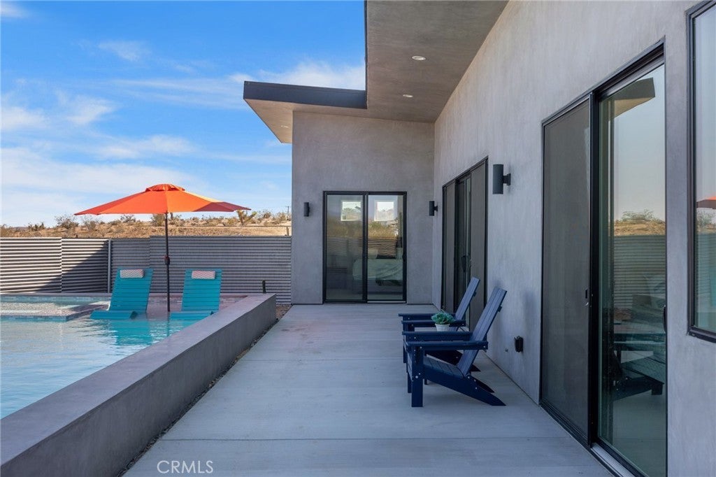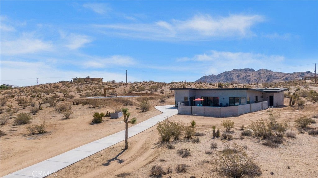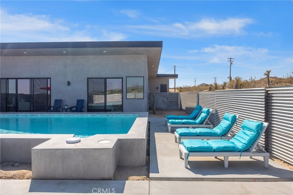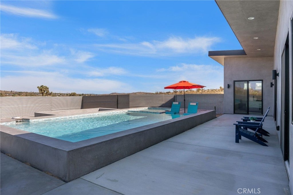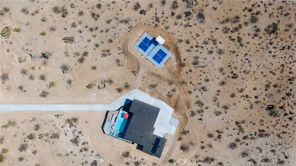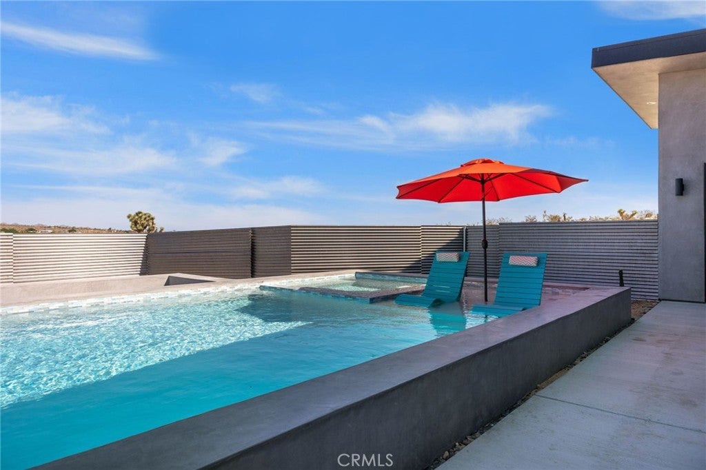 Luxury Desert Retreat with Pickleball Court, Pool & Spa, and Sunken Fire Pit: 3 Bedrooms 2 Bathrooms 2 Car Garage Fully Furnished. Experience the ultimate desert lifestyle in this brand-new modern home, perfectly designed for both relaxation and entertainment. Located in the highly sought-after Joshua Tree area, this property immediately impresses with its resort-style outdoor amenities—a private pickleball court, sparkling in-ground pool and spa, and an expansive sunken fire pit, all set against breathtaking desert and mountain views. Set on 2.09 private acres with convenient paved-road access via a concrete driveway, this custom-built residence combines contemporary architecture with desert serenity. The home was masterfully crafted by renowned local builder Darrell Danielson, who brings over 40 years of expertise to every detail. The striking butterfly roofline and walls of glass frame panoramic views of Pipe Canyon and the San Gorgonio Mountains. Inside, the open-concept great room features soaring ceilings, polished concrete floors, and a sleek linear electric fireplace. Oversized sliding glass doors connect indoor living with the dramatic outdoor landscape, creating seamless flow throughout. The chef’s kitchen is both functional and stylish, showcasing a quartz waterfall island, custom European-style cabinetry, premium appliances, and a wine fridge—ideal for entertaining or enjoying everyday meals in style. Retreat to the spa-inspired bathroom, designed with a soaking tub, walk-in shower, and rain showerhead for ultimate relaxation. Elevated finishes continue throughout with 8-foot doors, an oversized slider, and an insulated 8’ garage door. Energy efficiency is built into the home with high-efficiency AC and appliances, ensuring modern comfort in every season. Every feature of this property was thoughtfully chosen to enhance the desert lifestyle. Whether you’re enjoying a quiet evening by the fire pit, a friendly pickleball match, or a sunset swim, this home offers an unparalleled retreat. Perfect as a full-time residence, weekend getaway, or high-demand vacation rental, this is truly a one-of-a-kind opportunity to own modern luxury in Joshua Tree.