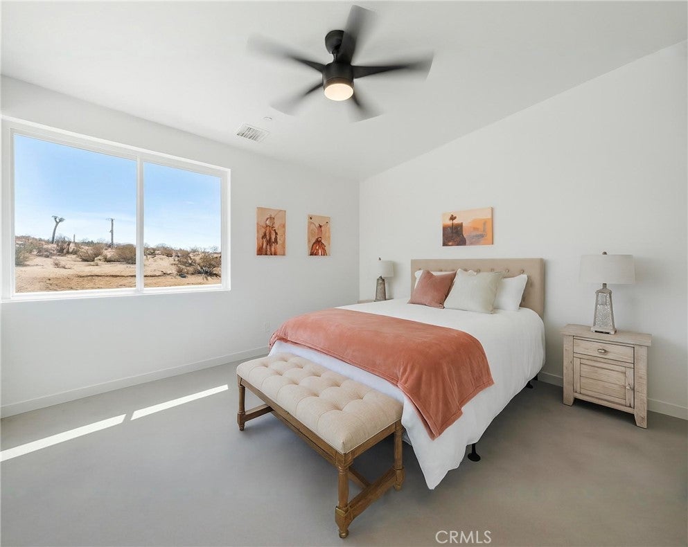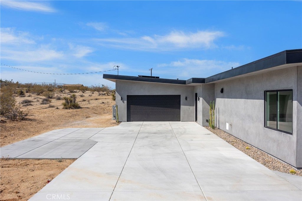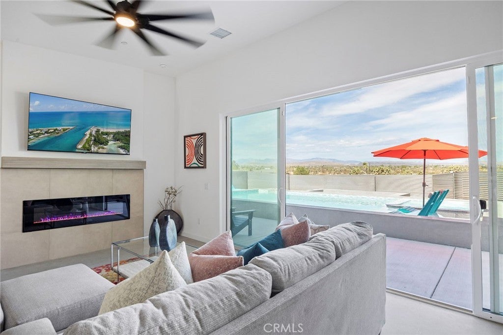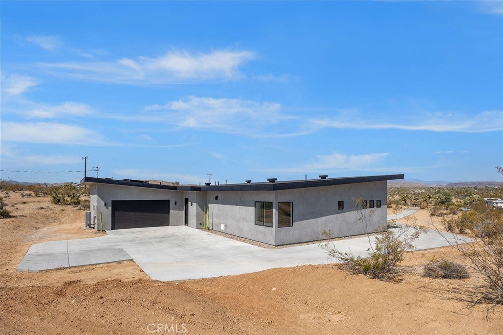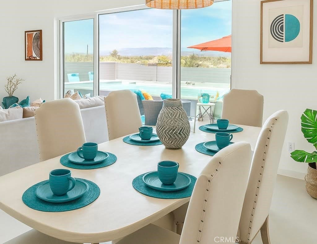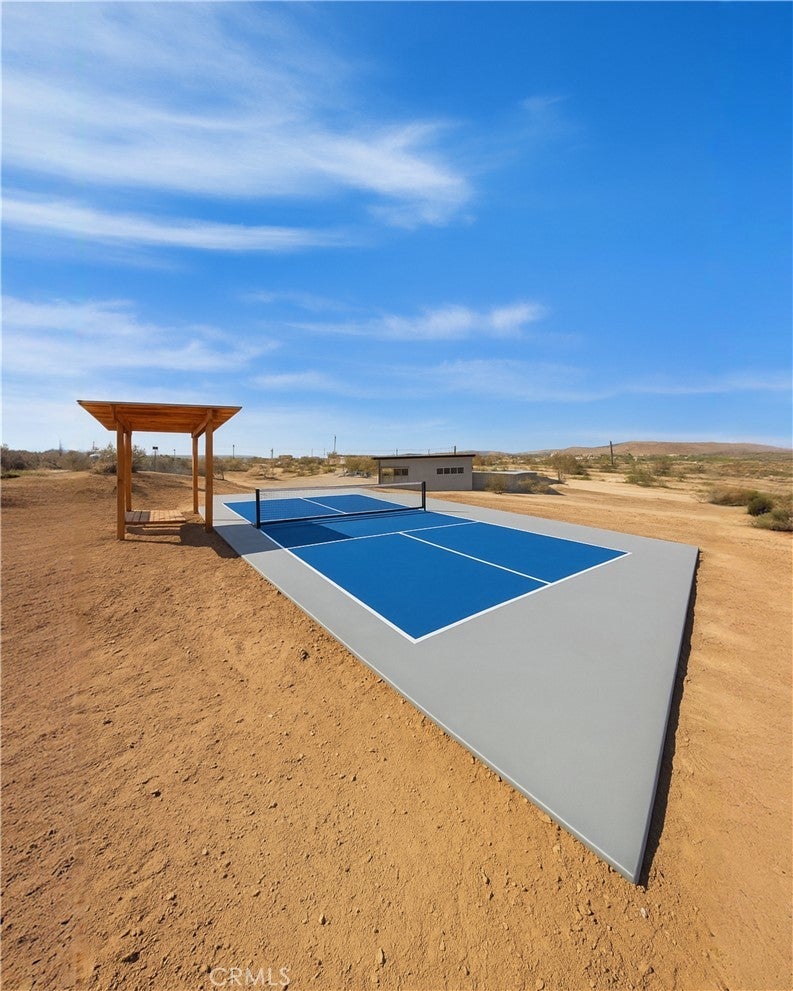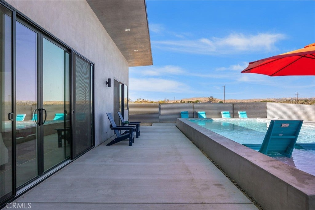 Luxury Desert Retreat with Pickleball Court, Pool & Spa, and Sunken Fire Pit: 3 Bedrooms 2 Bathrooms 2 Car Garage Fully Furnished. Experience the ultimate desert lifestyle in this brand-new modern home, perfectly designed for both relaxation and entertainment. Located in the highly sought-after Joshua Tree area, this property immediately impresses with its resort-style outdoor amenities—a private pickleball court, sparkling in-ground pool and spa, and an expansive sunken fire pit, all set against breathtaking desert and mountain views. Set on 2.09 private acres with convenient paved-road access via a concrete driveway, this custom-built residence combines contemporary architecture with desert serenity. The home was masterfully crafted by renowned local builder Darrell Danielson, who brings over 40 years of expertise to every detail. The striking butterfly roofline and walls of glass frame panoramic views of Pipe Canyon and the San Gorgonio Mountains. Inside, the open-concept great room features soaring ceilings, polished concrete floors, and a sleek linear electric fireplace. Oversized sliding glass doors connect indoor living with the dramatic outdoor landscape, creating seamless flow throughout. The chef’s kitchen is both functional and stylish, showcasing a quartz waterfall island, custom European-style cabinetry, premium appliances, and a wine fridge—ideal for entertaining or enjoying everyday meals in style. Retreat to the spa-inspired bathroom, designed with a soaking tub, walk-in shower, and rain showerhead for ultimate relaxation. Elevated finishes continue throughout with 8-foot doors, an oversized slider, and an insulated 8’ garage door. Energy efficiency is built into the home with high-efficiency AC and appliances, ensuring modern comfort in every season. Every feature of this property was thoughtfully chosen to enhance the desert lifestyle. Whether you’re enjoying a quiet evening by the fire pit, a friendly pickleball match, or a sunset swim, this home offers an unparalleled retreat. Perfect as a full-time residence, weekend getaway, or high-demand vacation rental, this is truly a one-of-a-kind opportunity to own modern luxury in Joshua Tree.
