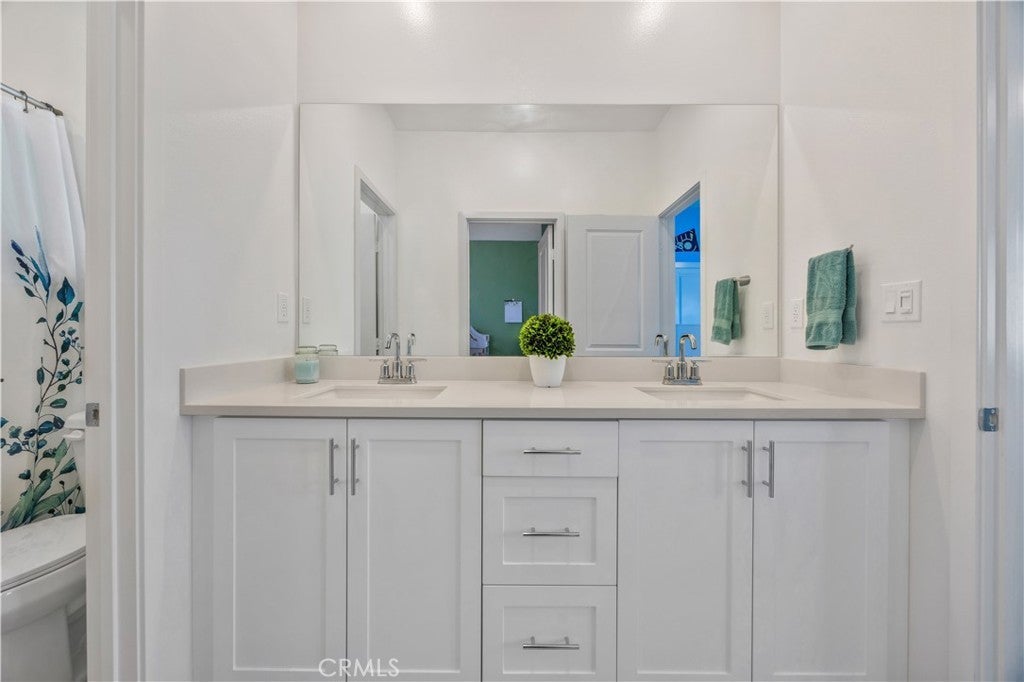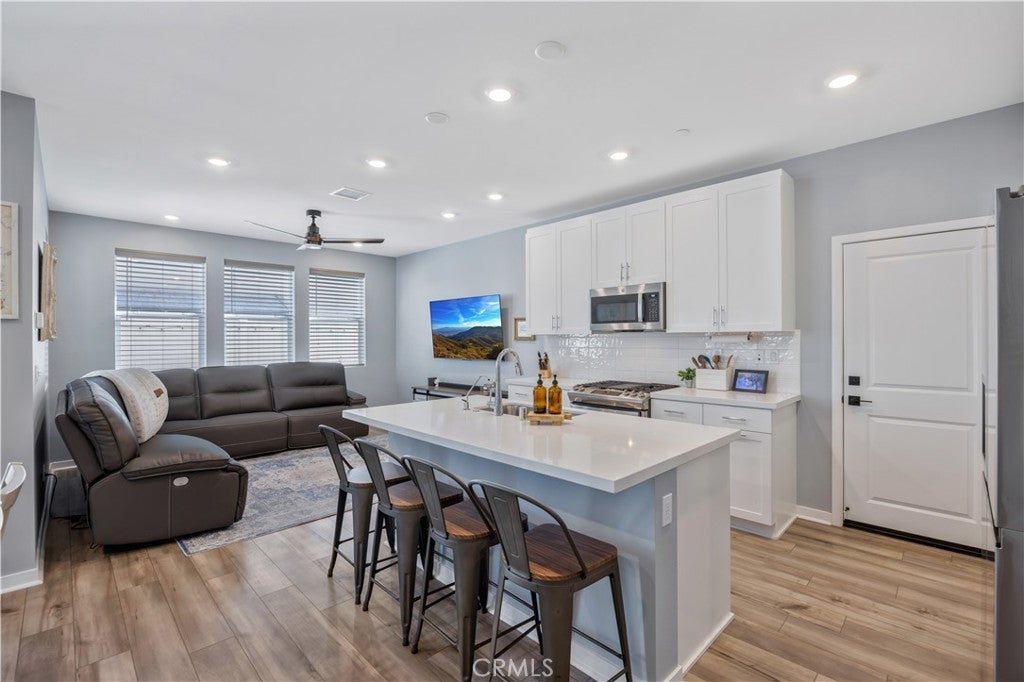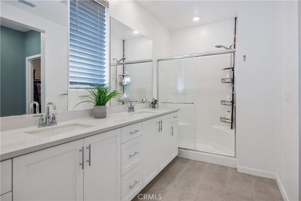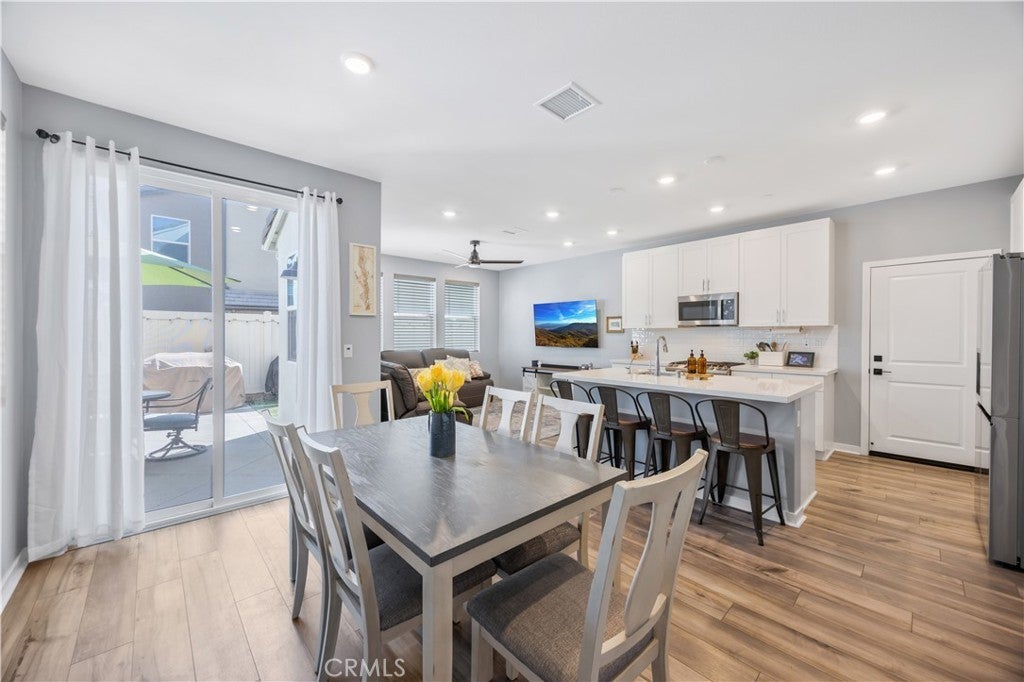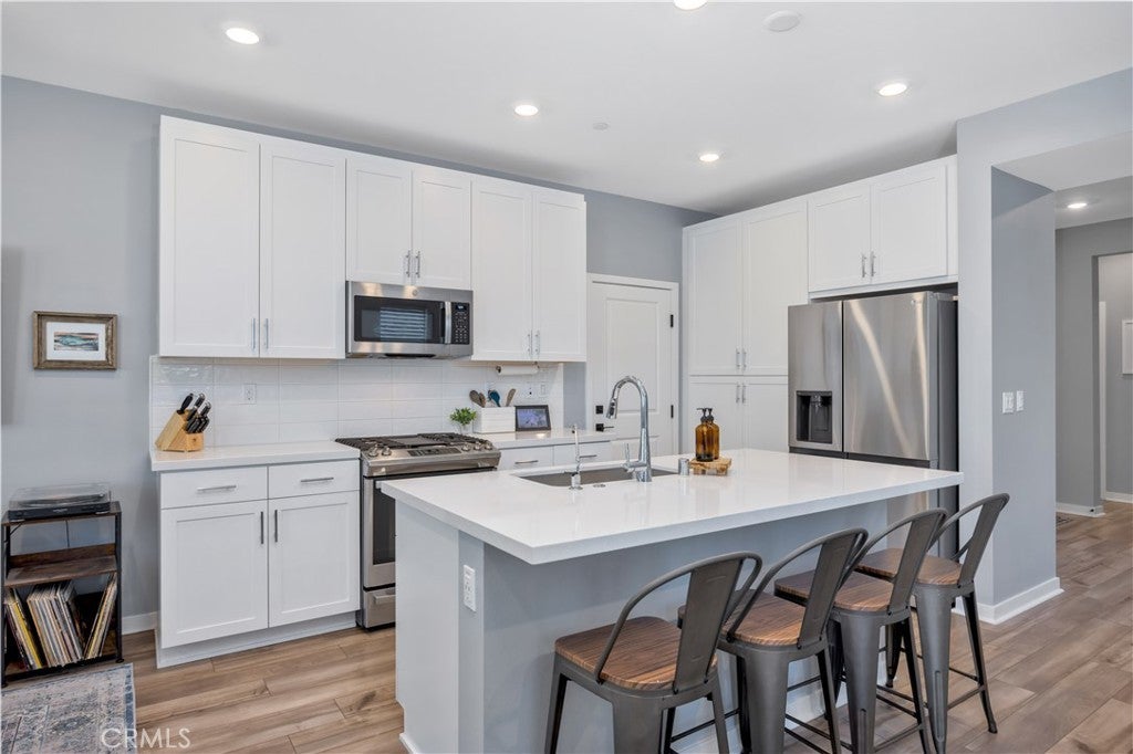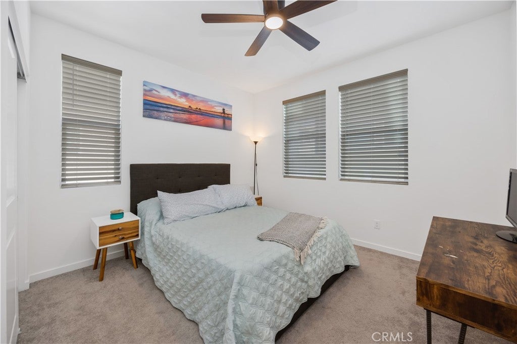 TURNKEY MODERN FARMHOUSE STYLE | 4 BED + LOFT | DOWNSTAIRS BED + BATHROOM | LOW-MAINTENANCE BACKYARD Located in the highly desirable Bedford community of Corona, this gorgeous original-owner home offers understated luxury throughout. The bright and open floor plan begins with a spacious foyer. The gourmet kitchen features a large center island with an abundance of counter space, quartz countertops, subway tile backsplash, white shaker style cabinets, GE stainless steel appliances and farmhouse sink. The open living and dining areas are perfect for entertaining, with a custom built-in sideboard for extra counter space, luxury vinyl plank flooring, recessed lighting and high ceilings. The main floor also features a private bedroom and bathroom, perfect for guests. The large primary suite features high ceilings, custom window shades, ceiling fan, walk-in closet, large bath with a dual sink vanity, shower and separate water closet. A large upstairs loft offers plenty of additional living space. Two additional bedrooms share a large full bath with dual sink vanity and a private tub/shower area. Also upstairs you'll find a separate laundry room offering side-by-side laundry and storage shelf. Additional highlights include a 2-car garage with epoxy floors, dual zone central air/heating, and energy-efficient features such as an owned 10 panel 4.05 KW solar system with 26kWh of battery backup, tankless water heater and reverse osmosis water filtration system. Enjoy access to all the Bedford community resort-style amenities, including; three pools and spa, clubhouses, gym, dog park, walking trails, fire pits, indoor/outdoor entertaining and kitchens, sports courts, and more! Centrally located near top-rated schools, parks, recreation, shopping, dining, and easy access to the 91fwy, 15fwy, and toll roads. This is more than a home, it’s a lifestyle.