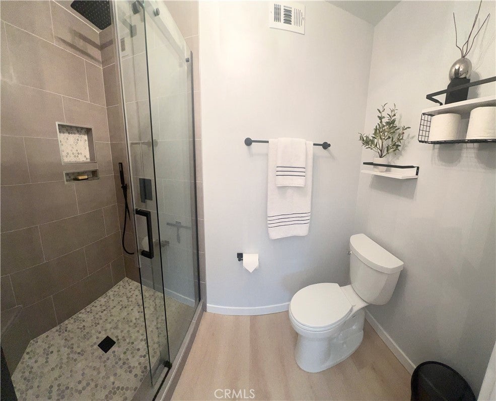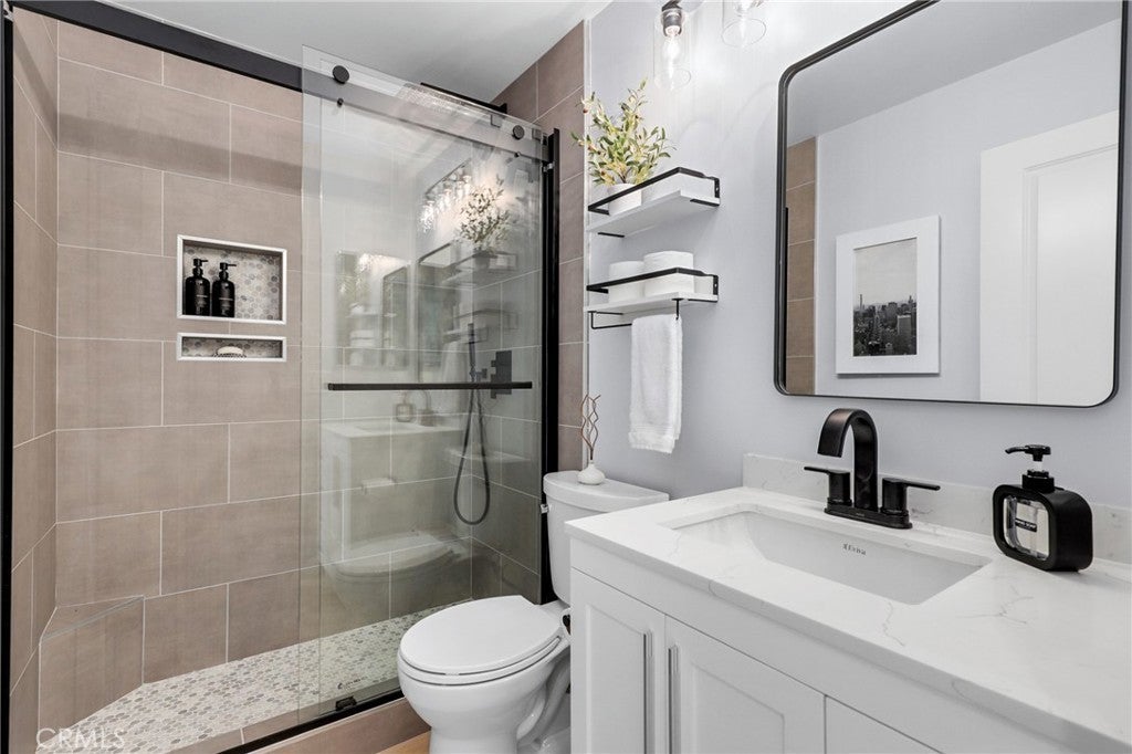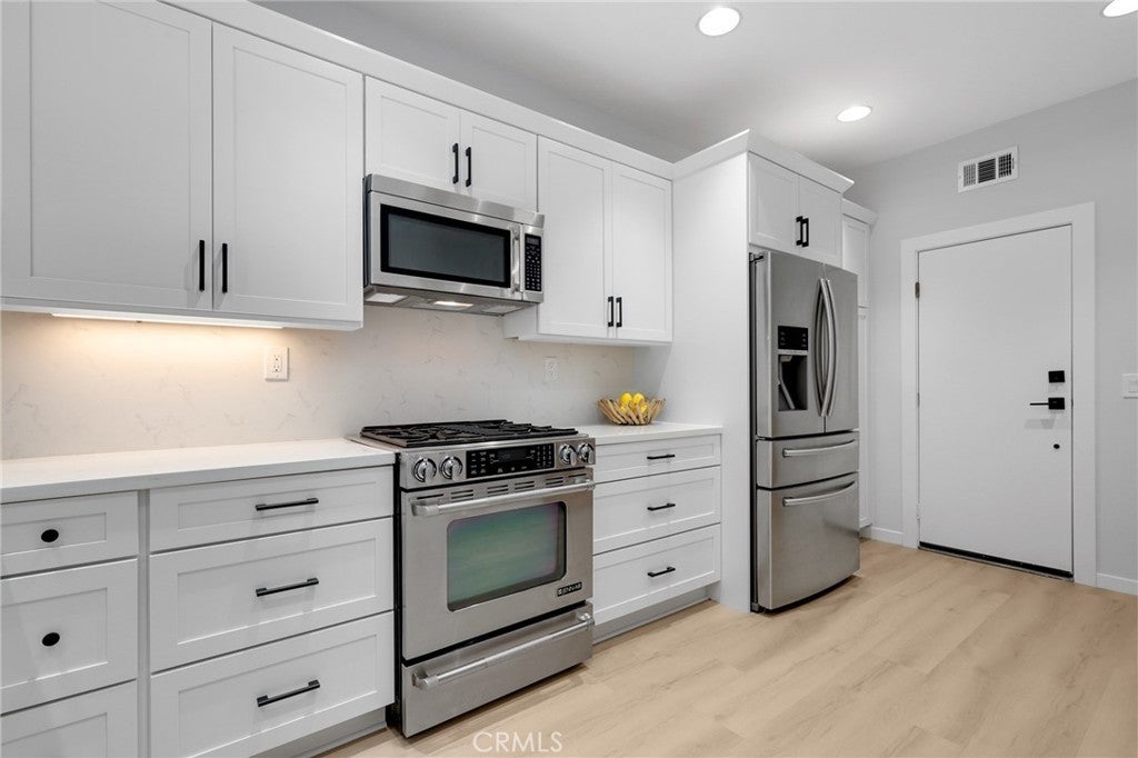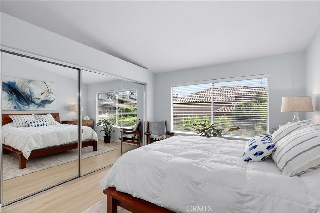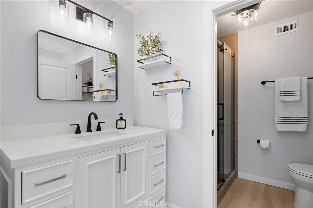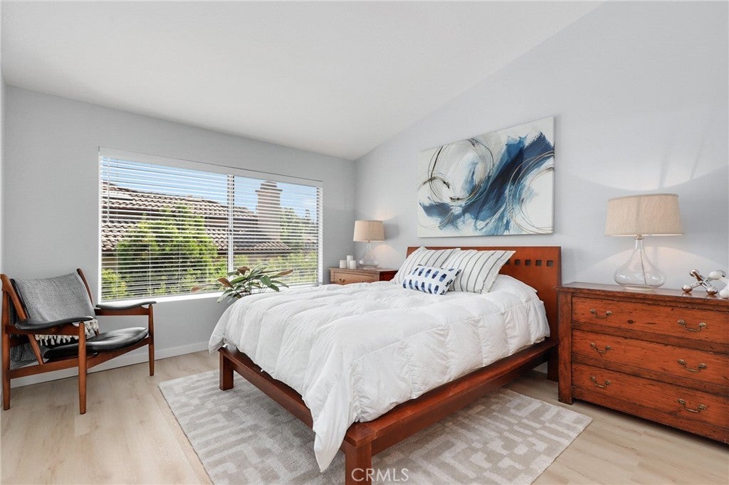 Welcome to 60 Meadowbrook, an immaculate home in the heart of Aliso Viejo. The inviting family room features a stylish accent wall and cozy fireplace, seamlessly opening to the dining area and kitchen. The kitchen boasts white cabinetry, quartz countertops with matching backsplash, stainless steel appliances, and direct access to the two-car attached garage with an extended driveway for extra parking. Sliding glass doors lead to a spacious and private backyard with low-maintenance artificial grass, perfect for entertaining or relaxing. A beautifully remodeled powder room completes the main level. Upstairs, the primary suite offers vaulted ceilings and a remodeled ensuite bathroom with a quartz vanity and walk-in shower. Two additional bedrooms share a remodeled full hall bathroom. Centrally located near Aliso Viejo Town Center, the 73 Toll Road, scenic trails, award-winning schools, and just a short drive to the beach—this home truly has it all!