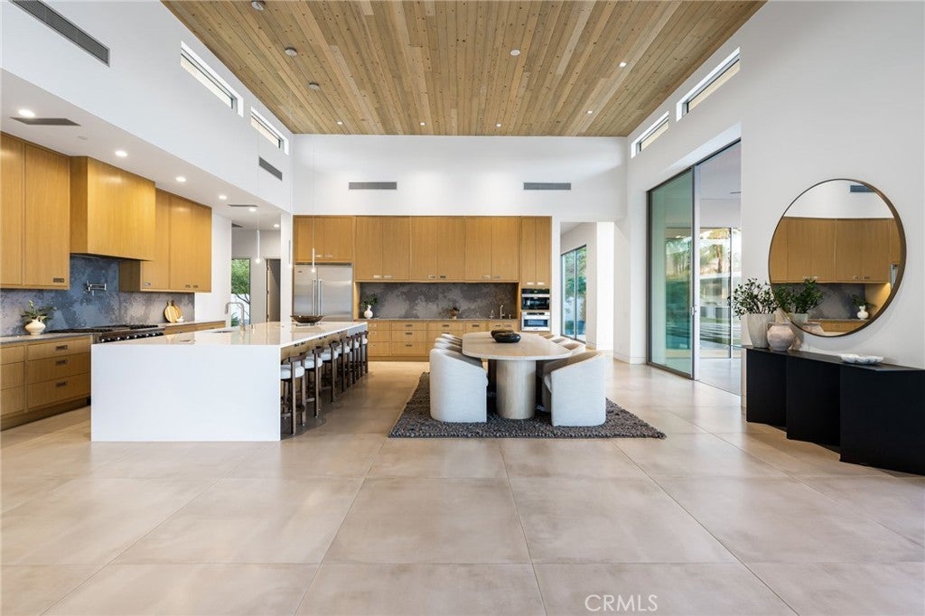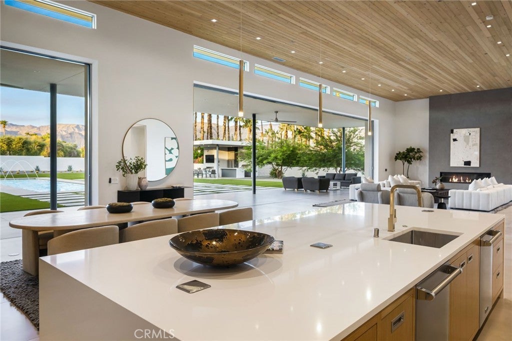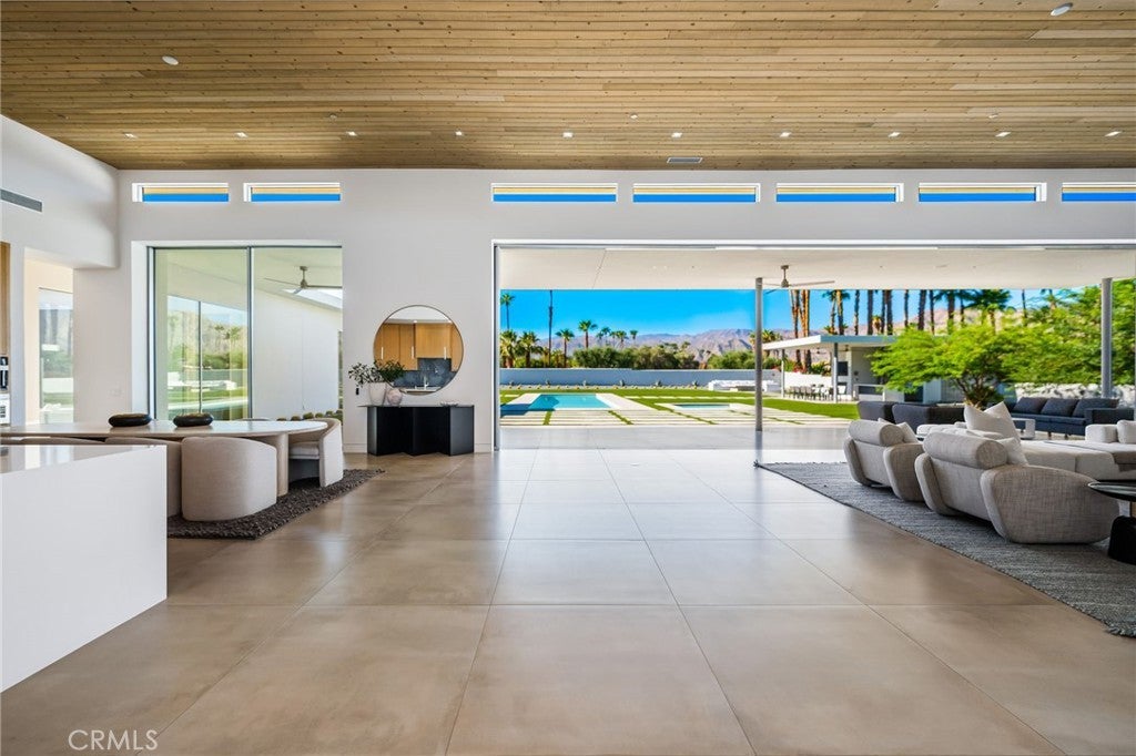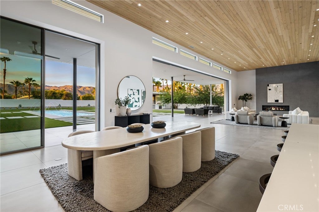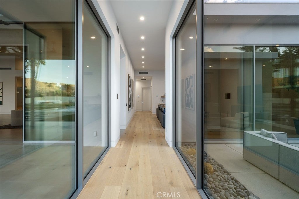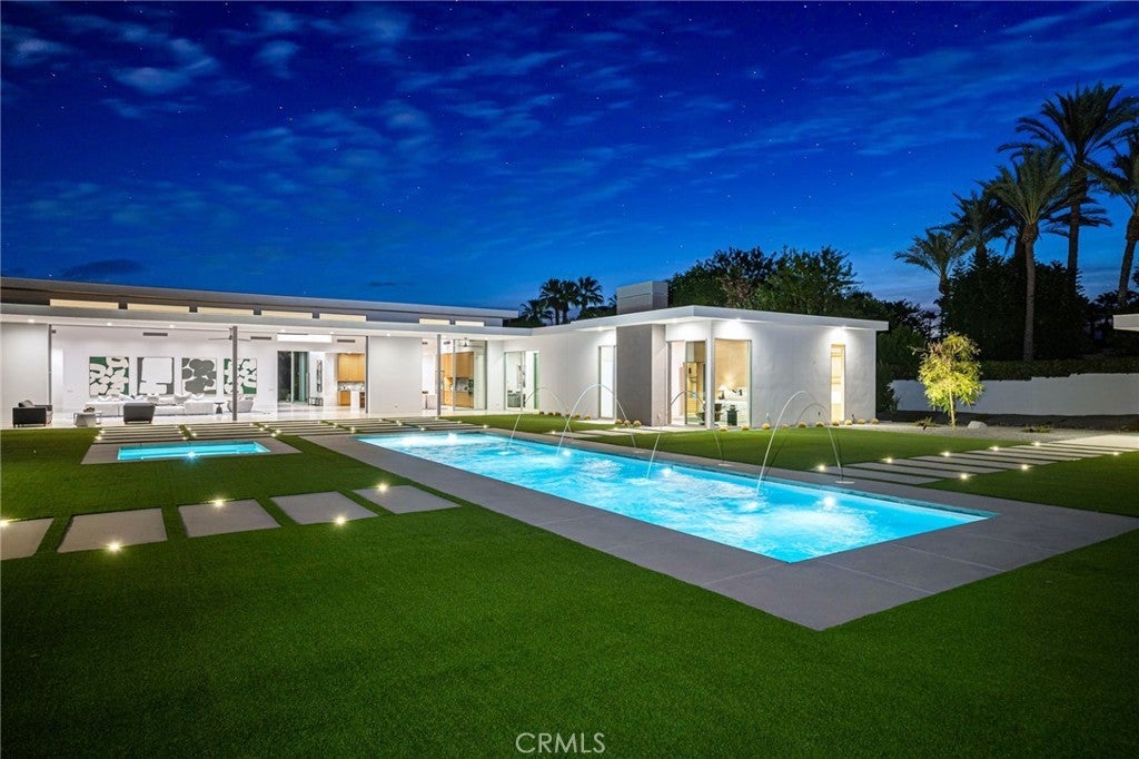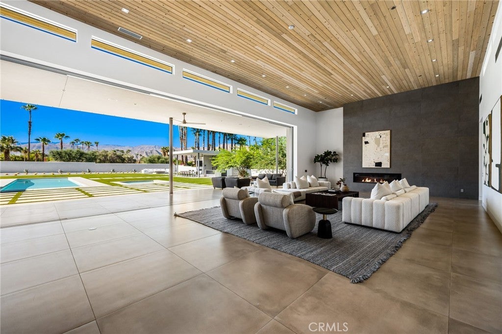 Set on a private 1-acre estate with south facing panoramic mountain views, new custom built 6,752 square foot residence blends luxury and mid-century with today’s most advanced technology and finishes. Enclosed behind 6-foot block walls and a wired security system, this property offers unmatched privacy. Entering through a 7ft wide 12ft tall custom pivot glass door, the great room opens to the outdoors with 40’ x 12’ automated pocketing glass walls, creating a seamless flow between living, dining, and entertaining. The chef’s kitchen is anchored by a 6.5 x 13 foot waterfall quartz island with seating for eight, dual dishwashers, commercial-grade Viking appliances, a custom vent hood, built-in espresso machine, and beverage station. Custom rift-sawn white oak cabinetry, imported Italian porcelain tile, and custom wide plank white oak engineered flooring elevate every detail. The main residence features 6,072 square feet, 5 bedrooms, 5 bathrooms, a formal powder room, temperature controlled wine cellar, including a primary suite with a private fireplace, floating dual vanities, Toto Neorest bidet, wet bar with wine fridge and its own climate zone and water heating system for ultimate comfort. A flexible bonus room offers endless possibilities—gym, office, or theater. The family room is designed for effortless entertaining, featuring a wet bar with dual refrigerators. The space has integrated surround sound. Extending the experience outdoors, the property is equipped with a whole-estate speaker system, including hidden speakers throughout the landscaping for seamless indoor-outdoor living. The spacious laundry room leads to the 4 car temperature controlled garage with epoxy flooring. Outdoors, a 500 sq. ft. entertainer’s cabana rivals any luxury resort with a full Viking kitchen, 36” barbecue with rotisserie, refrigerator, dishwasher, fireplace, TV, misting system, and full bath with outdoor shower. Entertain at the sparkling 60 foot pool with fountains, an app-controlled fire pit, and outdoor lounge areas complete the space. For guests, a detached 680 square foot casita provides a private oasis with a living area, bedroom, full bathroom, two high powered Mitsubishi AC units, kitchenette, and laundry. Every system in the home is designed for luxury: 5 Wi-Fi controlled HVAC zones, commercial-grade insulation, variable-zone cooling, tankless water heaters, concealed owned solar, custom lighting, surround sound, and whole-property misting and music systems.
