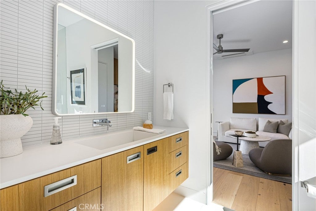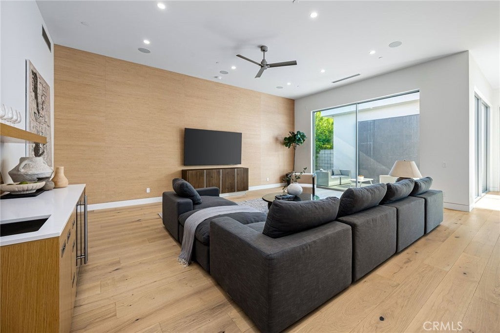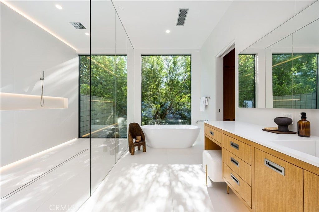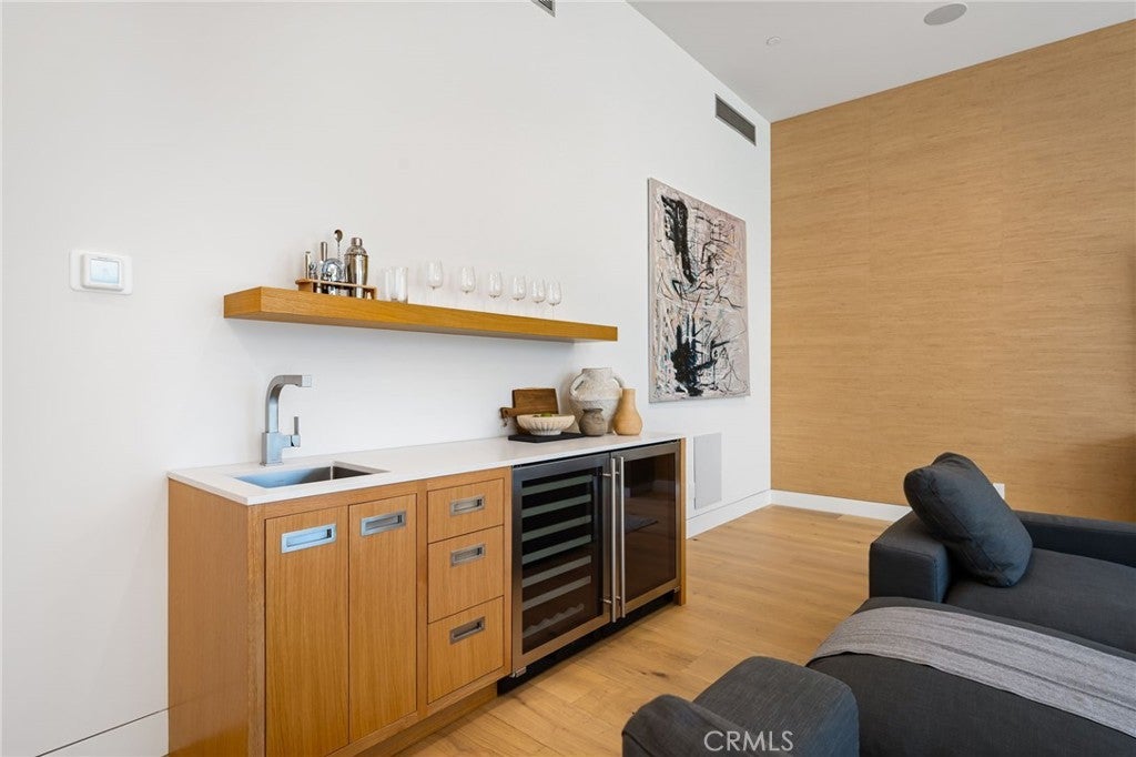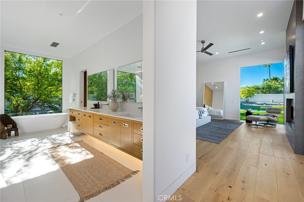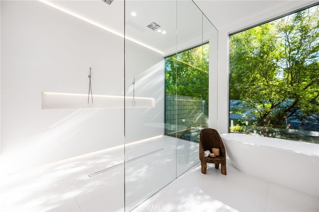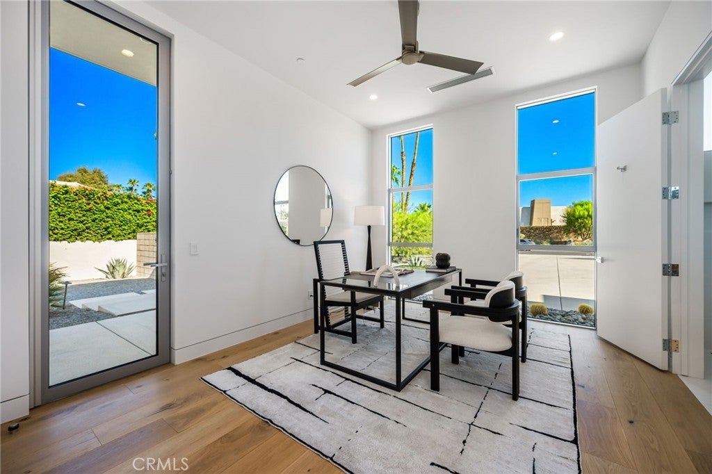 Set on a private 1-acre estate with south facing panoramic mountain views, new custom built 6,752 square foot residence blends luxury and mid-century with today’s most advanced technology and finishes. Enclosed behind 6-foot block walls and a wired security system, this property offers unmatched privacy. Entering through a 7ft wide 12ft tall custom pivot glass door, the great room opens to the outdoors with 40’ x 12’ automated pocketing glass walls, creating a seamless flow between living, dining, and entertaining. The chef’s kitchen is anchored by a 6.5 x 13 foot waterfall quartz island with seating for eight, dual dishwashers, commercial-grade Viking appliances, a custom vent hood, built-in espresso machine, and beverage station. Custom rift-sawn white oak cabinetry, imported Italian porcelain tile, and custom wide plank white oak engineered flooring elevate every detail. The main residence features 6,072 square feet, 5 bedrooms, 5 bathrooms, a formal powder room, temperature controlled wine cellar, including a primary suite with a private fireplace, floating dual vanities, Toto Neorest bidet, wet bar with wine fridge and its own climate zone and water heating system for ultimate comfort. A flexible bonus room offers endless possibilities—gym, office, or theater. The family room is designed for effortless entertaining, featuring a wet bar with dual refrigerators. The space has integrated surround sound. Extending the experience outdoors, the property is equipped with a whole-estate speaker system, including hidden speakers throughout the landscaping for seamless indoor-outdoor living. The spacious laundry room leads to the 4 car temperature controlled garage with epoxy flooring. Outdoors, a 500 sq. ft. entertainer’s cabana rivals any luxury resort with a full Viking kitchen, 36” barbecue with rotisserie, refrigerator, dishwasher, fireplace, TV, misting system, and full bath with outdoor shower. Entertain at the sparkling 60 foot pool with fountains, an app-controlled fire pit, and outdoor lounge areas complete the space. For guests, a detached 680 square foot casita provides a private oasis with a living area, bedroom, full bathroom, two high powered Mitsubishi AC units, kitchenette, and laundry. Every system in the home is designed for luxury: 5 Wi-Fi controlled HVAC zones, commercial-grade insulation, variable-zone cooling, tankless water heaters, concealed owned solar, custom lighting, surround sound, and whole-property misting and music systems.