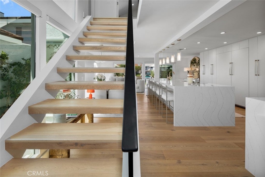 Set along a calm lakeside, this home stands as one of the community’s most refined and thoughtfully curated residences. More than a house, it is an expression of considered design, where craftsmanship, natural textures, and light create an environment that feels both timeless and deeply personal. From the moment you step inside, the architecture speaks in a language of warmth and restraint. Wide-plank oak floors carry through the open plan, their grain grounding the interiors with a tactile sense of permanence. Wall paneling and clean-lined millwork frame the living spaces, while a sculptural staircase becomes an architectural gesture in its own right, bridging levels while maintaining a feeling of openness. At the heart of the home, the kitchen embodies a balance of beauty and function. Cambria counters stretch across generous surfaces, their subtle veining a reminder of the stone’s natural origin. Gaggenau appliances and a built-in Dacor refrigerator and freezer are integrated with quiet precision, giving the space a professional edge while preserving a sense of calm. Here, cooking becomes less about utility and more about ritual, an experience shared with family and friends gathered across the long island and adjacent living spaces. Beyond the everyday rhythms, the home offers places of retreat and renewal. A dedicated movie room provides space for intimate evenings, while the upper-level rooms open out toward water views that shift in tone and reflection with the passing hours of the day. Every element has been upgraded with care: a new AC system ensures year-round comfort, the piping and electrical panel have been fully replaced, and the details both visible and unseen contribute to a sense of lasting quality. Outside, the home opens seamlessly to the water. A fire feature stretches the length of the patio, creating a gathering place where evenings are extended and conversation lingers under the palms. The seating areas, softened by lush planters and natural textures, face the lake where the horizon glows at dusk across the water's mirrored reflections. This is not simply a residence on the Keys, it is a home designed for living well. Thoughtful in detail, natural in palette, and effortless in its connection to the water, it is a rare offering that unites architecture, landscape, and lifestyle in a way that feels enduring and true.
