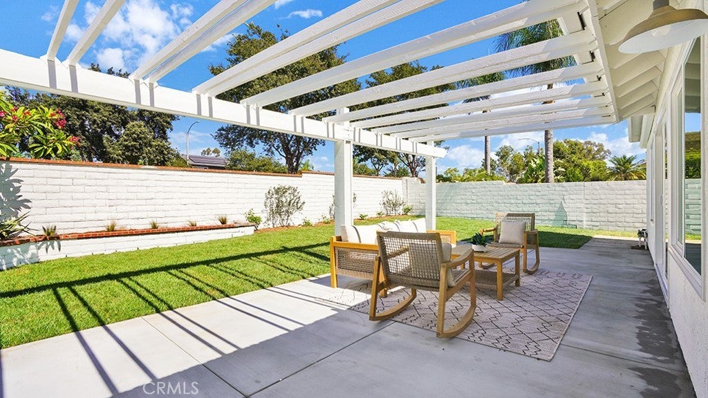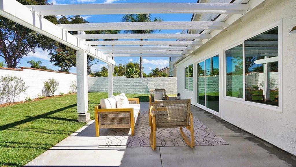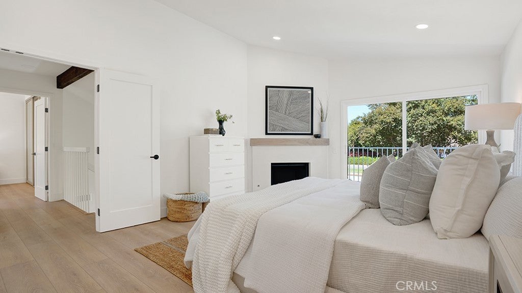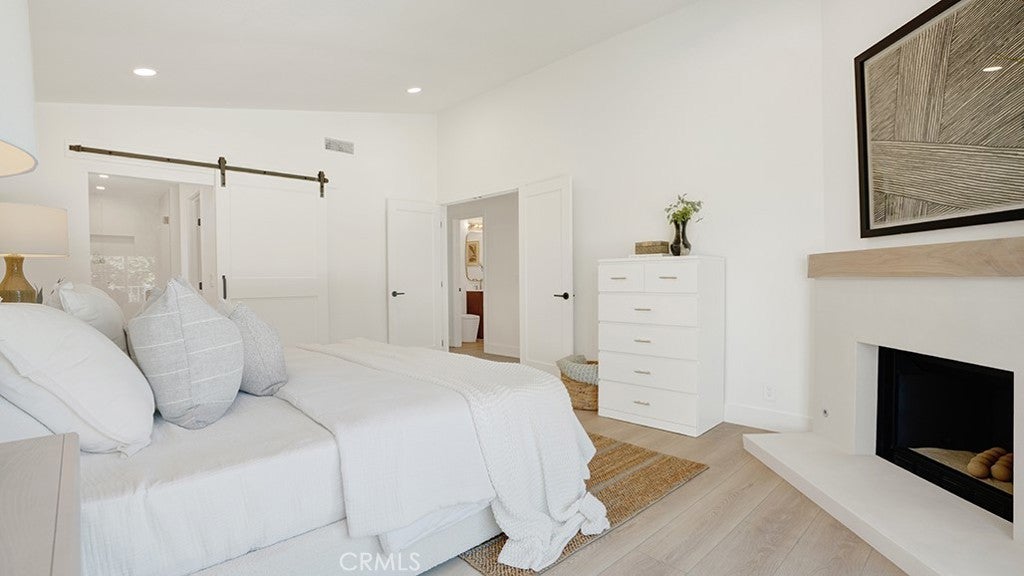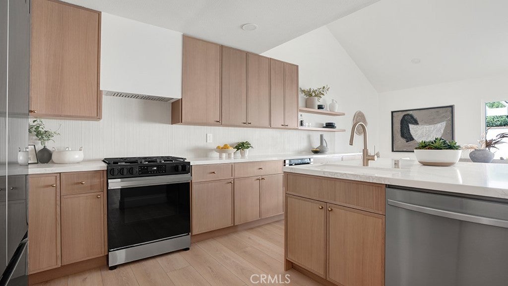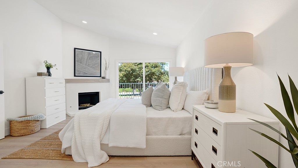 Welcome to a thoughtfully reimagined Irvine home framed by lush new landscaping and an inviting courtyard. Step inside to white-oak luxury vinyl plank flooring, LED recessed lighting, new baseboards and casings throughout. The heart of the home is a warm, plaster-finished wood-burning fireplace that anchors the open living space. A designer kitchen showcases slim oak-shaker cabinetry, quartz countertops, a tile backsplash, quartz sink, champagne-bronze fixtures, and a suite of new appliances including a bespoke range, dishwasher, and over-the-range microwave. Dual-pane windows and new sliding doors invite easy indoor-outdoor living to a fully refreshed backyard with new concrete patio and vinyl fencing—perfect for gatherings. Guest bedrooms feature upgraded lighting and closet systems; the hall bath includes an oversized soaking tub and tiled shower niche. The spacious primary suite adds a double vanity, designer tile, and crystal-clear Starphire shower glass for a spa-like feel. Modern touches include matte-black hardware with solid-core doors, new outlets/switches, a smart thermostat with tuned-up HVAC, epoxy-finished garage with new door motor/keypad, and a 200-amp electrical panel. Turnkey and move-in ready.