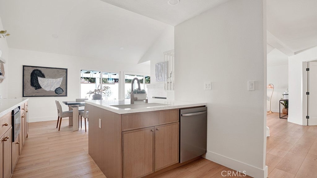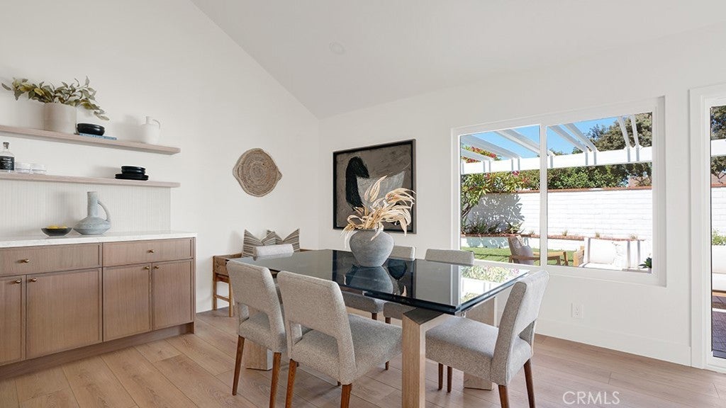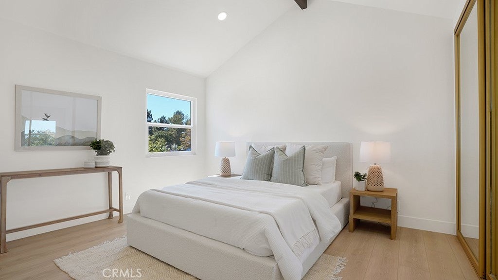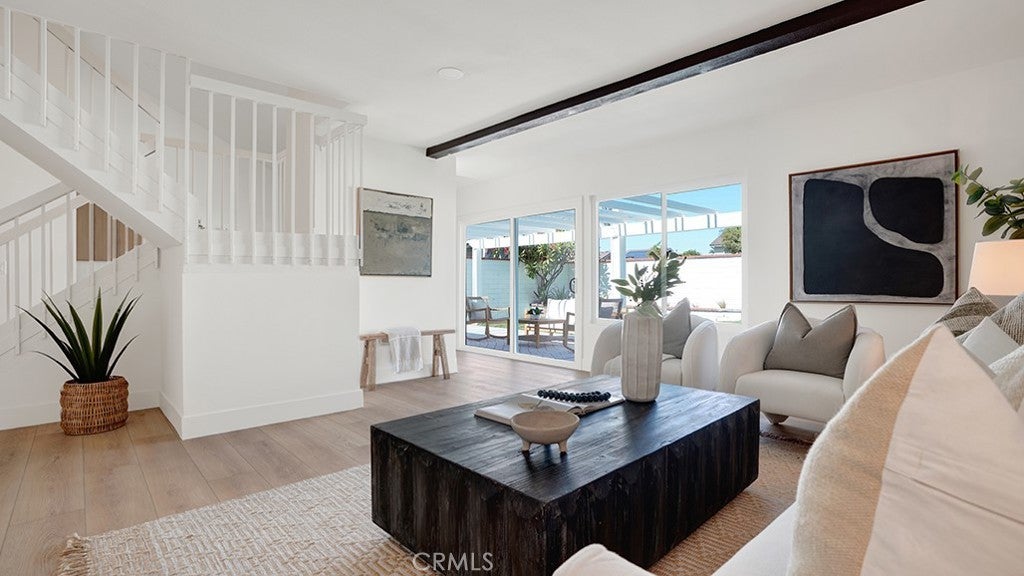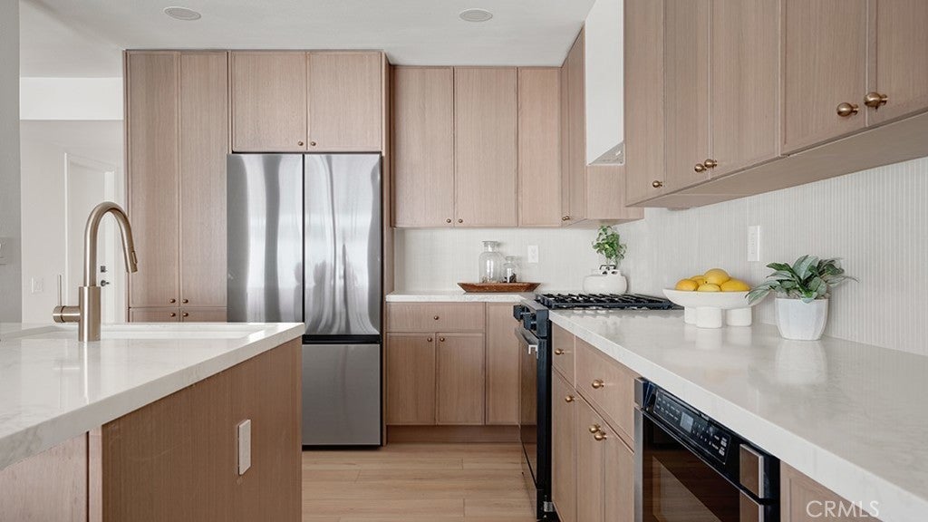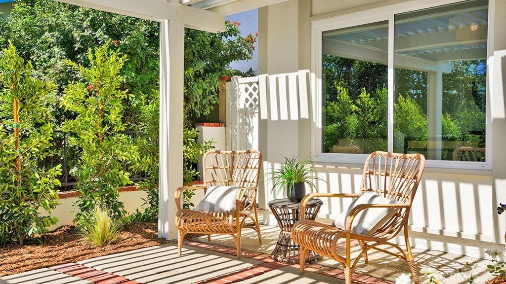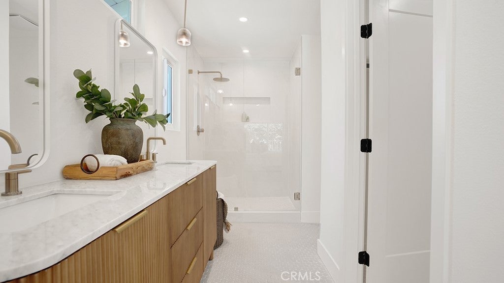Welcome to a thoughtfully reimagined Irvine home framed by lush new landscaping and an inviting courtyard. Step inside to white-oak luxury vinyl plank flooring, LED recessed lighting, new baseboards and casings throughout. The heart of the home is a warm, plaster-finished wood-burning fireplace that anchors the open living space. A designer kitchen showcases slim oak-shaker cabinetry, quartz countertops, a tile backsplash, quartz sink, champagne-bronze fixtures, and a suite of new appliances including a bespoke range, dishwasher, and over-the-range microwave. Dual-pane windows and new sliding doors invite easy indoor-outdoor living to a fully refreshed backyard with new concrete patio and vinyl fencing—perfect for gatherings. Guest bedrooms feature upgraded lighting and closet systems; the hall bath includes an oversized soaking tub and tiled shower niche. The spacious primary suite adds a double vanity, designer tile, and crystal-clear Starphire shower glass for a spa-like feel. Modern touches include matte-black hardware with solid-core doors, new outlets/switches, a smart thermostat with tuned-up HVAC, epoxy-finished garage with new door motor/keypad, and a 200-amp electrical panel. Turnkey and move-in ready.