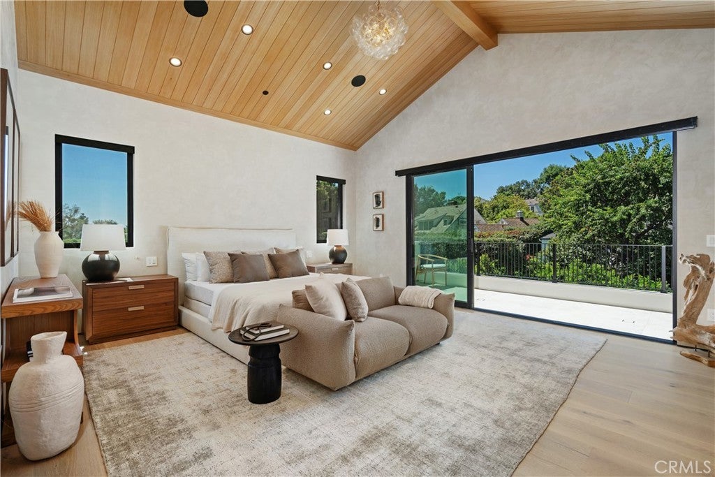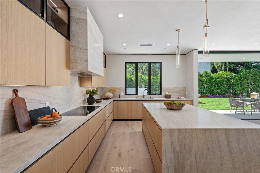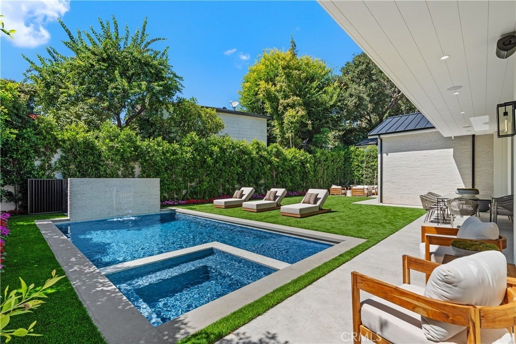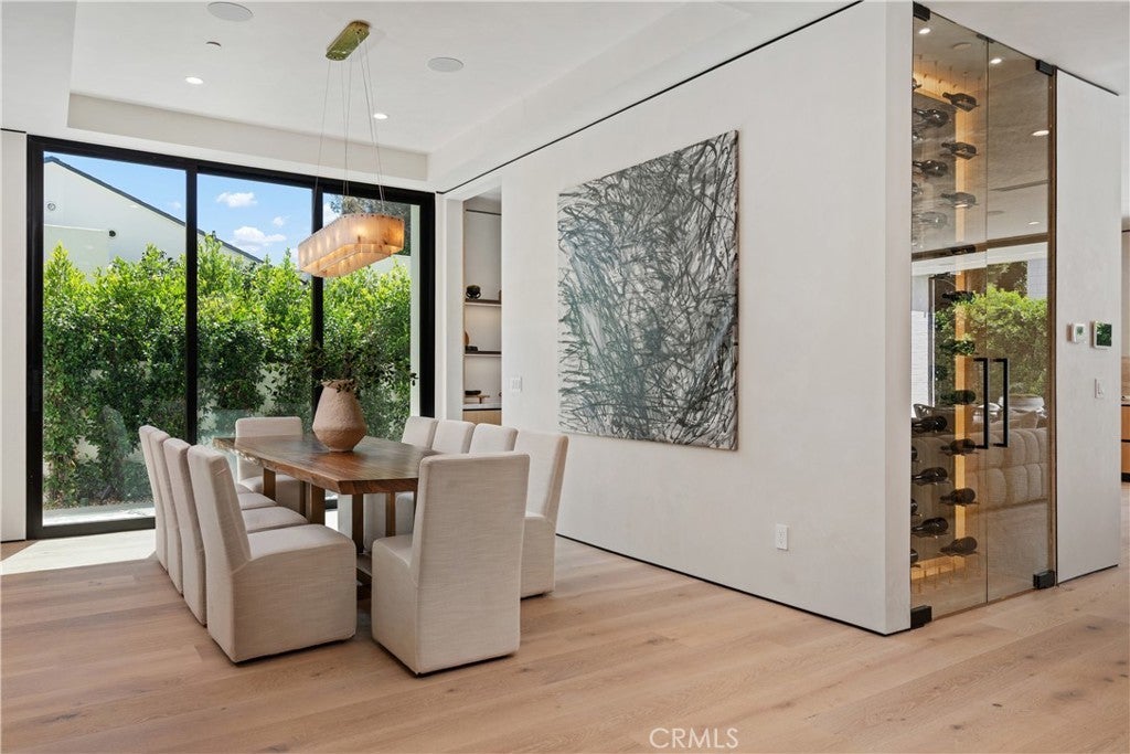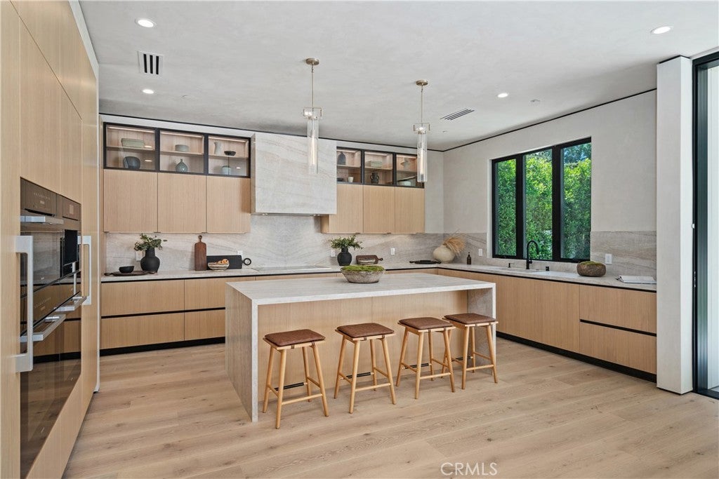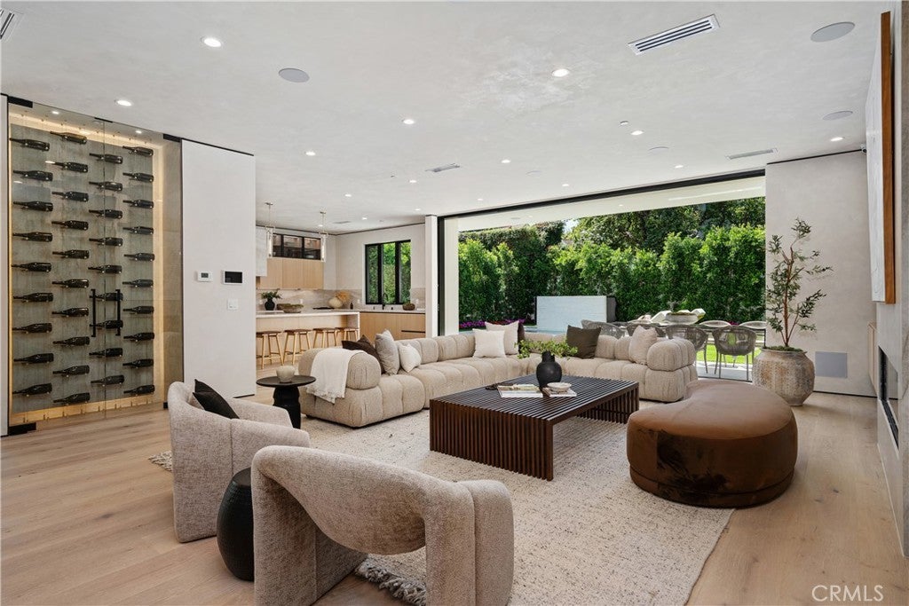 Step into a world of refined luxury and warmth in this stunning new construction just blocks from Bel Air. This 5-bedroom, 5-bathroom smart home, complete with a private theater, dedicated office, and a floor-to-ceiling glass wine room, blends modern sophistication with timeless comfort designed for grand entertaining and intimate family living. From the moment you enter, you’re greeted by soaring ceilings, oak doors, and natural light pouring through expansive windows and sliding bi-fold doors, creating seamless indoor-outdoor flow. Two distinct living rooms offer versatility: a formal space for elegant gatherings and a casual area that opens to the backyard. At the heart of the home is a chef’s kitchen featuring Miele appliances, double ovens, a built-in espresso machine, and a walk-in pantry. Just off the main living area, the glass wine room serves as a dramatic focal point. The primary suite is a sanctuary with oak ceilings, a custom walk-in closet, and a spa-like bathroom with a two-person shower, soaking tub, dual vanities, and private balcony overlooking the lush backyard. Downstairs includes a guest suite with en-suite bath, dedicated office, and private theater room. Upstairs, four bedrooms provide ample space for family or guests. The entertainer’s backyard boasts a waterfall pool, jacuzzi, fire pit lounge, guest-accessible outdoor bath, and pocket doors t hat invite the outdoors in. This fully wired smart home features integrated media/sound system, underground electrical, and touch-screen controls throughout. Every detail is curated for comfort, elegance, and high-end living with Italian tile, travertine, and carefully selected materials elevating the home’s finish throughout. Located in one of Westwood’s most desirable neighborhoods, enjoy the elegance of Bel Air with the warmth of home.