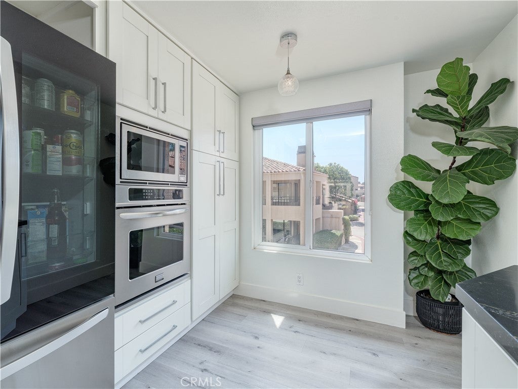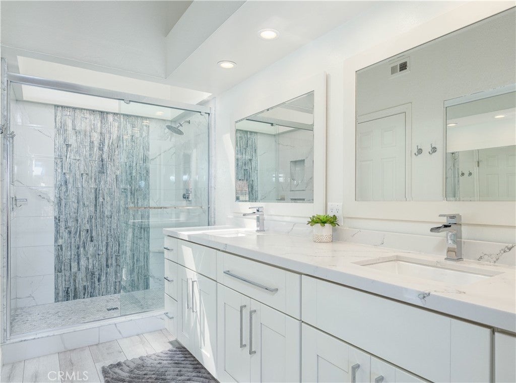 This exquisite 2-bedroom, 2.5-bathroom condo is nestled in the picturesque Broadmoor Huntington Harbour, a rare gem of a waterfront community just a short stroll from the pristine ocean and the serene beaches along the bay. The residence showcases a wealth of upscale upgrades, featuring stunning vinyl plank flooring that flows seamlessly throughout the space, complemented by remodeled bathrooms adorned with solar tubing, elegant vanities, and contemporary fixtures. With its soaring cathedral ceilings, the condo is bathed in natural light, creating an inviting and airy atmosphere. The kitchen is a true culinary delight, boasting expansive quartz countertops, premium cabinetry, and a sleek stainless steel oven alongside a gas stovetop, perfect for the aspiring chef. Enjoy your morning coffee or a quick bite in the charming breakfast nook, which provides a cozy spot to savor meals. The kitchen effortlessly transitions into the dining area and a spacious living room, which invites you to unwind and enjoy the ambiance. Sliding doors lead to one of two balconies, where you can revel in delightful peek-a-boo views of the harbor. On the main floor, you'll discover a convenient powder room and a well-appointed full-size laundry room, enhancing the functionality of the space. Ascend to the upper level, where the dual master suites offer the ultimate in privacy and comfort. The primary suite is a retreat, featuring two expansive closets and its own private balcony that showcases glimpses of the harbor and ocean. The primary bathroom is a spa-like sanctuary, complete with an additional closet, a custom shower adorned with "rain drop" tile, a sleek, clear glass enclosure, and quartz countertops with double sinks. A skylight positioned above the shower invites natural light, creating a bright and airy space. The secondary suite is equally impressive, with a beautifully remodeled en-suite bathroom with a new vanity and a stunning porcelain-tiled shower that adds a touch of elegance. Additional highlights include a spacious two-car garage with ample storage space, plenty of guest parking, and a secure 24-hour guarded entry. This enchanting harbor community offers a resort-like atmosphere, featuring a scenic canal that winds throughout, a newly upgraded pool and spa area, and tennis and pickleball courts. Within walking distance, you'll find Mother’s Market, Starbucks, and convenient access to the harbor, making it the ideal location for both relaxation and recreation.