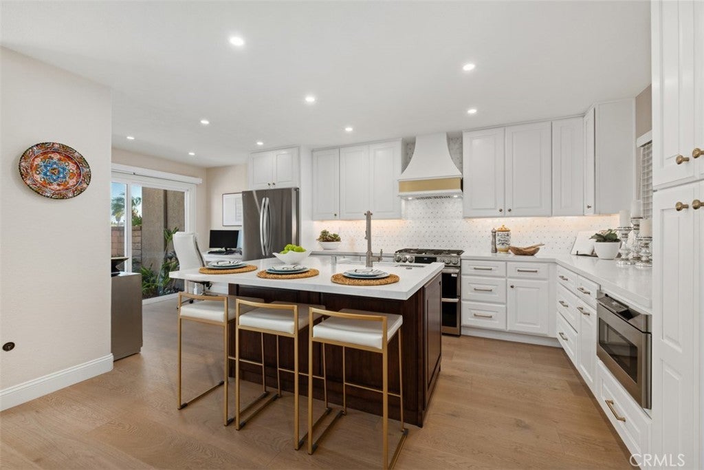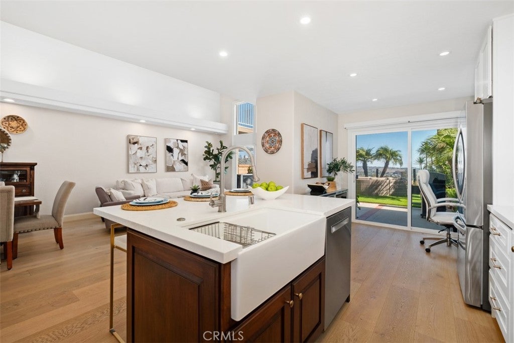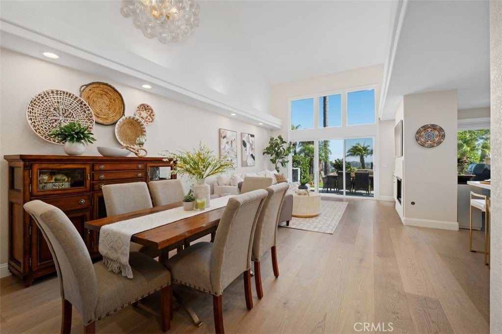 Perched in the sought-after Jamaica community of Niguel Summit in Laguna Niguel, this beautifully remodeled townhome blends designer finishes with sweeping ocean and city light views. The transformation of this home is a refined yet comfortable retreat just minutes from world-class beaches, dining, and trails. The main level was reimagined to open the flow of the living, dining, and kitchen spaces showcasing the soaring ceilings, French oak flooring, and a striking designer chandelier by Visual Comfort set the tone. The gourmet kitchen is open to the dining / family space offering quartz countertops, custom cabinetry, premium appliances including a drawer microwave and double oven gas range, and a stylish backsplash. The inviting living area features a modern gas fireplace and flows seamlessly to a private patio framed by fresh turf landscaping and endless ocean breezes, ideal for entertaining or unwinding after a long day at work. Upstairs, the primary suite offers a private view balcony, walk-in closet with custom organizers, and a spa-inspired bathroom with dual vanities and designer tile. The secondary suite boasts cathedral ceilings, an en-suite bath, and its own walk-in closet. Additional highlights include remodeled powder bath, built-in shelving, newer garage opener motor, garage storage, newer washer/dryer, AC, and updated landscaping. Enjoy resort-style amenities with a community pool, spa, and private trail access; all just moments from Laguna Beach, Dana Point Harbor, hiking trails, golf, and 5-star resorts. 29494 Port Royal isn’t just a home, it’s a statement of care, pride, and elevated coastal living. Move-in ready and designed to impress.