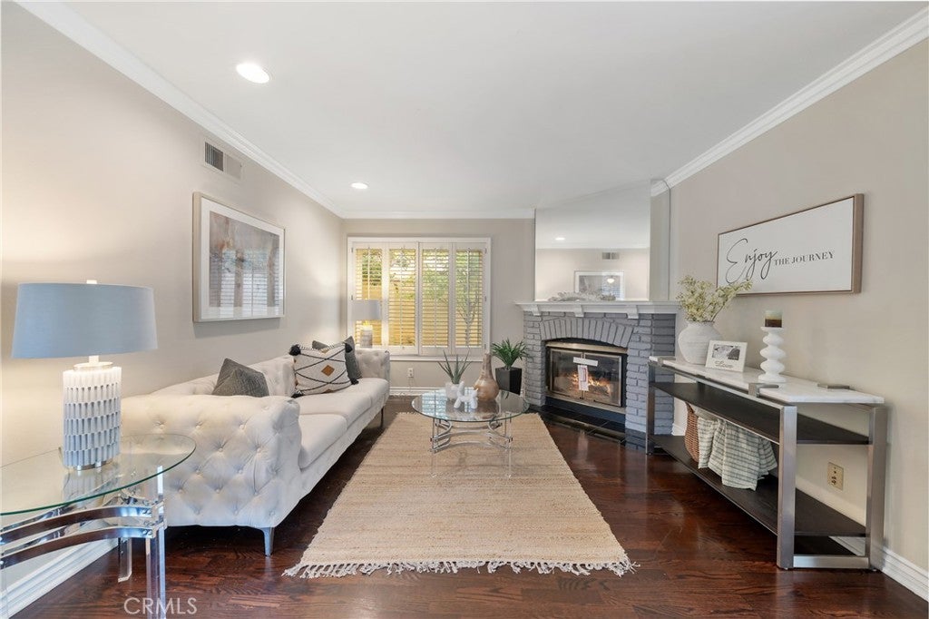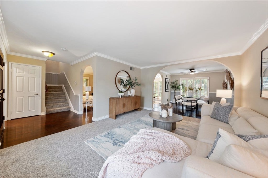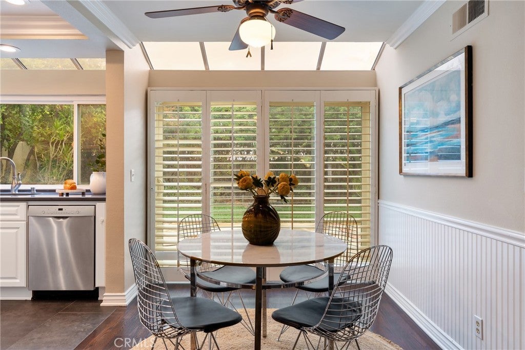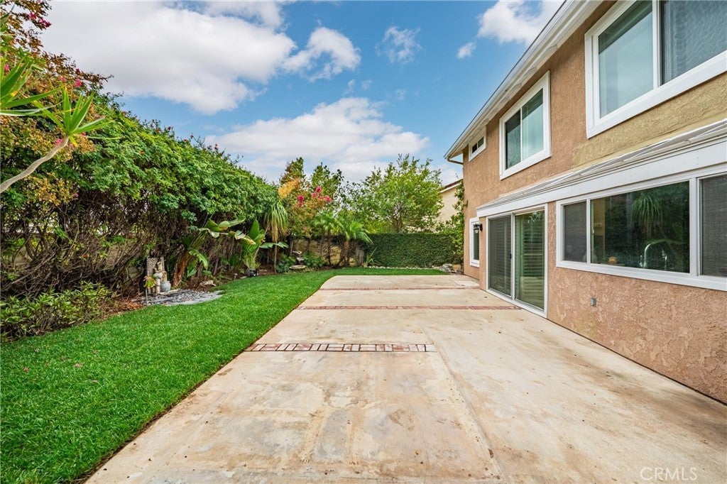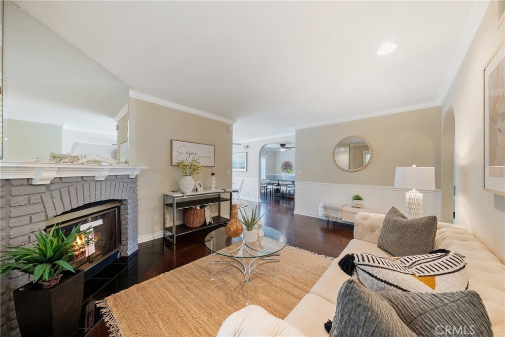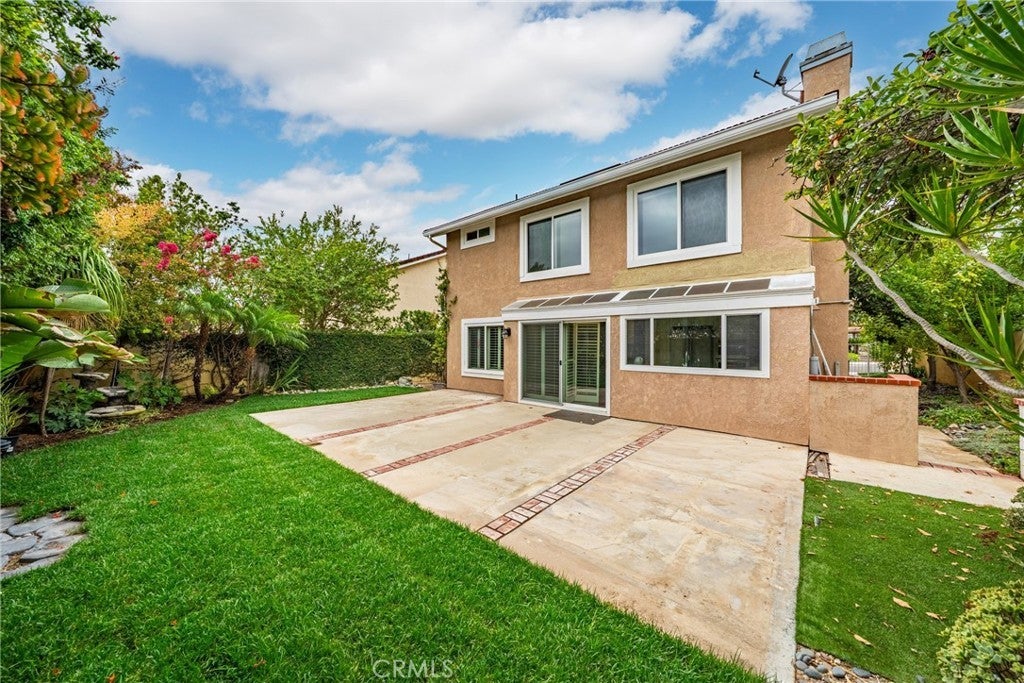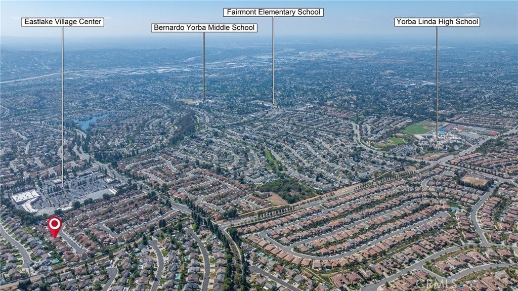 Wonderful Single Family Residence in gorgeous East Lake Village in Yorba Linda. This 3 bedroom 2 1/2 bathroom home offers 2,183 square foot of living space with beautiful upgrades and amenities including: a gorgeous kitchen with quartz counter tops, crown molding, stainless steel sink and appliances, and large windows for added light from the backyard; family room with brick fireplace; dining room with ceiling fan; large living room; inside laundry; spacious primary bedroom suite with awesome hills views and both walk-in and mirrored wardrobe closets, and two ceiling fans; primary bathroom with dual sinks and recessed lighting; large secondary bedrooms with ceiling fans. The nice house also have newer carpet, newer paint, double pane vinyl windows, plantation shutters, crown molding, hardwood floors, wainscoting, and 2 car attached garage. The inviting backyard is a dream space with multiple fruit trees and hill views. For kids, newer grass will be their fun space. The house is centrally located in the center of Yorba Linda.Just minutes away from Yorba Linda High School, restaurants, Trader Joe's...... Award-winning school district and peaceful East Lake neighborhood.