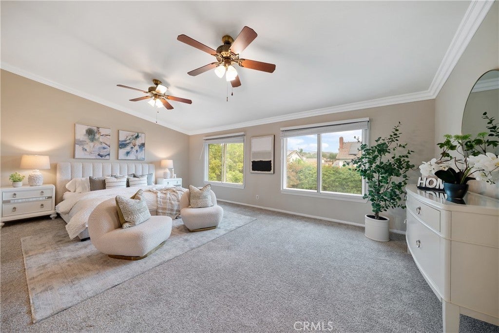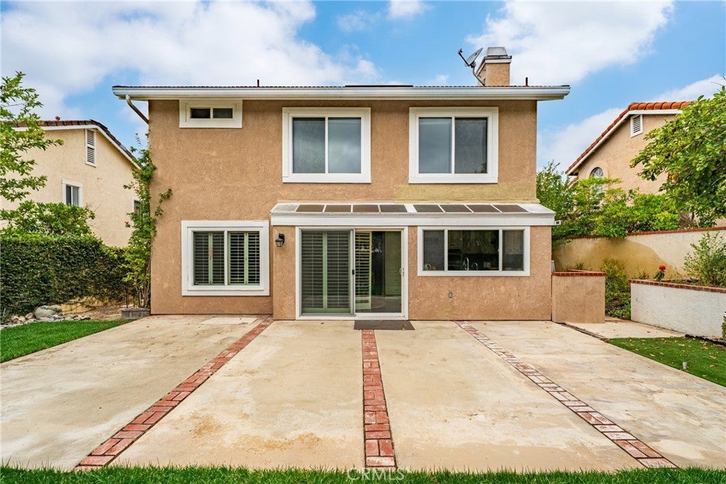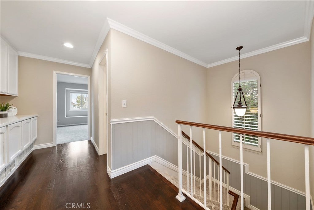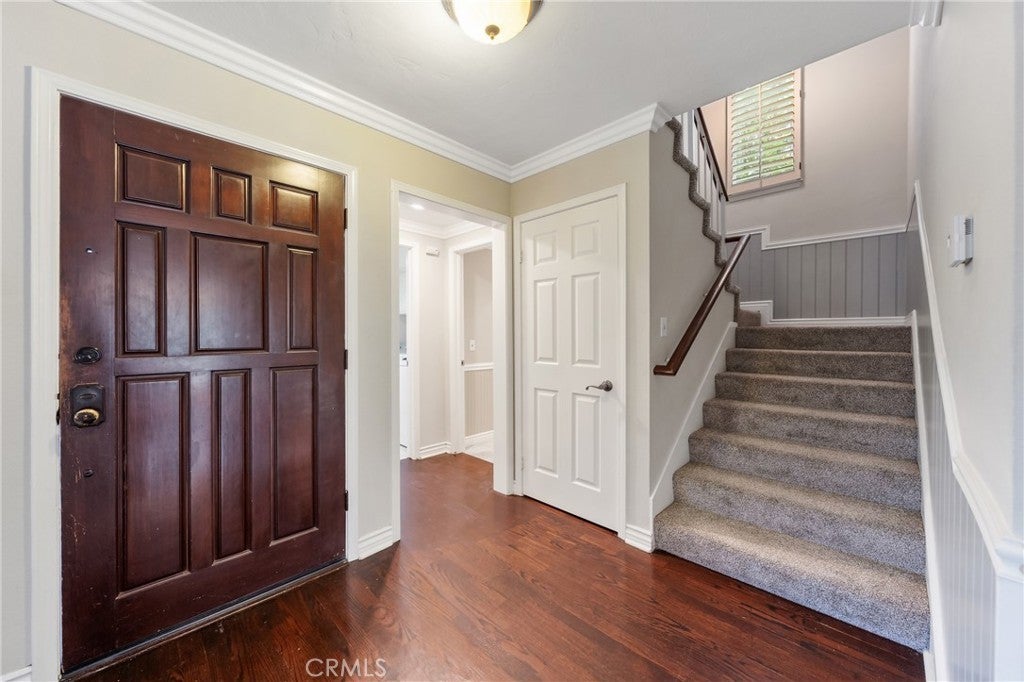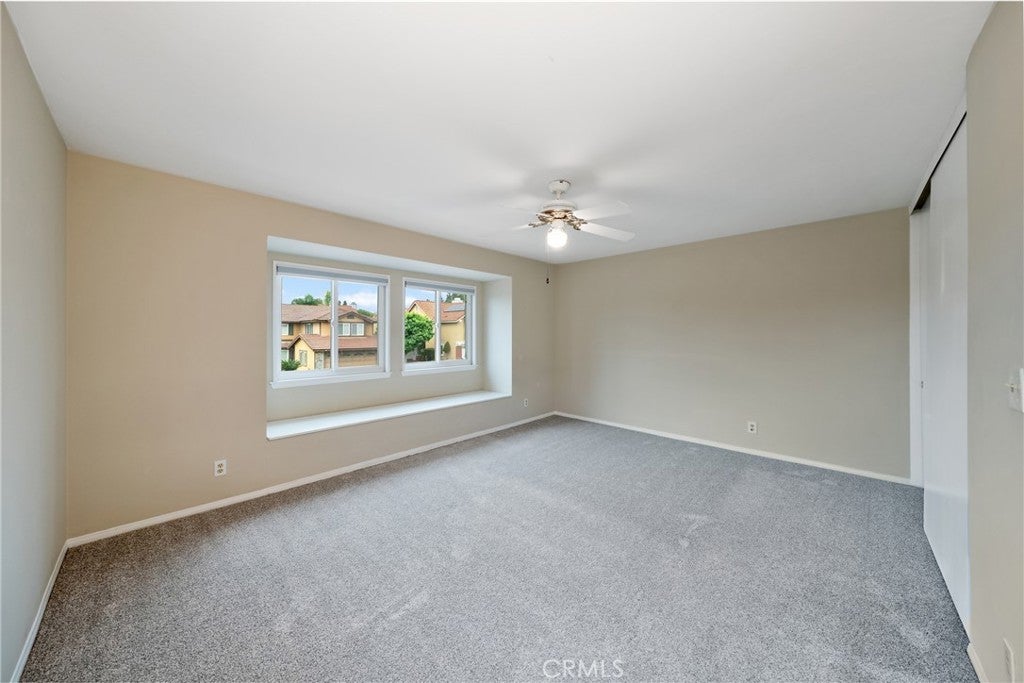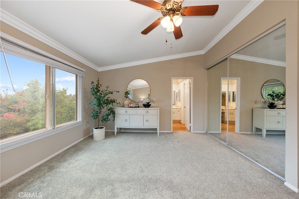 Wonderful Single Family Residence in gorgeous East Lake Village in Yorba Linda. This 3 bedroom 2 1/2 bathroom home offers 2,183 square foot of living space with beautiful upgrades and amenities including: a gorgeous kitchen with quartz counter tops, crown molding, stainless steel sink and appliances, and large windows for added light from the backyard; family room with brick fireplace; dining room with ceiling fan; large living room; inside laundry; spacious primary bedroom suite with awesome hills views and both walk-in and mirrored wardrobe closets, and two ceiling fans; primary bathroom with dual sinks and recessed lighting; large secondary bedrooms with ceiling fans. The nice house also have newer carpet, newer paint, double pane vinyl windows, plantation shutters, crown molding, hardwood floors, wainscoting, and 2 car attached garage. The inviting backyard is a dream space with multiple fruit trees and hill views. For kids, newer grass will be their fun space. The house is centrally located in the center of Yorba Linda.Just minutes away from Yorba Linda High School, restaurants, Trader Joe's...... Award-winning school district and peaceful East Lake neighborhood.