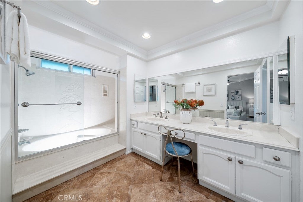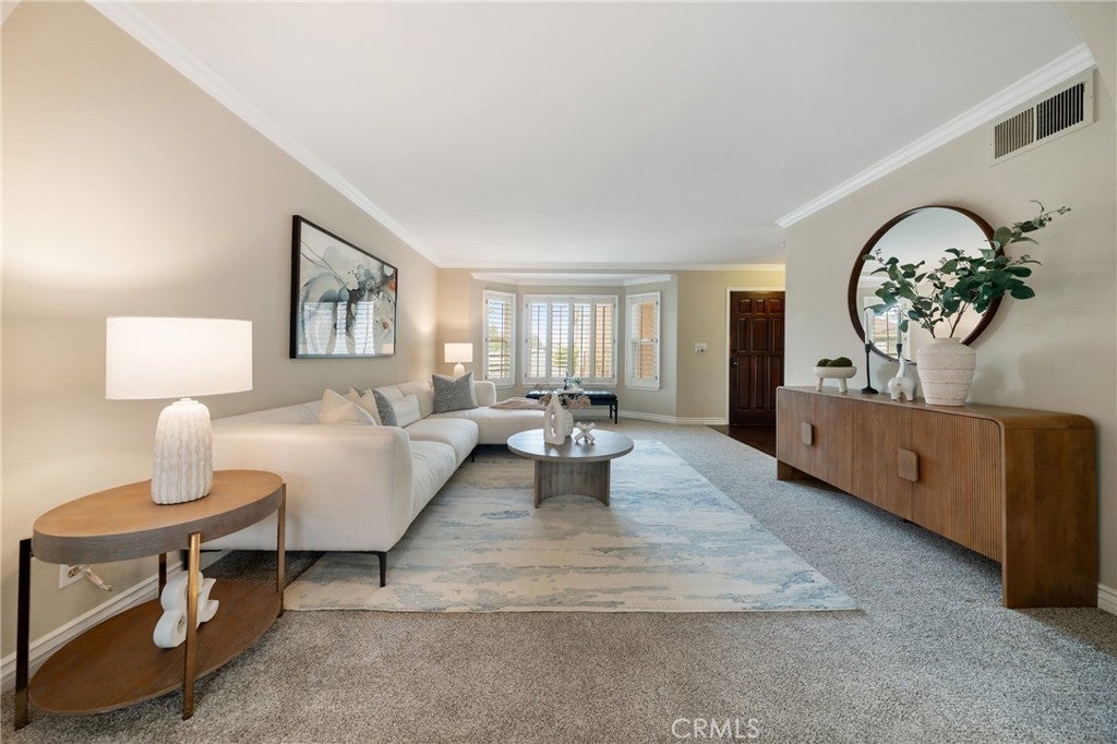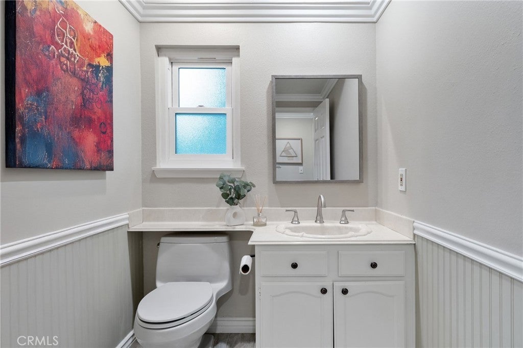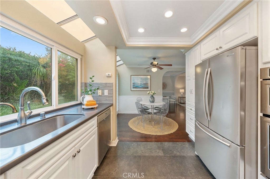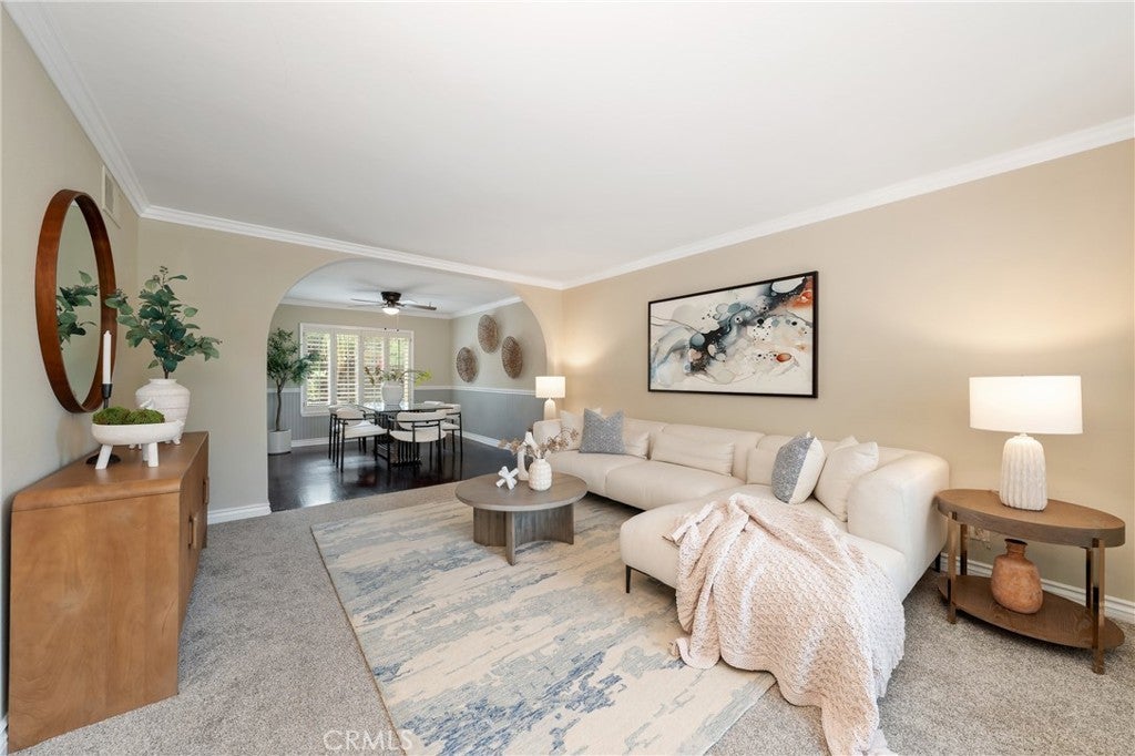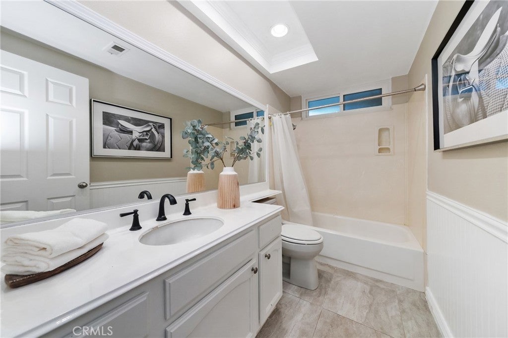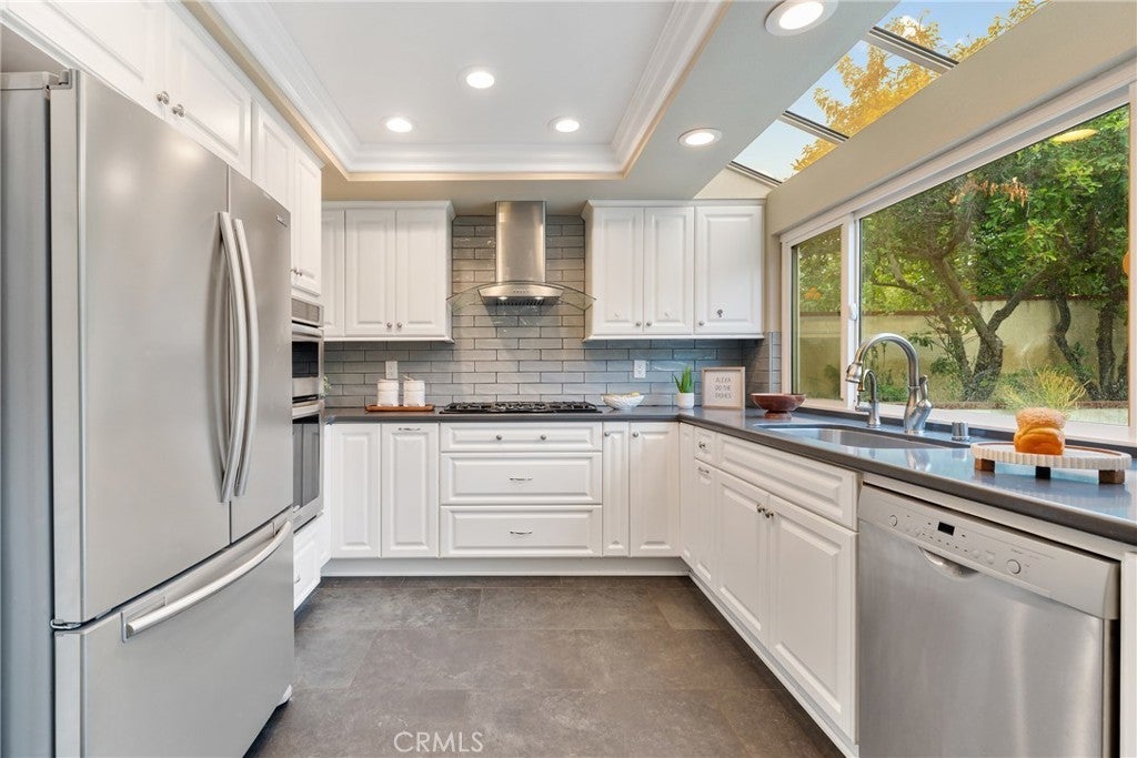 Wonderful Single Family Residence in gorgeous East Lake Village in Yorba Linda. This 3 bedroom 2 1/2 bathroom home offers 2,183 square foot of living space with beautiful upgrades and amenities including: a gorgeous kitchen with quartz counter tops, crown molding, stainless steel sink and appliances, and large windows for added light from the backyard; family room with brick fireplace; dining room with ceiling fan; large living room; inside laundry; spacious primary bedroom suite with awesome hills views and both walk-in and mirrored wardrobe closets, and two ceiling fans; primary bathroom with dual sinks and recessed lighting; large secondary bedrooms with ceiling fans. The nice house also have newer carpet, newer paint, double pane vinyl windows, plantation shutters, crown molding, hardwood floors, wainscoting, and 2 car attached garage. The inviting backyard is a dream space with multiple fruit trees and hill views. For kids, newer grass will be their fun space. The house is centrally located in the center of Yorba Linda.Just minutes away from Yorba Linda High School, restaurants, Trader Joe's...... Award-winning school district and peaceful East Lake neighborhood.