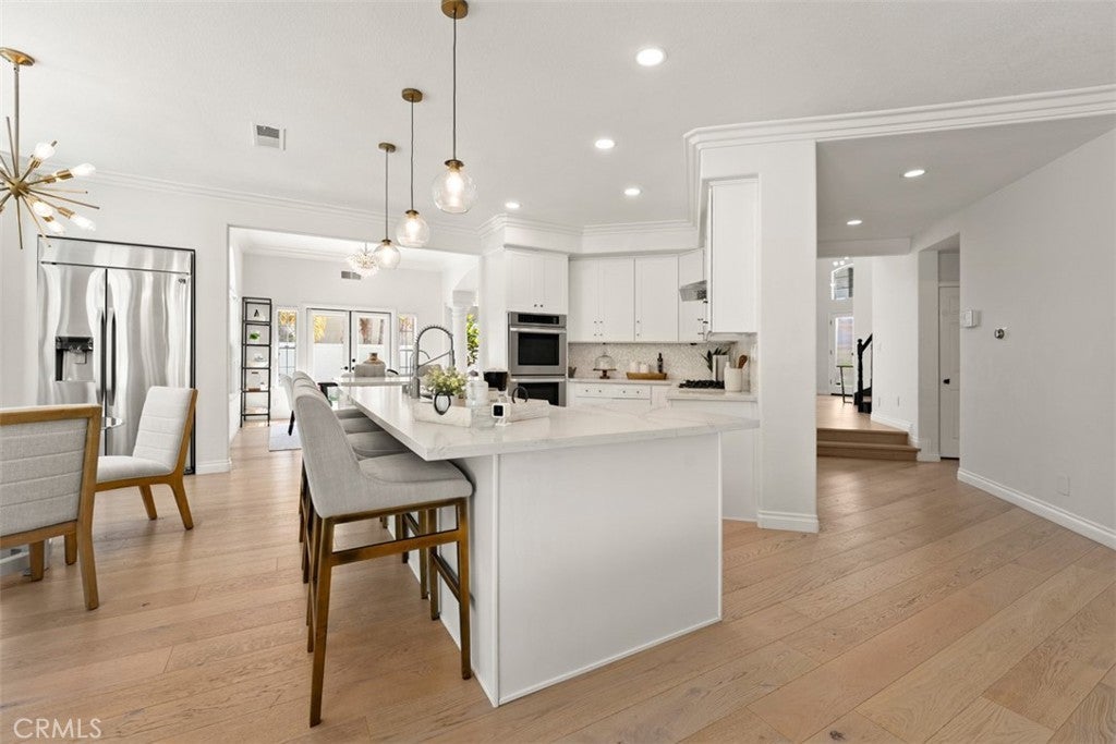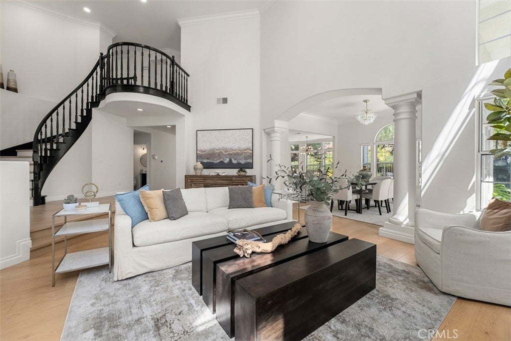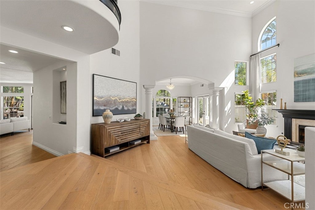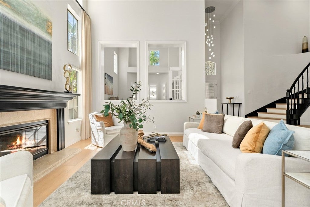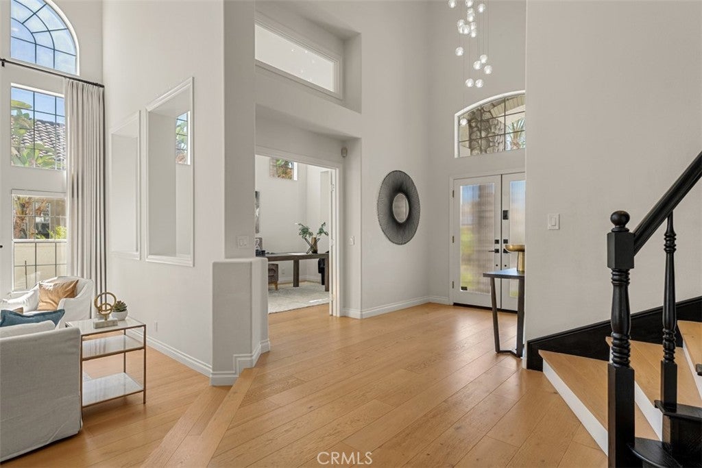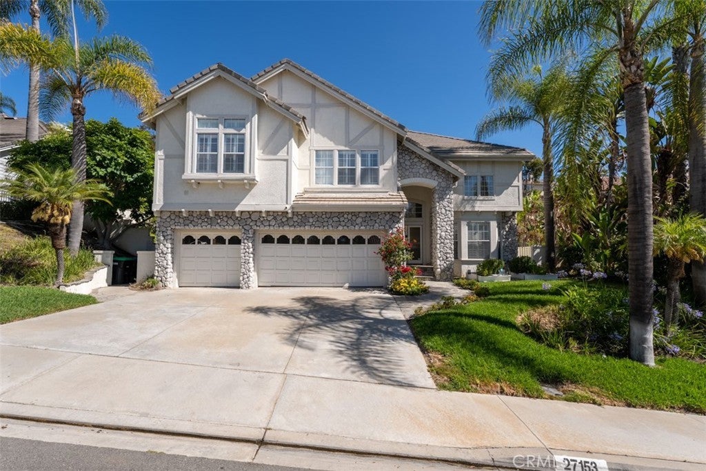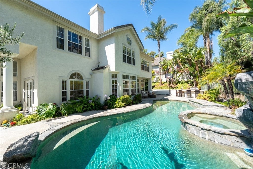 Welcome to 27153 Woodbluff, a stunningly updated 5-bedroom, 4.5-bathroom home nestled in the highly sought-after Moulton Ranch community of Laguna Hills. This spacious and meticulously maintained residence offers over 3,800 square feet of refined living space, blending timeless elegance with thoughtful modern upgrades. As you enter, you're greeted by soaring ceilings, expansive windows, and an open-concept floor plan that invites abundant natural light throughout. The main level features rich hardwood flooring and multiple living and entertaining areas, including a formal dining room, living room with fireplace, and a generous family room that flows seamlessly into the heart of the home—an exquisitely remodeled gourmet kitchen. Designed with both style and functionality in mind, the kitchen showcases custom cabinetry, granite countertops, stainless steel appliances, a reconfigured sink and counter space, and a large center island—perfect for casual dining and entertaining. The adjacent family room offers a warm and inviting atmosphere with a beautifully appointed fireplace and easy access to the backyard. A main-level bedroom with a private en-suite bath offers flexible living options for guests, extended family, or a dedicated home office. Upstairs, brand-new plush carpeting adds comfort, while the expansive primary suite serves as a true sanctuary. Enjoy a fully rebuilt spa-like bathroom with designer finishes, dual vanities, soaking tub, a large walk-in shower, and a custom walk-in closet. A second fireplace, also newly redone, adds a touch of luxury to the suite. Additional highlights include a fully renovated powder room, an upstairs laundry room for convenience, and three additional secondary bedrooms—each generously sized and filled with natural light. Step outside to a private backyard surrounded by mature landscaping, offering the perfect setting for outdoor dining, entertaining, or peaceful relaxation. Completing this exceptional home is a spacious 3-car garage, low HOA, and proximity to top-rated schools, parks, hiking trails, and major shopping and dining destinations. With quality upgrades throughout and located in one of Laguna Hills’ most desirable communities, this home is a rare opportunity you won’t want to miss.