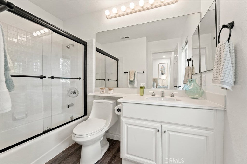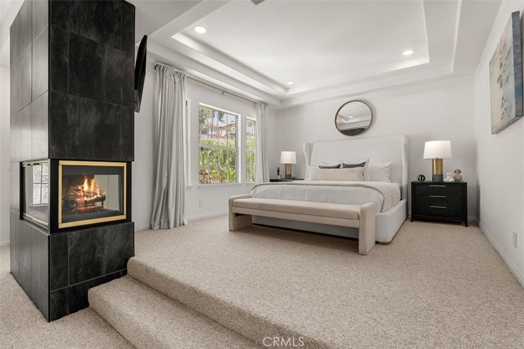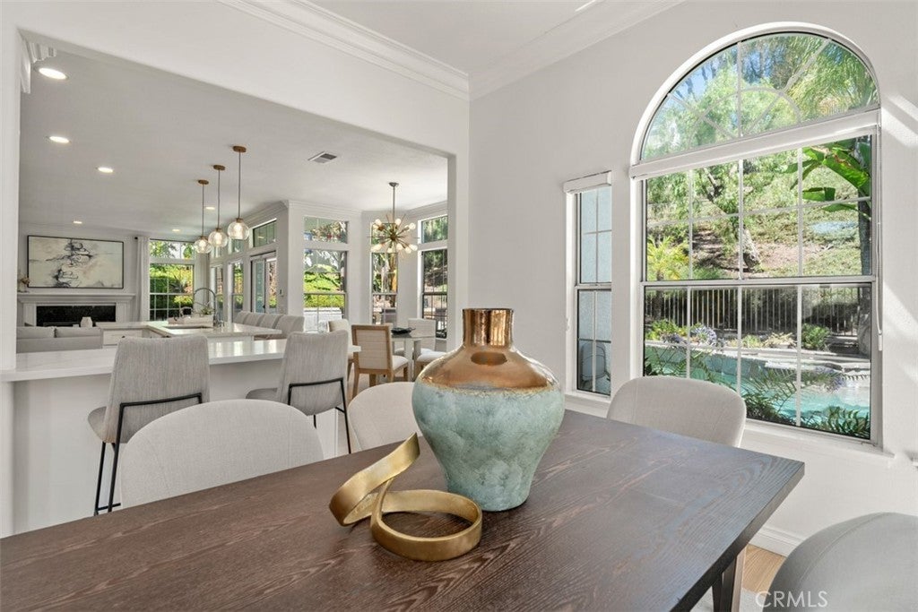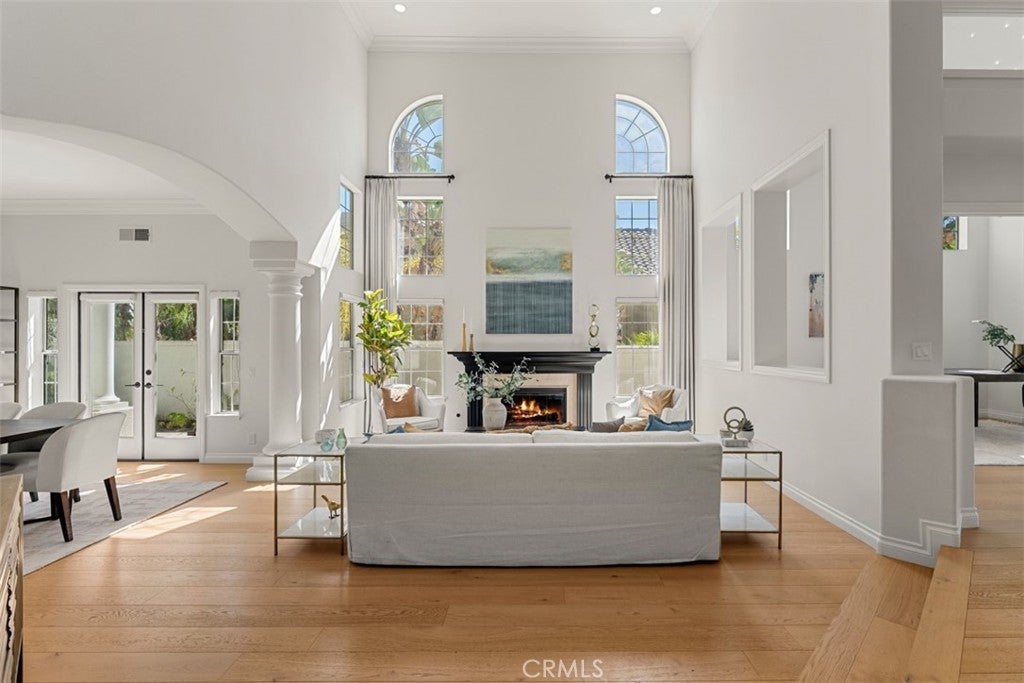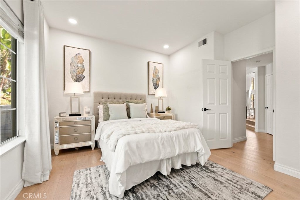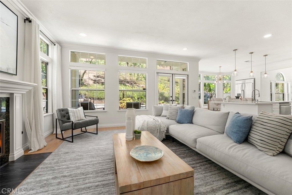 Welcome to 27153 Woodbluff, a stunningly updated 5-bedroom, 4.5-bathroom home nestled in the highly sought-after Moulton Ranch community of Laguna Hills. This spacious and meticulously maintained residence offers over 3,800 square feet of refined living space, blending timeless elegance with thoughtful modern upgrades. As you enter, you're greeted by soaring ceilings, expansive windows, and an open-concept floor plan that invites abundant natural light throughout. The main level features rich hardwood flooring and multiple living and entertaining areas, including a formal dining room, living room with fireplace, and a generous family room that flows seamlessly into the heart of the home—an exquisitely remodeled gourmet kitchen. Designed with both style and functionality in mind, the kitchen showcases custom cabinetry, granite countertops, stainless steel appliances, a reconfigured sink and counter space, and a large center island—perfect for casual dining and entertaining. The adjacent family room offers a warm and inviting atmosphere with a beautifully appointed fireplace and easy access to the backyard. A main-level bedroom with a private en-suite bath offers flexible living options for guests, extended family, or a dedicated home office. Upstairs, brand-new plush carpeting adds comfort, while the expansive primary suite serves as a true sanctuary. Enjoy a fully rebuilt spa-like bathroom with designer finishes, dual vanities, soaking tub, a large walk-in shower, and a custom walk-in closet. A second fireplace, also newly redone, adds a touch of luxury to the suite. Additional highlights include a fully renovated powder room, an upstairs laundry room for convenience, and three additional secondary bedrooms—each generously sized and filled with natural light. Step outside to a private backyard surrounded by mature landscaping, offering the perfect setting for outdoor dining, entertaining, or peaceful relaxation. Completing this exceptional home is a spacious 3-car garage, low HOA, and proximity to top-rated schools, parks, hiking trails, and major shopping and dining destinations. With quality upgrades throughout and located in one of Laguna Hills’ most desirable communities, this home is a rare opportunity you won’t want to miss.