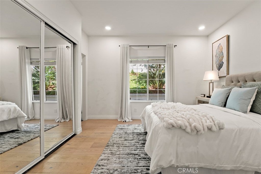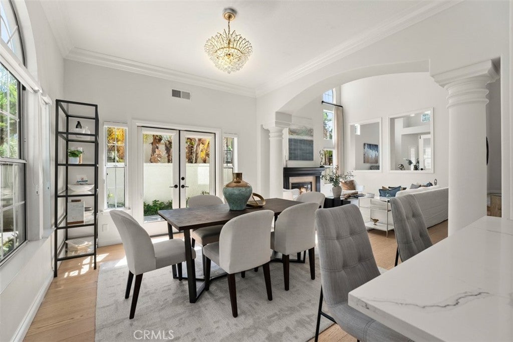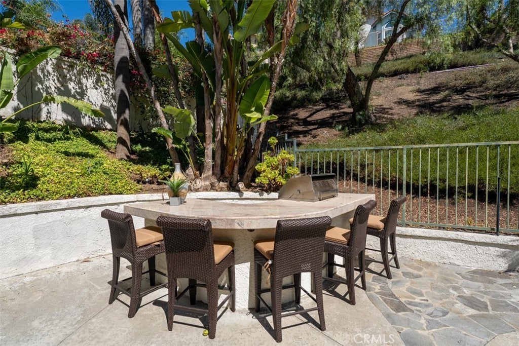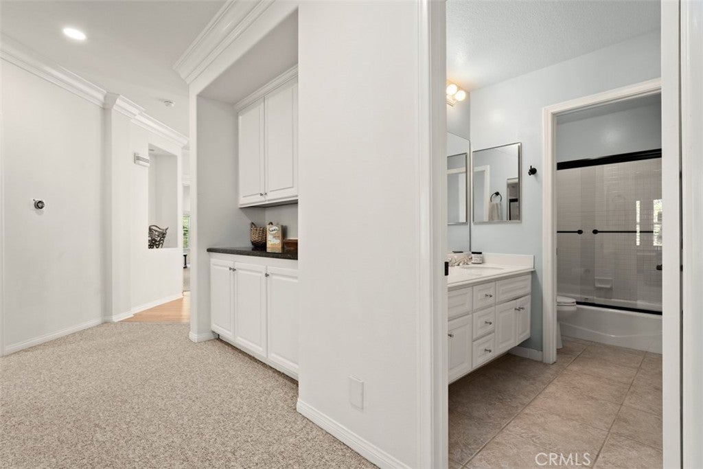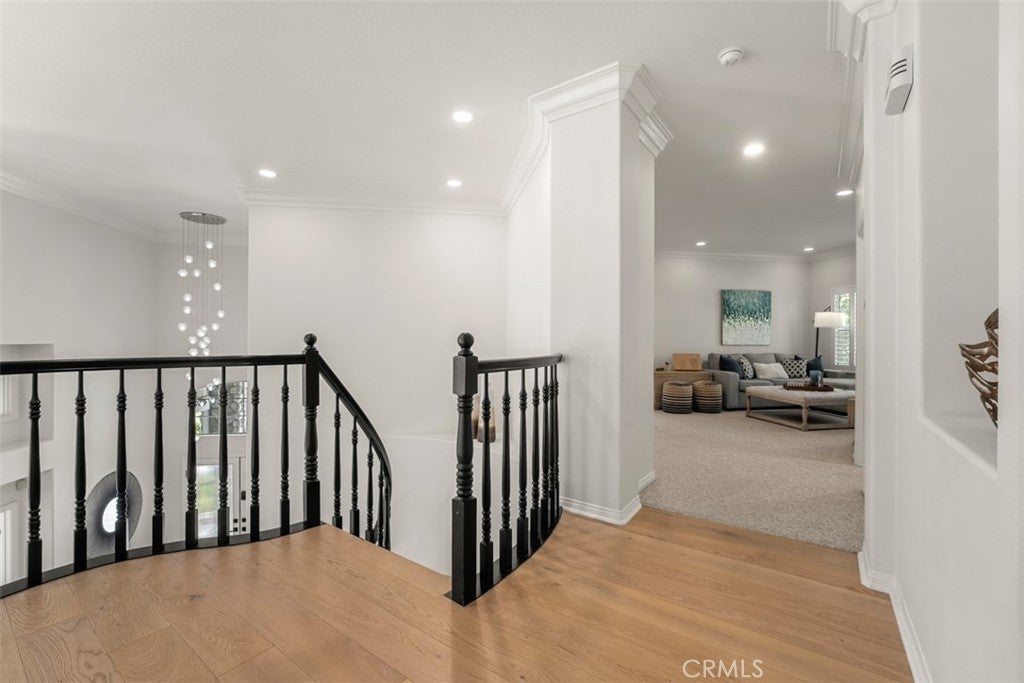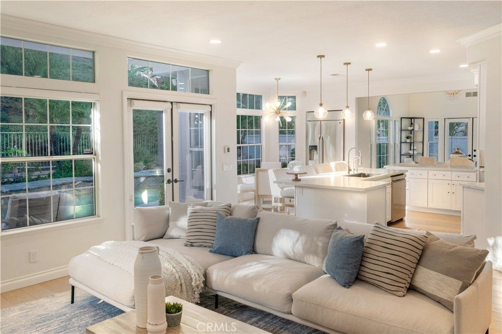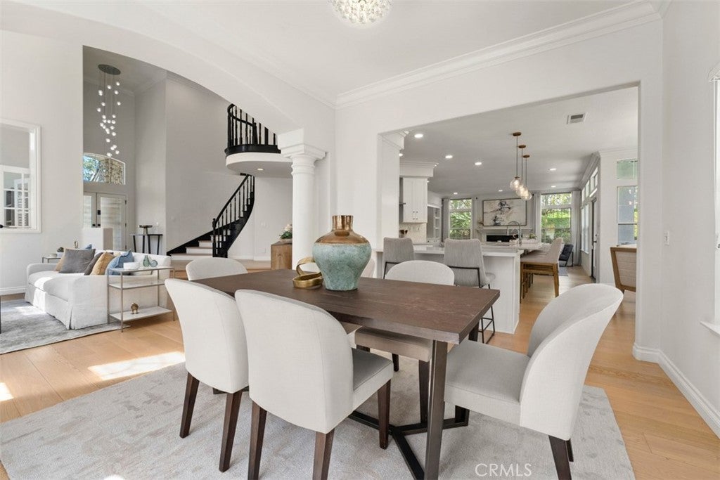 Welcome to 27153 Woodbluff, a stunningly updated 5-bedroom, 4.5-bathroom home nestled in the highly sought-after Moulton Ranch community of Laguna Hills. This spacious and meticulously maintained residence offers over 3,800 square feet of refined living space, blending timeless elegance with thoughtful modern upgrades. As you enter, you're greeted by soaring ceilings, expansive windows, and an open-concept floor plan that invites abundant natural light throughout. The main level features rich hardwood flooring and multiple living and entertaining areas, including a formal dining room, living room with fireplace, and a generous family room that flows seamlessly into the heart of the home—an exquisitely remodeled gourmet kitchen. Designed with both style and functionality in mind, the kitchen showcases custom cabinetry, granite countertops, stainless steel appliances, a reconfigured sink and counter space, and a large center island—perfect for casual dining and entertaining. The adjacent family room offers a warm and inviting atmosphere with a beautifully appointed fireplace and easy access to the backyard. A main-level bedroom with a private en-suite bath offers flexible living options for guests, extended family, or a dedicated home office. Upstairs, brand-new plush carpeting adds comfort, while the expansive primary suite serves as a true sanctuary. Enjoy a fully rebuilt spa-like bathroom with designer finishes, dual vanities, soaking tub, a large walk-in shower, and a custom walk-in closet. A second fireplace, also newly redone, adds a touch of luxury to the suite. Additional highlights include a fully renovated powder room, an upstairs laundry room for convenience, and three additional secondary bedrooms—each generously sized and filled with natural light. Step outside to a private backyard surrounded by mature landscaping, offering the perfect setting for outdoor dining, entertaining, or peaceful relaxation. Completing this exceptional home is a spacious 3-car garage, low HOA, and proximity to top-rated schools, parks, hiking trails, and major shopping and dining destinations. With quality upgrades throughout and located in one of Laguna Hills’ most desirable communities, this home is a rare opportunity you won’t want to miss.