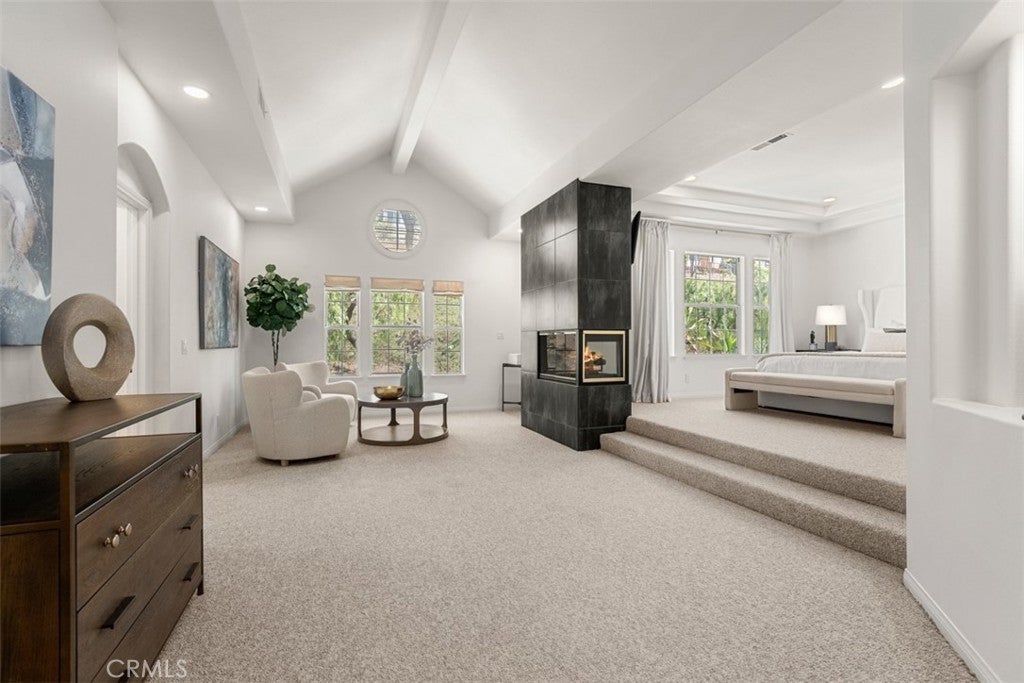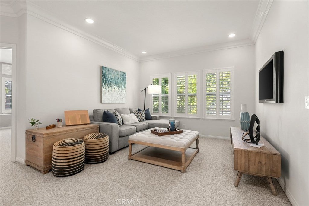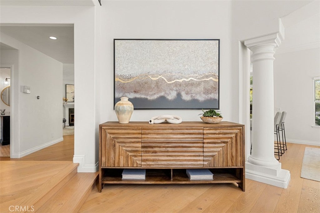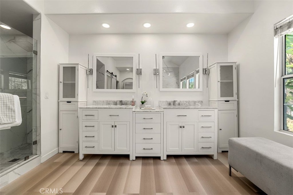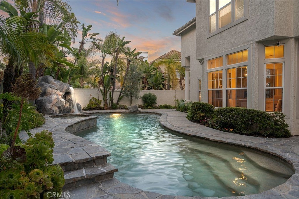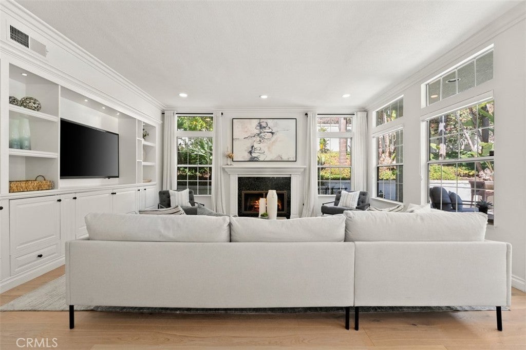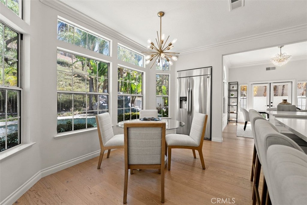 Welcome to 27153 Woodbluff, a stunningly updated 5-bedroom, 4.5-bathroom home nestled in the highly sought-after Moulton Ranch community of Laguna Hills. This spacious and meticulously maintained residence offers over 3,800 square feet of refined living space, blending timeless elegance with thoughtful modern upgrades. As you enter, you're greeted by soaring ceilings, expansive windows, and an open-concept floor plan that invites abundant natural light throughout. The main level features rich hardwood flooring and multiple living and entertaining areas, including a formal dining room, living room with fireplace, and a generous family room that flows seamlessly into the heart of the home—an exquisitely remodeled gourmet kitchen. Designed with both style and functionality in mind, the kitchen showcases custom cabinetry, granite countertops, stainless steel appliances, a reconfigured sink and counter space, and a large center island—perfect for casual dining and entertaining. The adjacent family room offers a warm and inviting atmosphere with a beautifully appointed fireplace and easy access to the backyard. A main-level bedroom with a private en-suite bath offers flexible living options for guests, extended family, or a dedicated home office. Upstairs, brand-new plush carpeting adds comfort, while the expansive primary suite serves as a true sanctuary. Enjoy a fully rebuilt spa-like bathroom with designer finishes, dual vanities, soaking tub, a large walk-in shower, and a custom walk-in closet. A second fireplace, also newly redone, adds a touch of luxury to the suite. Additional highlights include a fully renovated powder room, an upstairs laundry room for convenience, and three additional secondary bedrooms—each generously sized and filled with natural light. Step outside to a private backyard surrounded by mature landscaping, offering the perfect setting for outdoor dining, entertaining, or peaceful relaxation. Completing this exceptional home is a spacious 3-car garage, low HOA, and proximity to top-rated schools, parks, hiking trails, and major shopping and dining destinations. With quality upgrades throughout and located in one of Laguna Hills’ most desirable communities, this home is a rare opportunity you won’t want to miss.
