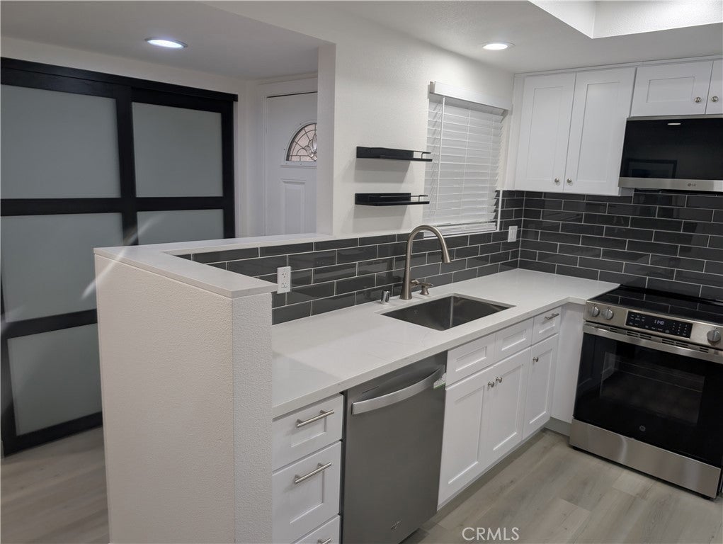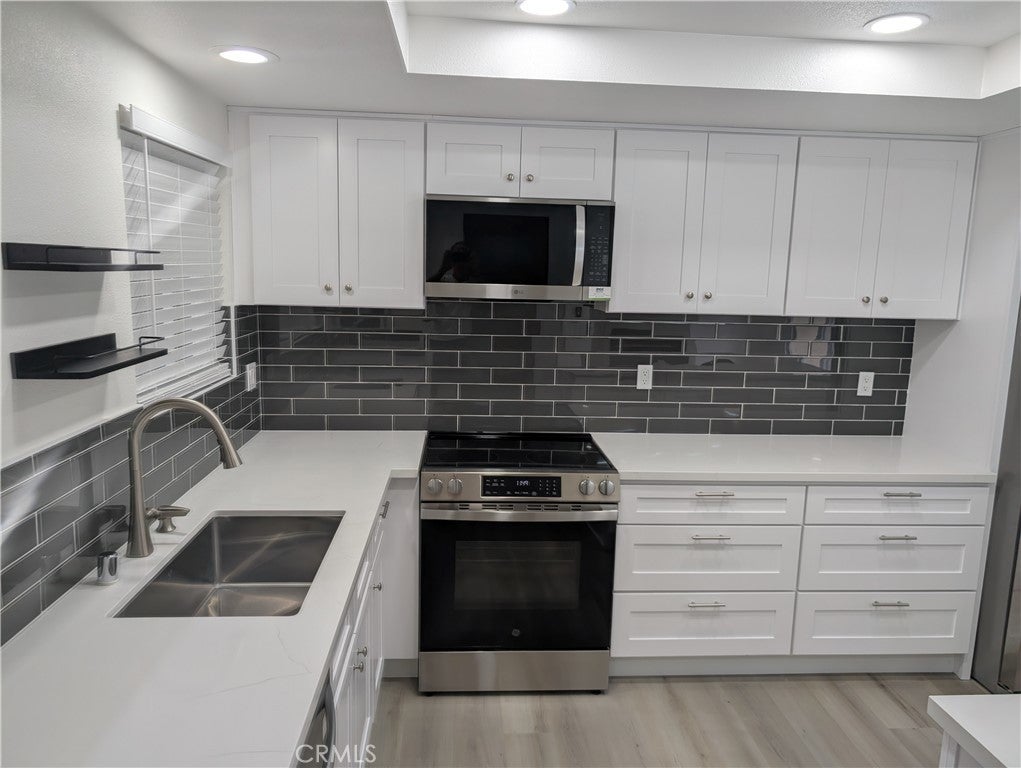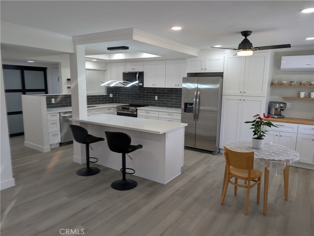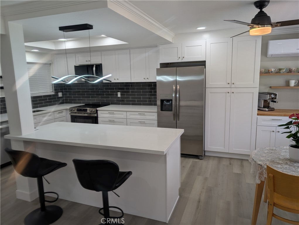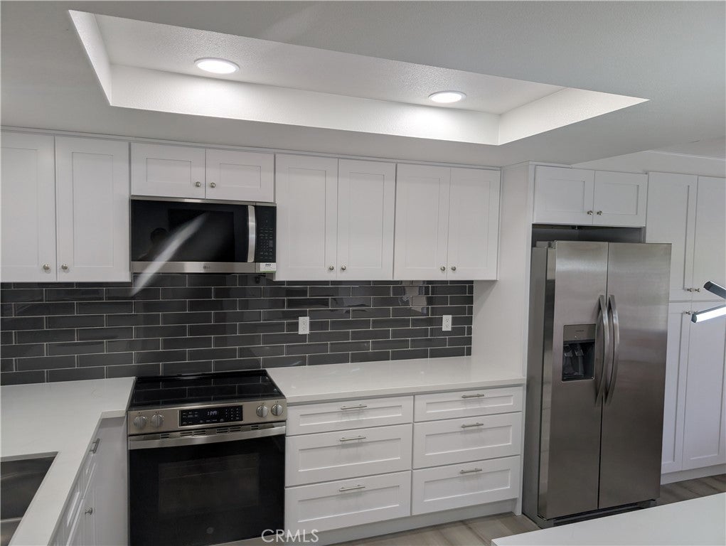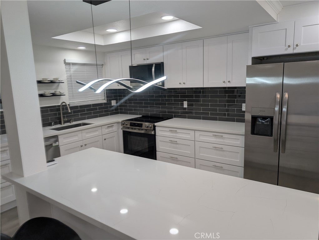 Welcome to your dream home in the heart of Laguna Woods! This extensively remodeled 2-bedroom, 2-bathroom condo is a masterpiece of modern design, offering unparalleled style, comfort, and functionality in a vibrant community. Step into a bright and airy open-concept living space, accentuated by light-toned paint that creates a fresh and inviting atmosphere. The interior features stunning mahogany-style doors with glass accents, adding a touch of elegance and allowing natural light to flow seamlessly throughout the home. The gourmet kitchen is a showstopper, designed to be both aesthetically pleasing and functional. It boasts sleek white cabinetry, brand-new stainless steel appliances—including a full-size refrigerator and a sophisticated slide-in oven—and a chic, gray-toned floor that exudes contemporary flair. A large kitchen island offers extra counter space and seating for bar stools, making it perfect for casual dining or entertaining. A dedicated coffee area adds convenience to your morning routine, while abundant storage ensures everything has its place. The adjacent dining area, complete with a ceiling fan for added comfort, flows effortlessly into the spacious living room. Here, an electric fireplace creates a cozy ambiance, making it the ideal spot for relaxing or hosting guests. Both bedrooms are generously sized, each equipped with a ceiling fan for optimal comfort. The primary suite offers a private retreat, while the second bedroom is versatile enough for guests or a home office. Two beautifully remodeled bathrooms complement the home’s modern aesthetic with their thoughtful design. Practicality meets luxury with a full-size stackable washer and dryer, a highly efficient central AC system to keep you cool year-round, and a nice-sized balcony perfect for enjoying morning coffee or sunsets with views of the Laguna Woods community. This condo is more than just a home—it’s a lifestyle. With access to Laguna Woods’ world-class amenities, including golf courses, pools, and social clubs, this impeccably remodeled gem offers the perfect blend of elegance and convenience. Don’t miss your opportunity to own this stunning residence—schedule your private tour today!