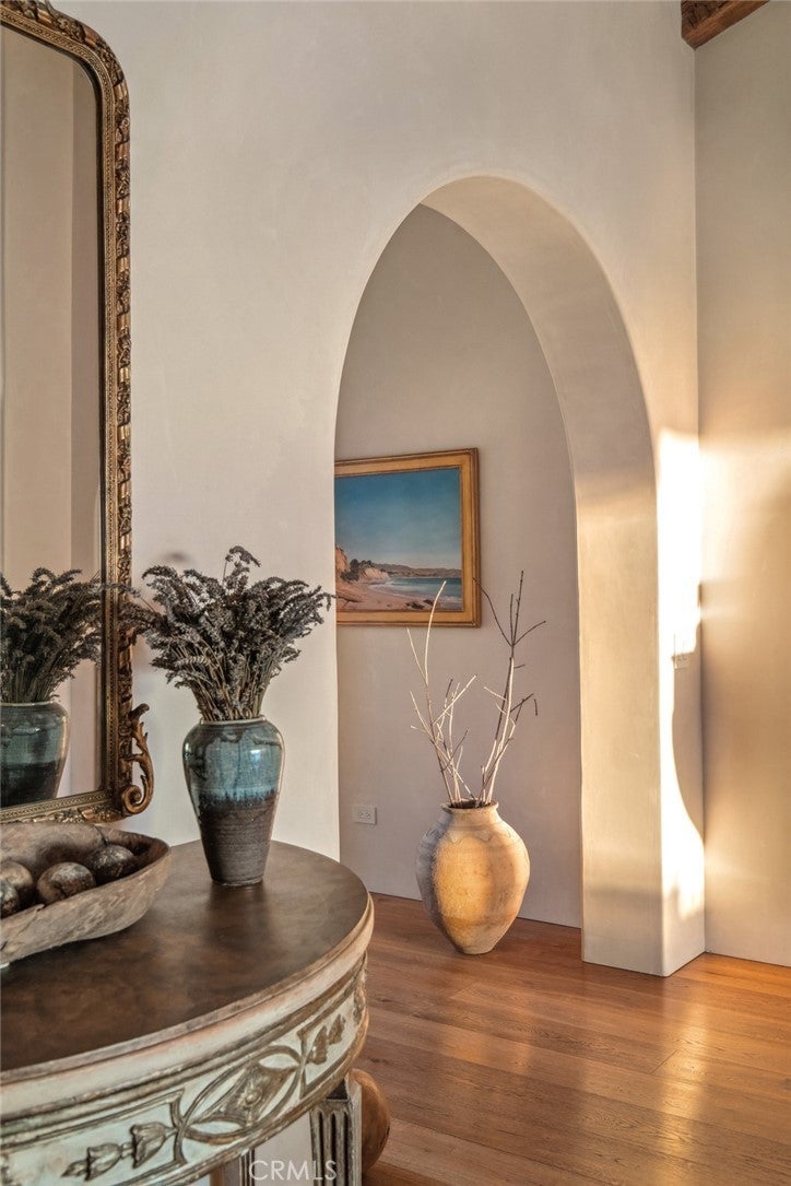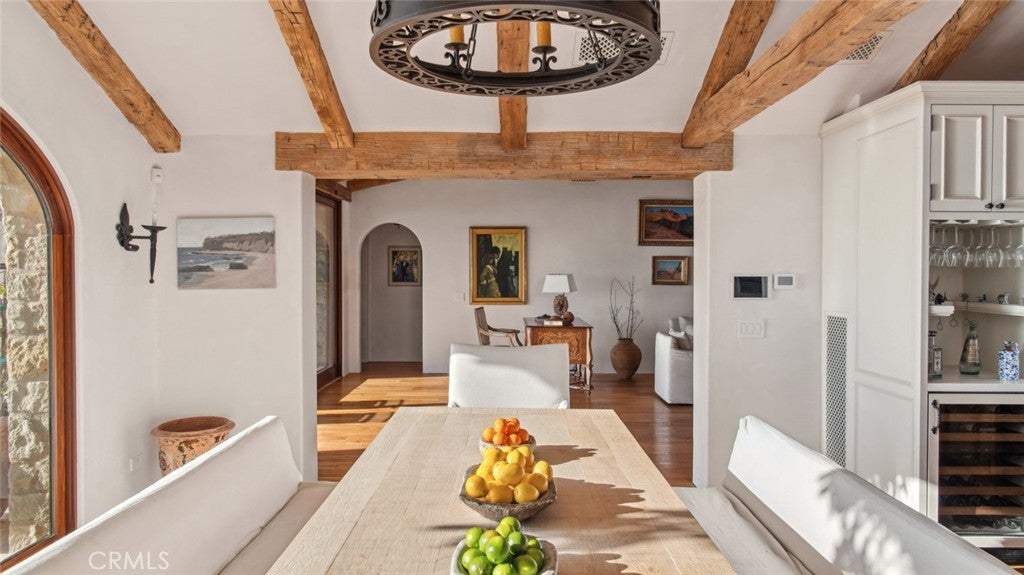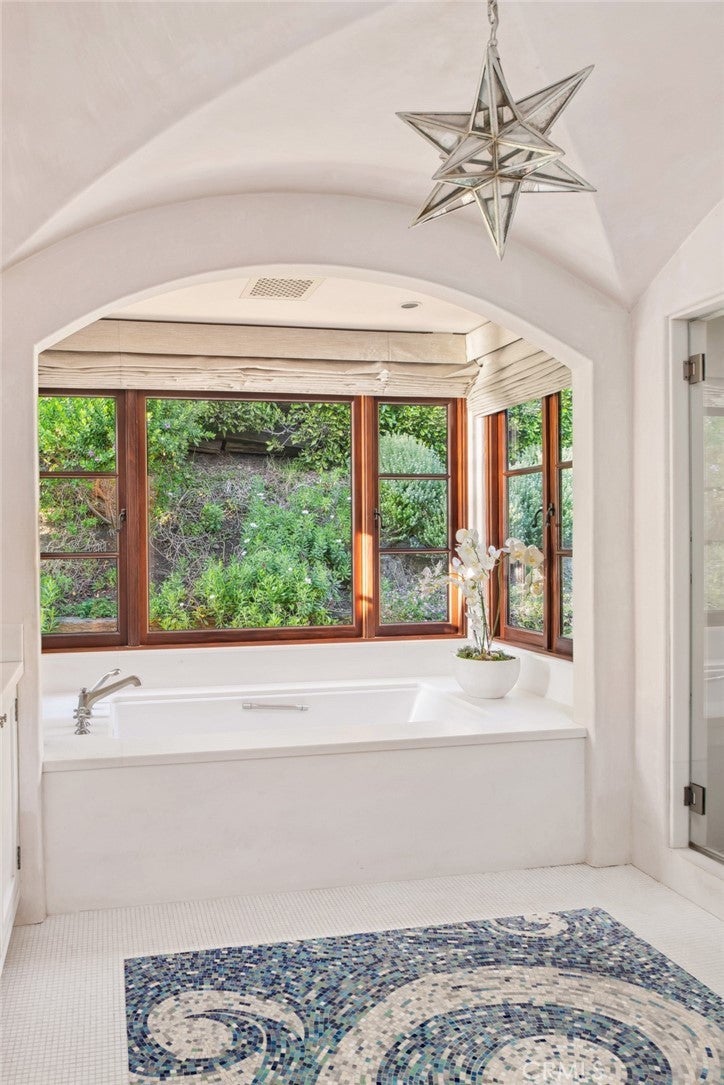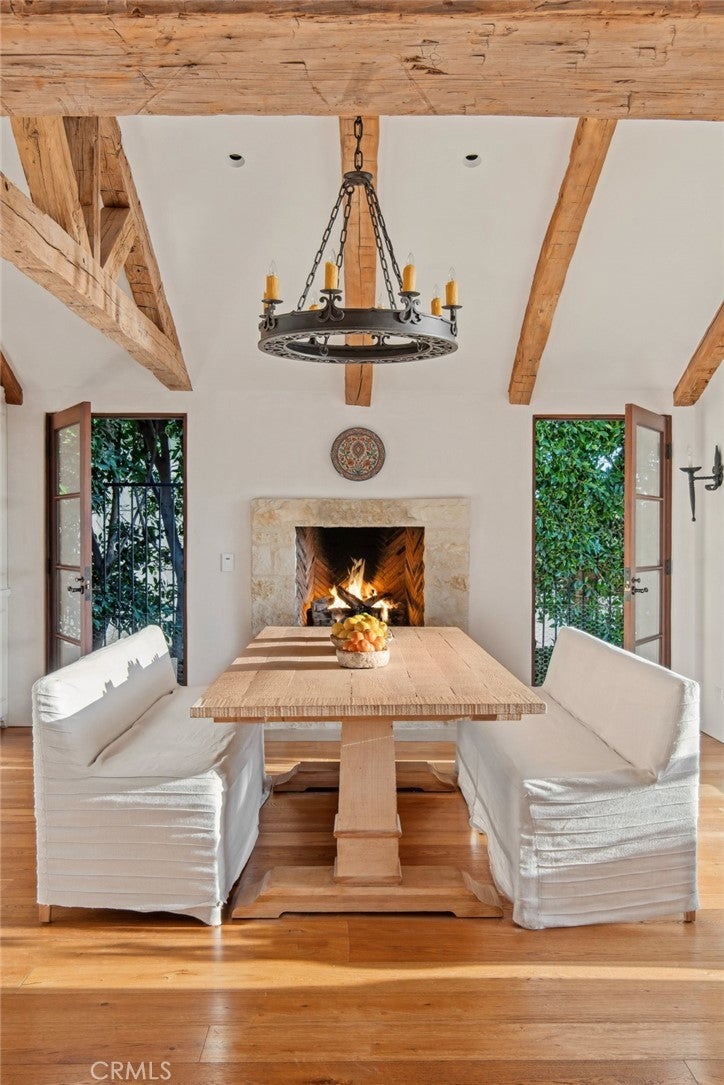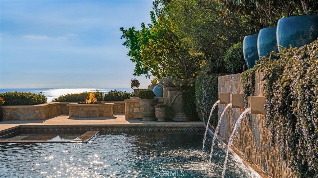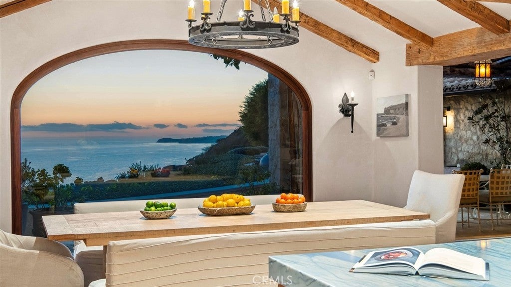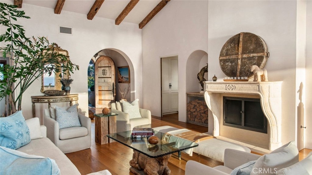 Discover unparalleled luxury in this exquisite French Country-style estate crafted by renowned builder Paul Brant Williger and featured in Luxe Magazine and two HBO productions. Nestled in a prestigious enclave (soon to be part of a gated, fire-wise community) this architectural gem blends breathtaking ocean views over Little Dume, with world-class amenities and impeccable craftsmanship. A stone-arched entryway invites you into a world of sophistication and timeless grandeur, as you are greeted with soaring vaulted ceilings, reclaimed French oak floors, and antique wood beams. The living room is anchored by a French antique wood-burning fireplace that seamlessly connects to the outdoors. The adjacent great room charms with a cozy firewood nook. The chef's kitchen is a culinary masterpiece featuring a sprawling quartzite island, Caesarstone counters, and premium appliances (6-burner Wolf range, Wolf microwave, Miele dual dishwashers, Sub-Zero refrigeration to name a few). The formal dining room captivates with a fireplace, wood-beamed vaulted ceilings, French tiles, and sweeping coastline vistas. A nearby powder room impresses with French tile floors, floating sink imported from France, and bespoke lighting. The primary suite offers ocean and pool views, a vaulted ceiling, walk-in closets, and fireplace, and sliding doors to the lush backyard. Its spa-inspired ensuite boasts mosaic tile floors, stone counters, double vanity, walk-in shower with a marble bench, and an in-ground soaking tub framed by elegant French windows. A converted garage serves as a versatile office or gym, complete with skylights, and French doors opening to the garden. The laundry room includes built-in storage, washer and dryer, and a wine fridge. The backyard is a private paradise, showcasing panoramic ocean views, a rectangular pool with an integrated hot tub, a fire pit with a custom-built couch, and a tranquil waterfall. A covered outdoor dining area, equipped with infrared heaters and an exterior fireplace, ensures year-round enjoyment. Hand-finished French slip-resistant limestone elegantly paves the yard. Uncompromising craftsmanship defines this estate, from imported antique doors to a handmade Tuscan tile roof. Modern conveniences include ultra-sound-resistant glass windows and sliders, push-button automatic shades, a whole-home generator, three-zone climate control, and a comprehensive security system.