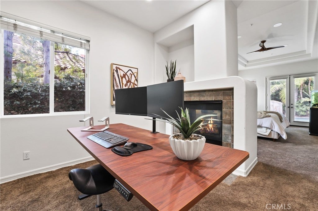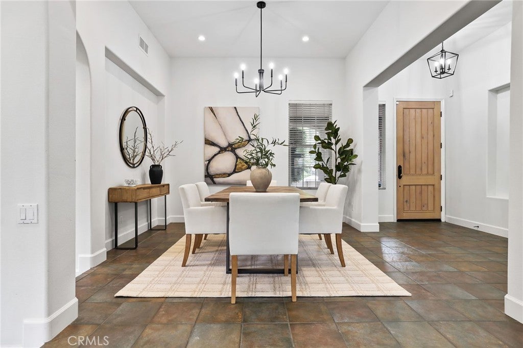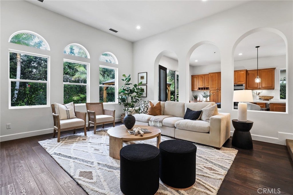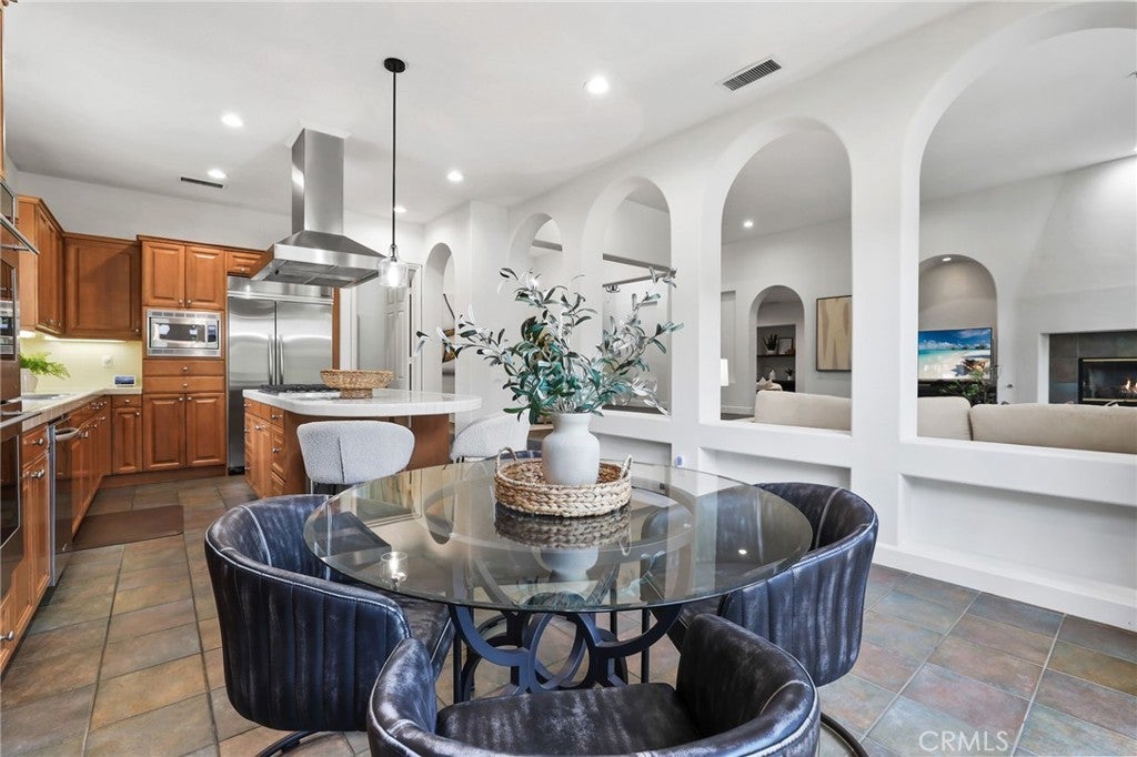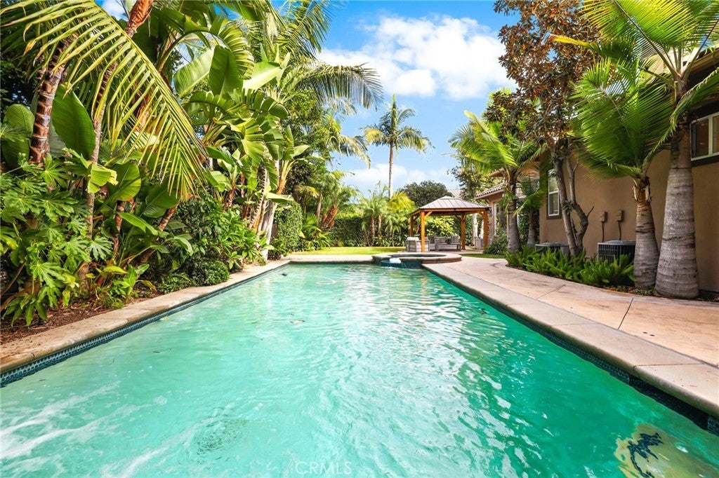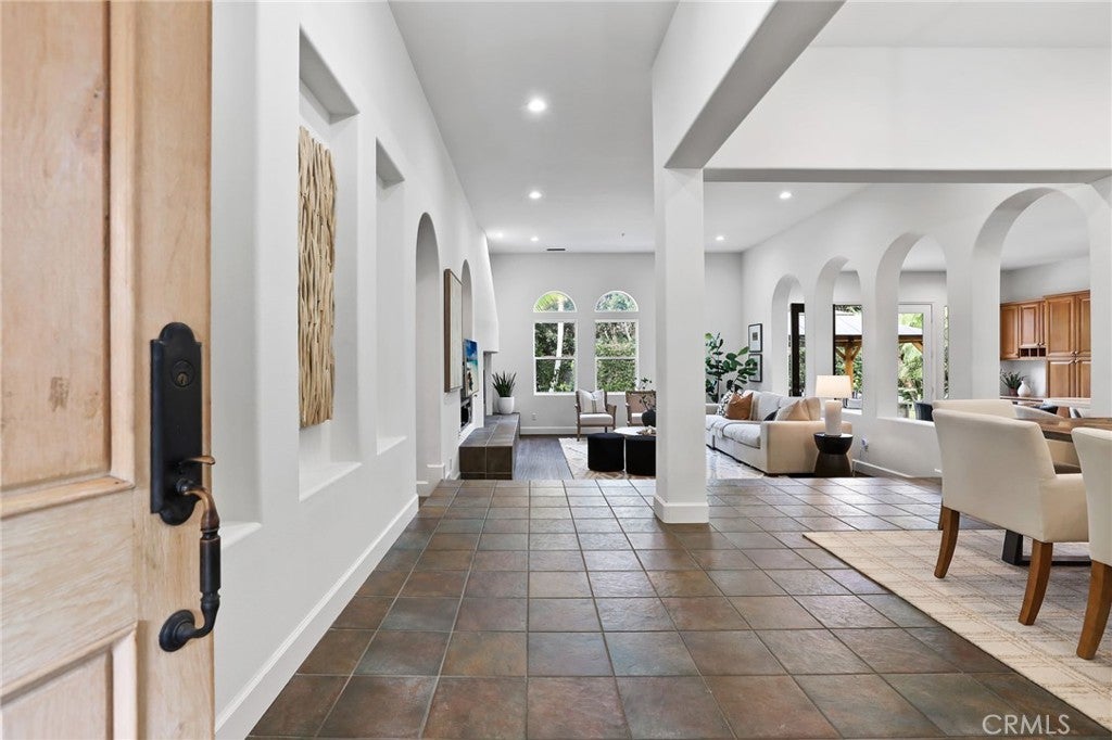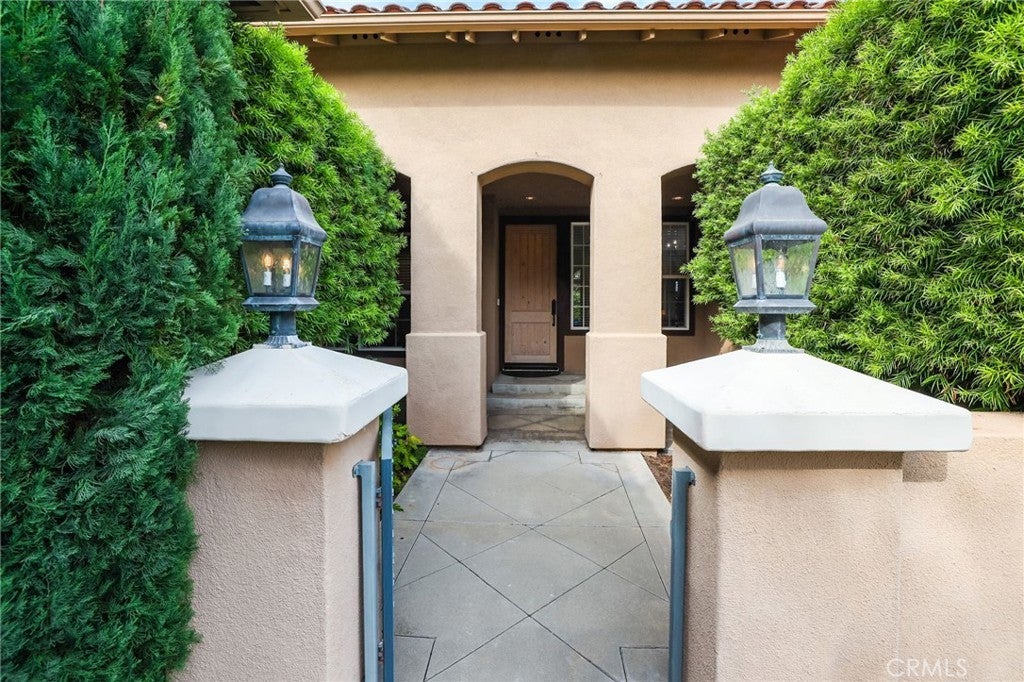 Tucked behind the gates of the prestigious 24-hour guarded Madrid community, this exquisite four bedroom three bath single-level residence offers the perfect blend of elegance, comfort, and resort-style living. A carefully landscaped gated courtyard and graceful archways set the tone as you step inside this beautifully designed home. The open-concept floor plan flows effortlessly, with arched transitions leading from one inviting space to the next. An elevated dining area overlooks the expansive living room and kitchen—ideal for hosting gatherings large or small. The chef’s kitchen impresses with a grand center island featuring a built-in cooktop, double ovens, a convenient office nook, and French doors that open to an entertainer’s dream backyard. Step outside to enjoy your private oasis complete with a covered gazebo, sparkling saltwater pool, and relaxing spa—perfect for outdoor dining and leisure. A separate family room with a half bath provides a versatile space for movie nights, a playroom, or even a home studio. The luxurious primary suite is a true retreat, highlighted by a stunning stone fireplace and an adjoining sitting room with built-in shelving—ideal for a home library, office, or fitness area. French doors provide direct access to the backyard, while archways lead to the spa-inspired primary bath featuring dual vanities, a walk-in shower, a soaking tub, and an impressive walk-in closet. The three generously sized secondary bedrooms, a well-appointed laundry room with abundant storage, and direct access to the three-car garage add everyday convenience. With its blend of sophistication and comfort, this home truly embodies the best of luxury living in one of Tustin’s most coveted communities. Welcome yourself home to 12215 Wyne Court.