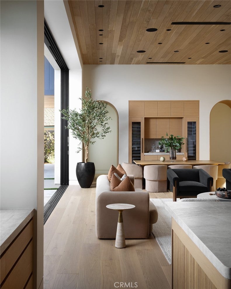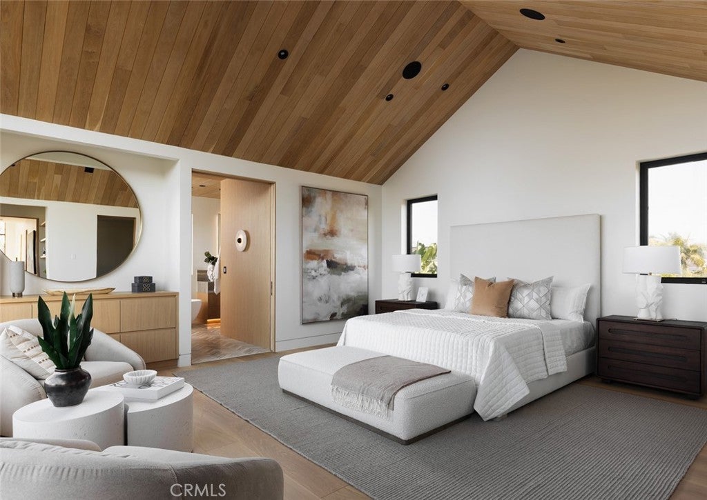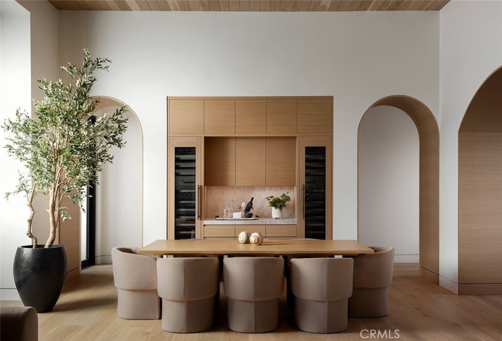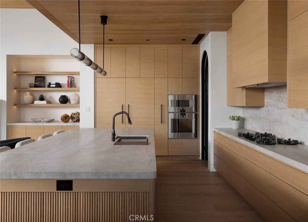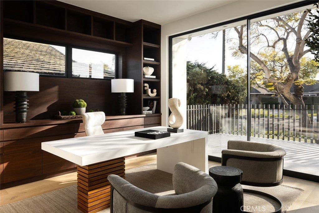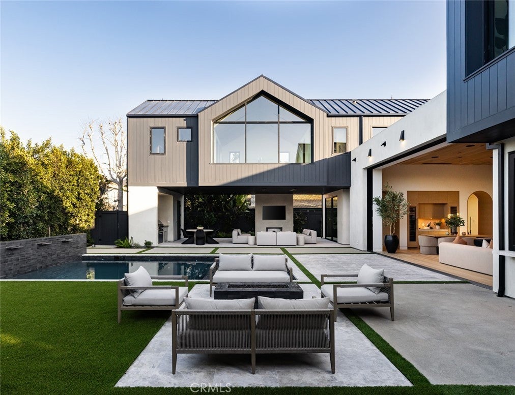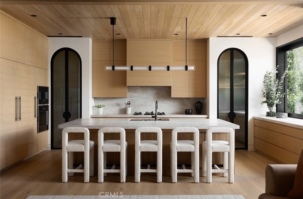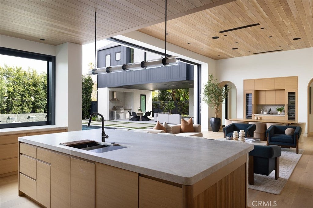 Step into an architectural masterpiece where every element of design invites you into a world of elegance and innovation. The journey begins at a double-height entry, framed by a grand custom oak archway, bringing to mind the tranquil water wall of the pool. Towering 16-foot privacy hedges guide your gaze inwards toward the expansive great room with kitchen and dining areas. Central to the home is a chef's kitchen featuring a Pitt cooktop and elite Gaggenau appliances that enhance the culinary experience, complemented by an island with fluted woodwork, masterfully placed Taj Mahal leather quartzite, and seamless custom oak cabinetry. A convenient automatic pass-through window connects to an outdoor eating area, beside a matching secondary full catering kitchen hidden behind custom-created fluted glass and steel archways. Here, in the heart of the home, additional majestic oak archways merge form and function seamlessly, centering the bar area and art walk behind.The contemporary design, envisioned by award-winning architect Eric Aust, enhances the neighborhood's charm with dramatic dormers, a lush full width living roof, expansive windows, and expert landscaping from Garden Studio. Within its striking exterior, the home features five ensuite bedrooms, five-and-a-half baths, plus an office and a separate loft, spanning 4,857 square feet of harmonious living space. The interior designed by Serendipte, blends luxury and comfort with white oak flooring, vaulted ceilings, and rich limestone and quartzite details, creating an upscale ambiance across two levels. The first-floor bedroom suite offers easy access to the office, which opens to a private front patio. Upstairs, additional bedrooms with private baths and a bonus room offer further living flexibility. The primary suite is a sanctuary with a massive walk-in closet, floating vanities, a freestanding tub, and an indulgent steam shower. Every detail speaks of handcrafted excellence, from wood-clad archways to mud in LED lighting and natural stone tiles by Ann Sacks and Walker Zanger. A three-car garage further provides function with two entry points one to the secondary kitchen and one to the mud room, with a laundry room located upstairs. Wrapped around this home is a lush backyard oasis with a custom pool, spa, 700 sqft California room, full outdoor kitchen, flush mount heat lamps, sound, fireplace and fire pit. This exclusive SkySail residence is destined to elevate your lifestyle for generations.