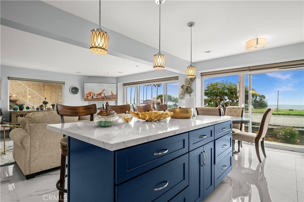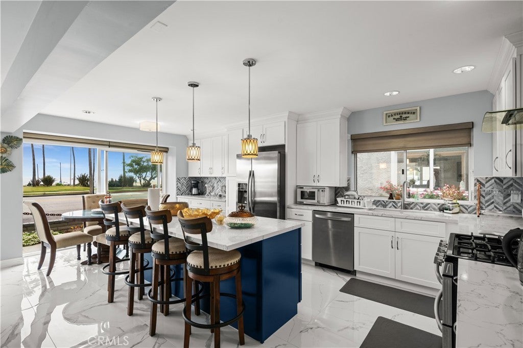 This stunning single-level, three-bedroom, two-bathroom unit stands out as one of the finest in the complex. Offering breathtaking panoramic ocean views encompassing Sunset Beach, Catalina Island, and the Palos Verdes Peninsula, it's a haven for those who appreciate coastal beauty. Step onto the open-air patio, accessible from both the kitchen and living room, and be captivated by spectacular sunsets. Situated just moments away from the sand, Seal Beach Pier, charming boutiques, and eateries, its prime old-town Seal Beach location epitomizes the ideal coastal lifestyle. Inside, the gourmet kitchen is a chef's delight, boasting new cabinets, countertops, Marble backsplash, appliances, and more, sure to impress even the most discerning guests. The living room exudes comfort and sophistication with custom flooring, an entertainment center, and a cozy fireplace, perfect for unwinding. High-quality finishes abound, including porcelain flooring, fresh paint, renovated bathrooms, custom blinds, built-in speakers, and more, enhancing both style and functionality. The fireplace adds a touch of warmth and ambiance to the space, creating an inviting atmosphere year-round. With an attached two-car garage offering private access and ample storage solutions, convenience is paramount. Accessible by stairs or elevator, this exceptional unit caters to various lifestyle needs, elevating its desirability even further. Don't miss out on this rare opportunity to indulge in coastal luxury at its finest!
