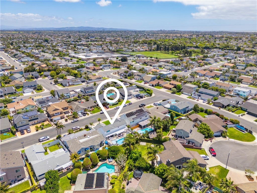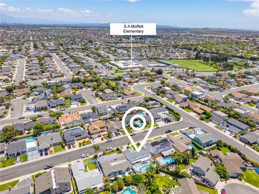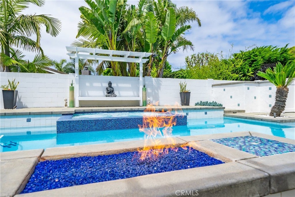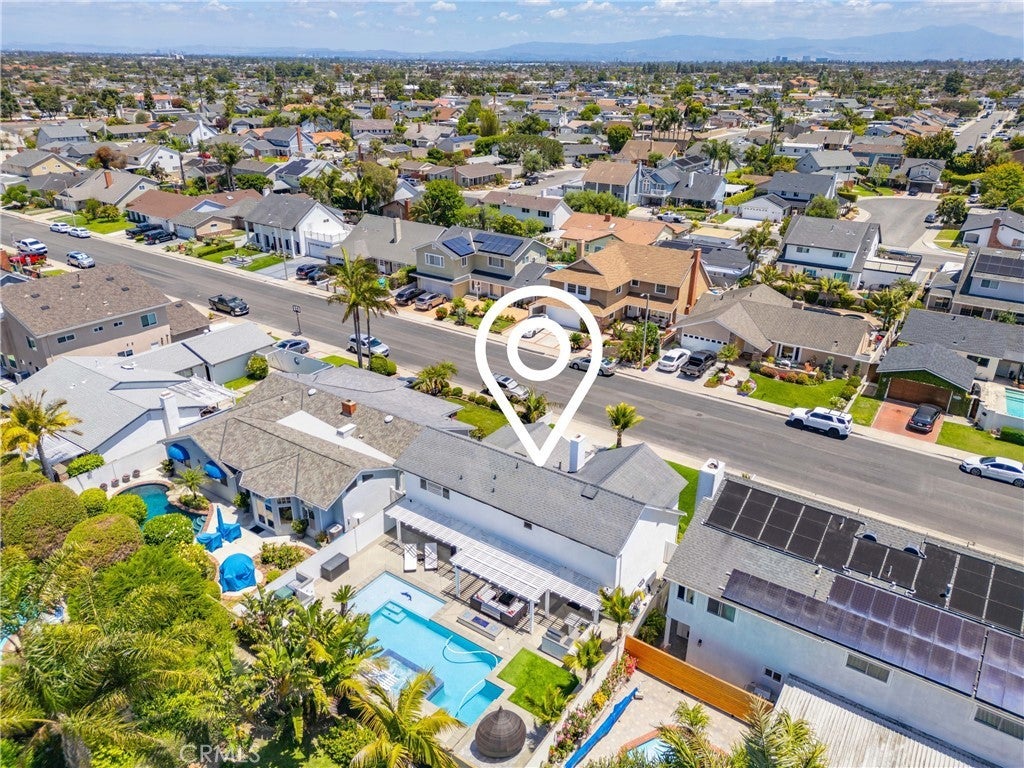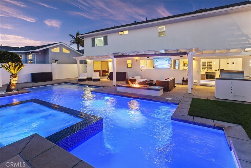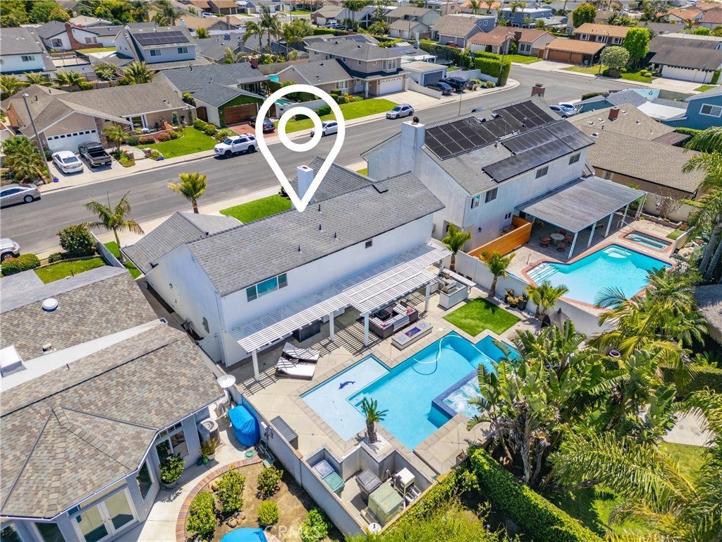 Welcome to this exceptional, renovated home blending high-end design, smart technology, and resort-style outdoor living. Located on a quiet interior street in the highly sought after Moffett tract, this home truly has it all. Every detail has been thoughtfully curated—from the reimagined front yard with lush landscaping, low-maintenance turf, new King palm, privacy fencing, and app-controlled irrigation system—to the stunning indoor and outdoor upgrades. The entry porch features stylish, no-slip tile, while the upgraded garage includes vinyl flooring, a smart door system, new water heater, and washer/dryer. Inside, the open-concept main level showcases heated Italian porcelain tile flooring and a show-stopping kitchen with a custom Italian quartz island, built-in convection oven, sensor glass cooktop, downdraft vent, microwave drawer, and sleek soft-close cabinetry in walnut and fingerprint-resistant gloss white. Under-cabinet LED lighting with app-controlled color options completes the modern aesthetic. Large sliding doors open to a true backyard retreat: a custom-built BBQ island with fridge, sink, gas grill, side burner, storage, ambient lighting, and two seating areas. Entertain with ease around the gas fire-pit or waterproof outdoor TV, or unwind in the state-of-the-art salt water pool and spa, featuring massage jets, a waterfall, Baja step, upgraded heater, and app-controlled lighting—all surrounded by lush landscaping and a new brick paver patio with a cozy daybed. The main floor includes a bedroom and beautifully updated bathroom with white marble-look tile, matte black fixtures, and a rain shower. Upstairs, the luxurious primary suite offers heated floors and a huge walk-in closet with custom built-ins and a frosted glass barn door. The spa-inspired bathroom features black porcelain tile, gold fixtures, a Kohler digital steam shower with six body sprays, bluetooth speakers, dual waterfall sinks, invisible drains, and floating walnut vanities with under-cabinet lighting. A third spacious bedroom includes an en suite bath, large closet, and sweeping views of the pool and Huntington Beach sunsets. This home also features a whole-house Sonos sound system (app-enabled) for seamless indoor and outdoor audio in the living room, primary suite, and patio. With so many features, this home is a must see and is the epitome of SoCal living near the beach, top-rated schools, shopping, dining, and entertainment.