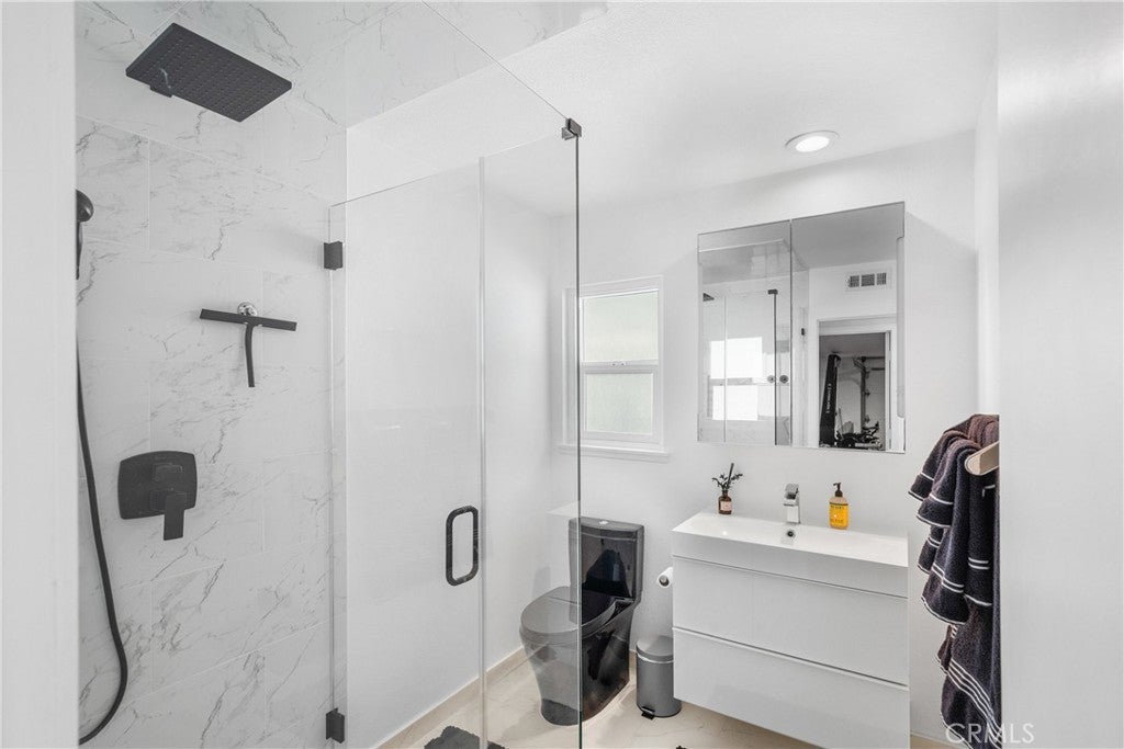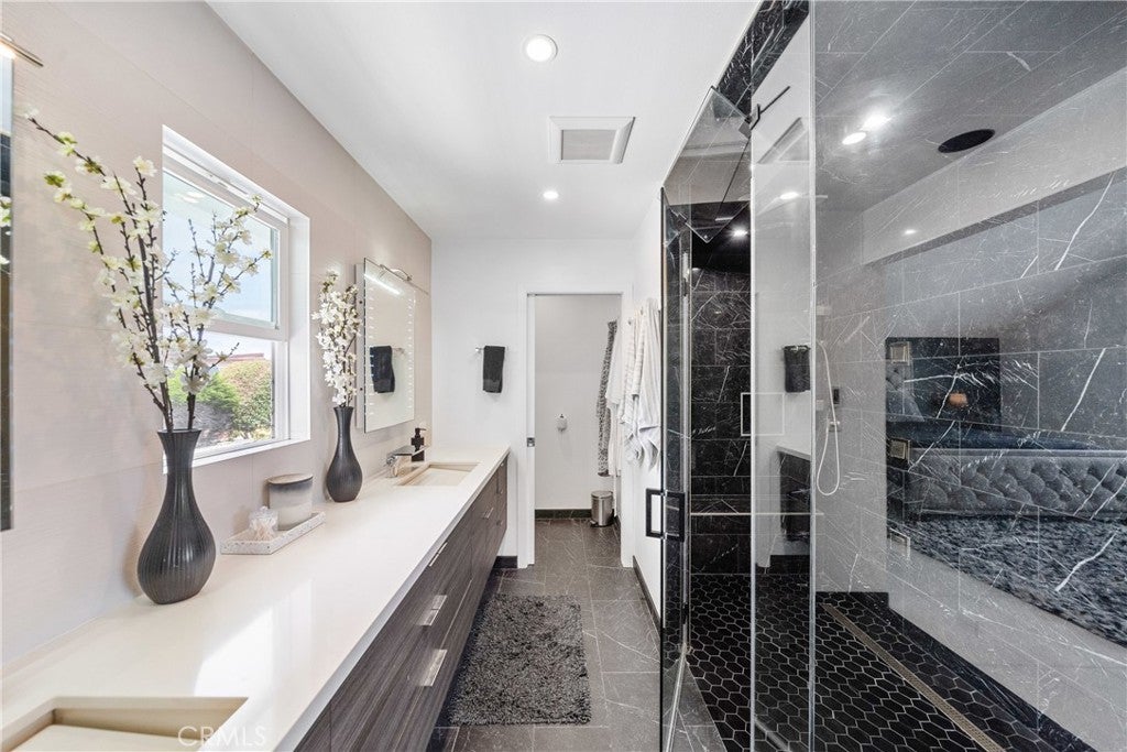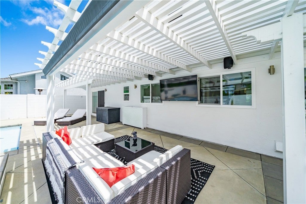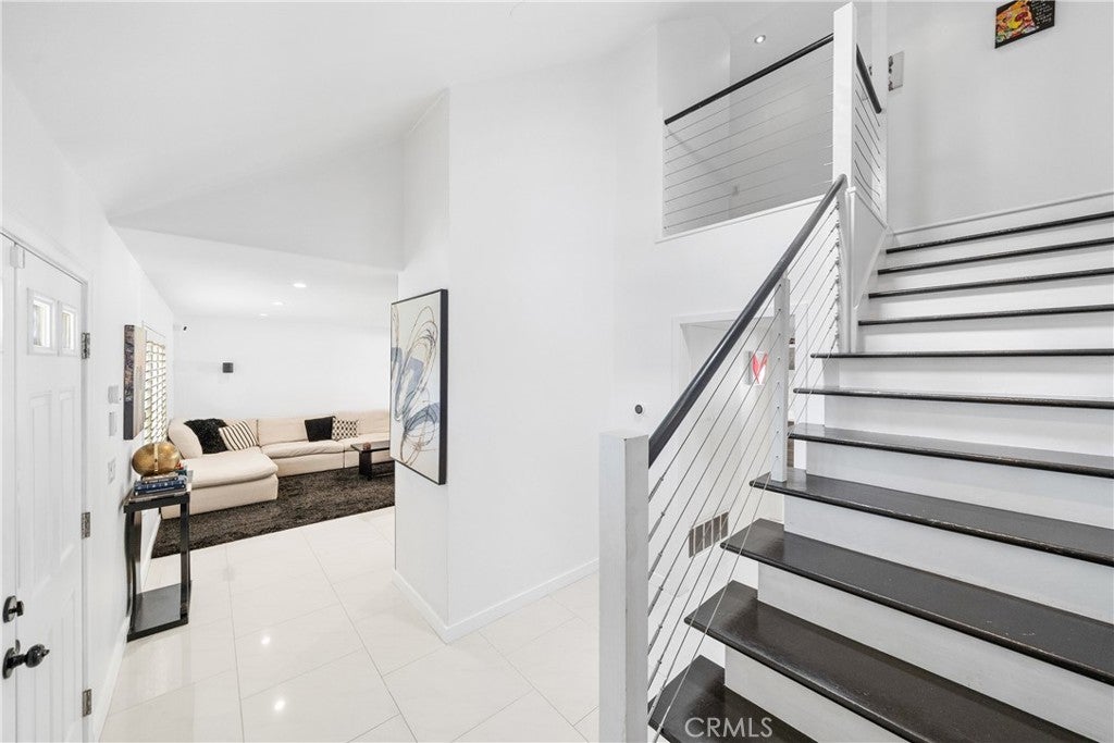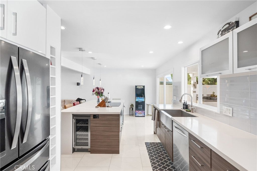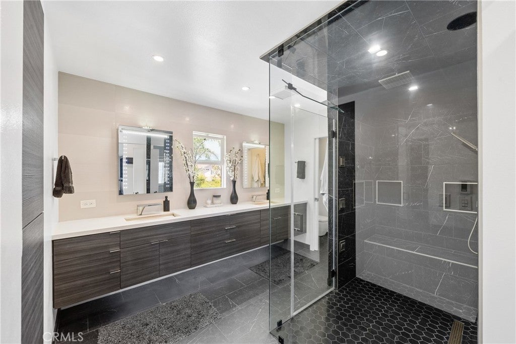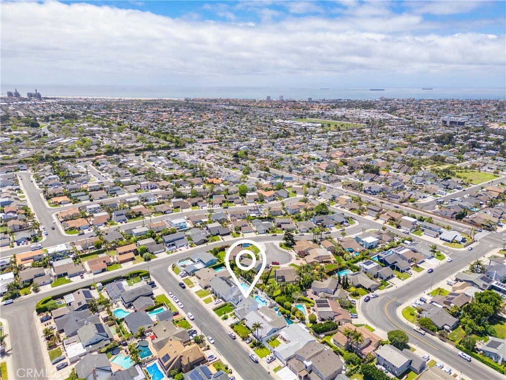 Welcome to this exceptional, renovated home blending high-end design, smart technology, and resort-style outdoor living. Located on a quiet interior street in the highly sought after Moffett tract, this home truly has it all. Every detail has been thoughtfully curated—from the reimagined front yard with lush landscaping, low-maintenance turf, new King palm, privacy fencing, and app-controlled irrigation system—to the stunning indoor and outdoor upgrades. The entry porch features stylish, no-slip tile, while the upgraded garage includes vinyl flooring, a smart door system, new water heater, and washer/dryer. Inside, the open-concept main level showcases heated Italian porcelain tile flooring and a show-stopping kitchen with a custom Italian quartz island, built-in convection oven, sensor glass cooktop, downdraft vent, microwave drawer, and sleek soft-close cabinetry in walnut and fingerprint-resistant gloss white. Under-cabinet LED lighting with app-controlled color options completes the modern aesthetic. Large sliding doors open to a true backyard retreat: a custom-built BBQ island with fridge, sink, gas grill, side burner, storage, ambient lighting, and two seating areas. Entertain with ease around the gas fire-pit or waterproof outdoor TV, or unwind in the state-of-the-art salt water pool and spa, featuring massage jets, a waterfall, Baja step, upgraded heater, and app-controlled lighting—all surrounded by lush landscaping and a new brick paver patio with a cozy daybed. The main floor includes a bedroom and beautifully updated bathroom with white marble-look tile, matte black fixtures, and a rain shower. Upstairs, the luxurious primary suite offers heated floors and a huge walk-in closet with custom built-ins and a frosted glass barn door. The spa-inspired bathroom features black porcelain tile, gold fixtures, a Kohler digital steam shower with six body sprays, bluetooth speakers, dual waterfall sinks, invisible drains, and floating walnut vanities with under-cabinet lighting. A third spacious bedroom includes an en suite bath, large closet, and sweeping views of the pool and Huntington Beach sunsets. This home also features a whole-house Sonos sound system (app-enabled) for seamless indoor and outdoor audio in the living room, primary suite, and patio. With so many features, this home is a must see and is the epitome of SoCal living near the beach, top-rated schools, shopping, dining, and entertainment.