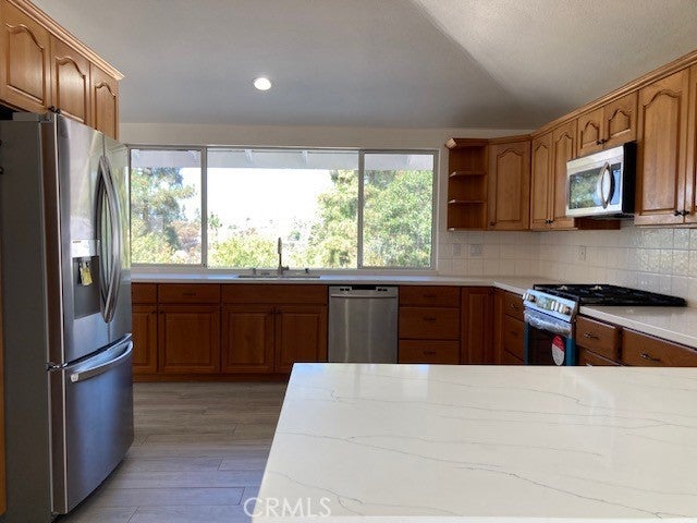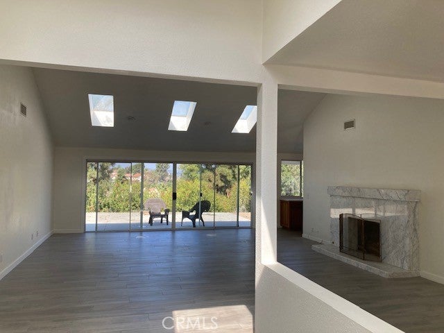 This lovely single level family home, located on an open view lot, on a cul-de-sac, close to a local charter school is ready for you. There are 4 spacious bedrooms, 2 1/2 bathrooms with a large living room and adjacent dining area. The family room is adjacent to the roomy kitchen which has a recent built-in refrigerator & micro, a brand new stove, dishwasher & quartz counter tops. The cabinets are natural stained cherry wood. The electrical and copper plumbing are changed throughout. 2 fireplaces accommodate the living room and family room. There are oversized sliding doors in the family & living rooms and master bedroom. There is a sky light in the entry and the living room has 3 of them in the vaulted ceiling up to the roof line-so open with its sliding doors and windows across the back of the room. There are recessed lights throughout the home and it is air conditioned. Both bathrooms have brand new double sinks, fixtures and lights and there is a half bathroom off the family room area. Flooring is wood look tile throughout. The over sized 2 car garage has a recent water heater and brand new washer & dryer. Owner will coordinate with new lessor to install custom landscaping. Beaches, shopping and freeway, toll road are close at hand. Pets will be screened.