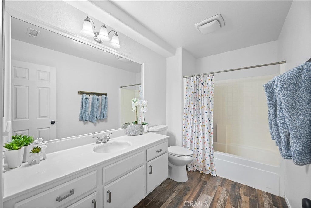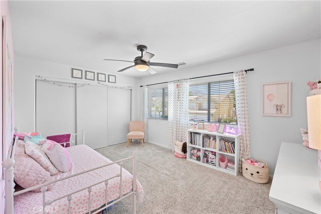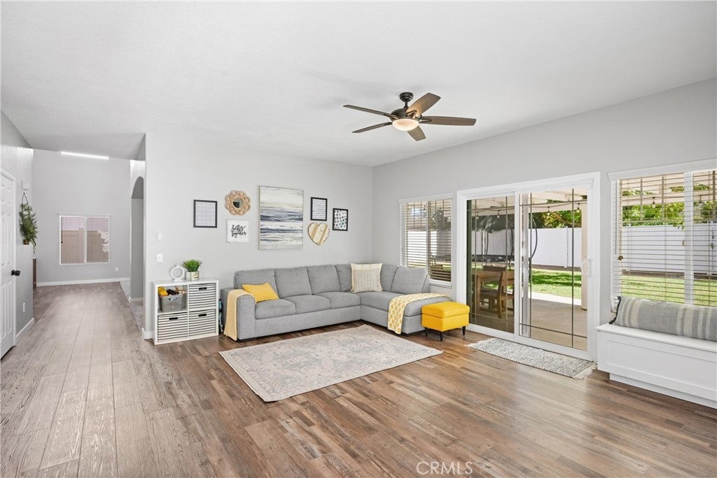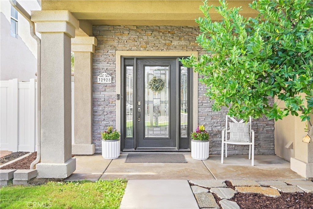 Welcome to this beautifully maintained 4-bedroom, 2.5-bath home offering 2,632 sqft of well-designed living space. Situated on a spacious interior lot within the Hidden Creek community in Wildomar, this home combines functionality, style, and efficiency. A charming covered porch and elegant glass-paneled entry lead into a tastefully designed interior brimming with natural light, soaring ceilings, and an open floor plan. The updated kitchen features modern appliances, designer touches, and a direct flow to the family room, making it perfect for both entertaining and everyday living. A custom stone fireplace and built-in cabinetry add warmth and character to the main level. Enjoy comfort year-round with energy-efficient solar panels, newer vinyl double-pane windows upstairs, a whole-house fan, and a tankless water heater. The exterior impresses with a widened driveway offering a 3-car garage with epoxy flooring, RV parking, and a covered patio that opens to a tastefully arranged backyard ideal for gatherings and outdoor dining. Thoughtful upgrades include a water drainage system for optimal yard care and low-maintenance living. Set on a generous 7,405 sqft lot with no HOA, this home offers the perfect balance of modern upgrades, energy-conscious features, and convenience.