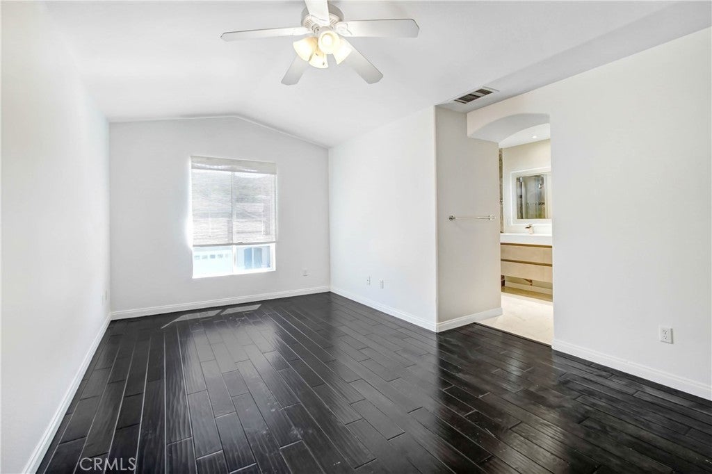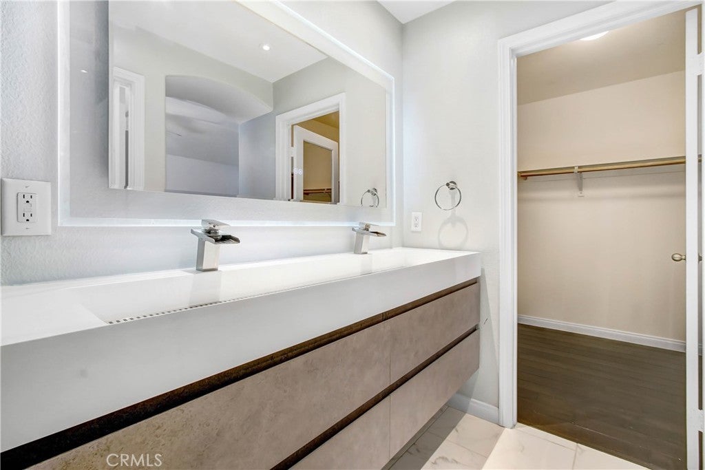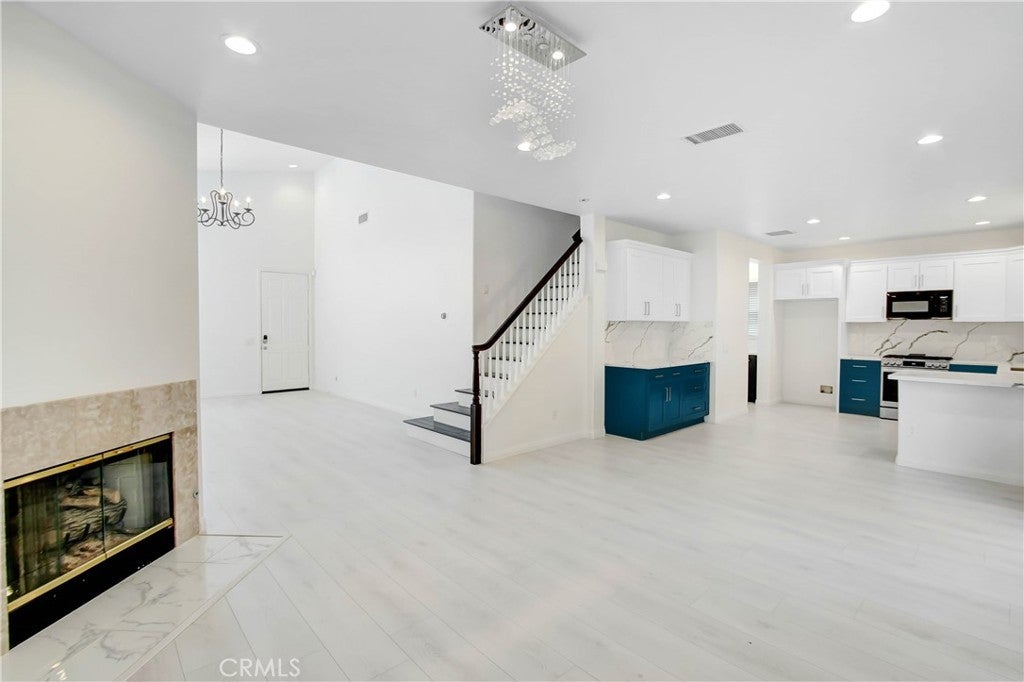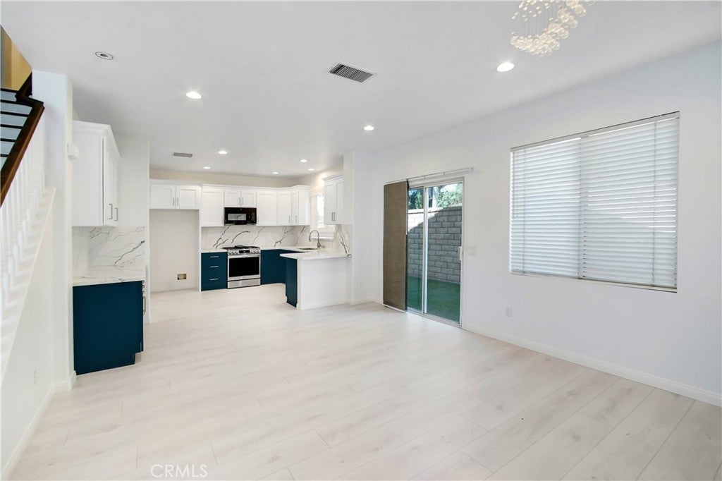 Welcome to an exceptional opportunity in Santa Clarita! This beautiful residence, boasting 3 bedrooms and 2.5 bathrooms, offers ample space for comfortable living. As you step inside, recessed lighting throughout creates a warm and inviting ambiance, complementing the airy kitchen—a chef's dream with its blue and white shaker cabinets, quartz countertops, and backsplash. Equipped with stainless steel appliances, including a farm sink and gas range, the kitchen seamlessly blends style with functionality. But there's more to love about this home. The main floor features a modern half bath with a floating vanity, enhanced by sleek OLED mirrors. Nest central air and heat ensure year-round comfort, while the newly painted interior adds a fresh touch to the home's aesthetic. Upstairs, the primary bedroom retreat awaits, complete with a ceiling fan, walk-in closet, and a beautifully tiled en-suite bathroom featuring a dual sink modern vanity and multi-jet shower system. Convenience is elevated with upstairs laundry, making chores a breeze. Additionally, a home office nook provides the perfect space for productivity or relaxation. Throughout the upstairs, elegant cherry wood flooring graces the hallways and bedrooms, adding warmth and character to every space. Artificial turf in both the front and back yard to enjoy a lush, green landscape year-round with minimal maintenance. Embrace the essence of modern living and make this exquisite residence your new home sweet home.