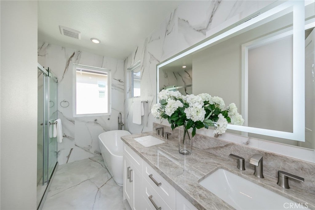 5 BED + 2 Main Master Room (down and up)+ LOFT | GUARD-GATED ALTAIR Stunning two-story home in the prestigious 24-hour guard-gated Altair community. Features 4 bedrooms, 4.5 baths, a spacious loft, and 2 Main Mater Room ideal for a home office and loft . The gourmet kitchen boasts a large island, built-in refrigerator, 6-burner cooktop, and ample cabinets, opening to the dining and living areas for seamless entertaining. First-floor bedroom with en-suite bath is perfect for guests. Upstairs includes a loft, laundry room, two secondary bedrooms, and a luxurious primary suite with dual walk-in closets, soaking tub, and separate shower. Designer upgrades include hardwood floors, crown molding, and plantation shutters. Professionally landscaped backyard provides a private space for outdoor gatherings. Altair offers resort-style amenities including pools, spas, parks, clubhouses, tennis courts, and playgrounds. Conveniently located near Great Park, Woodbury, Irvine Spectrum, shopping, dining, John Wayne Airport, and award-winning Irvine schools.