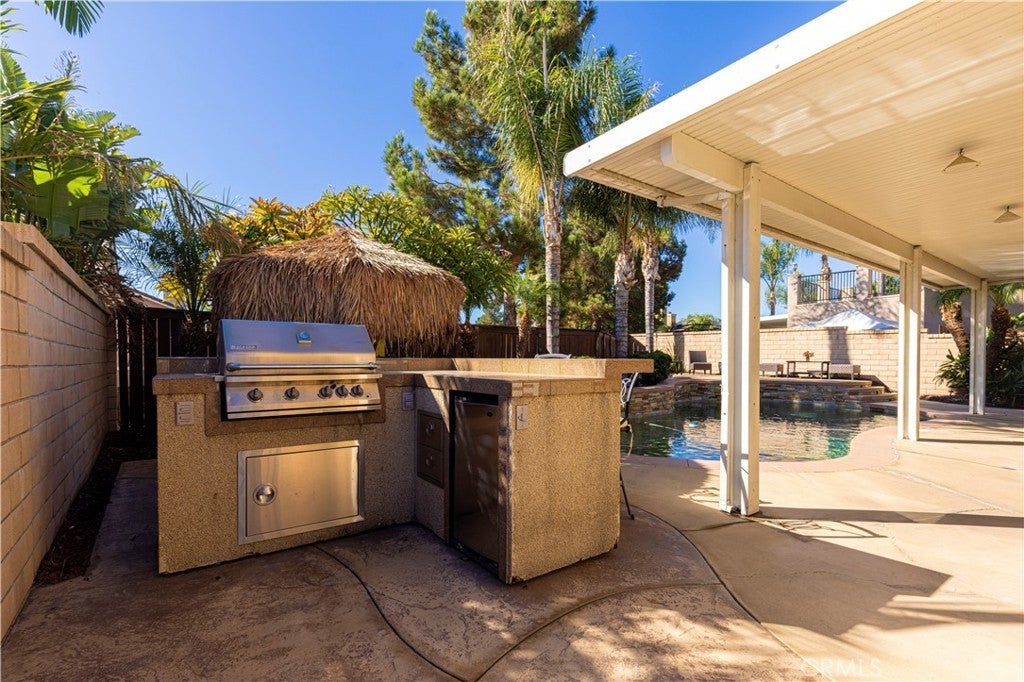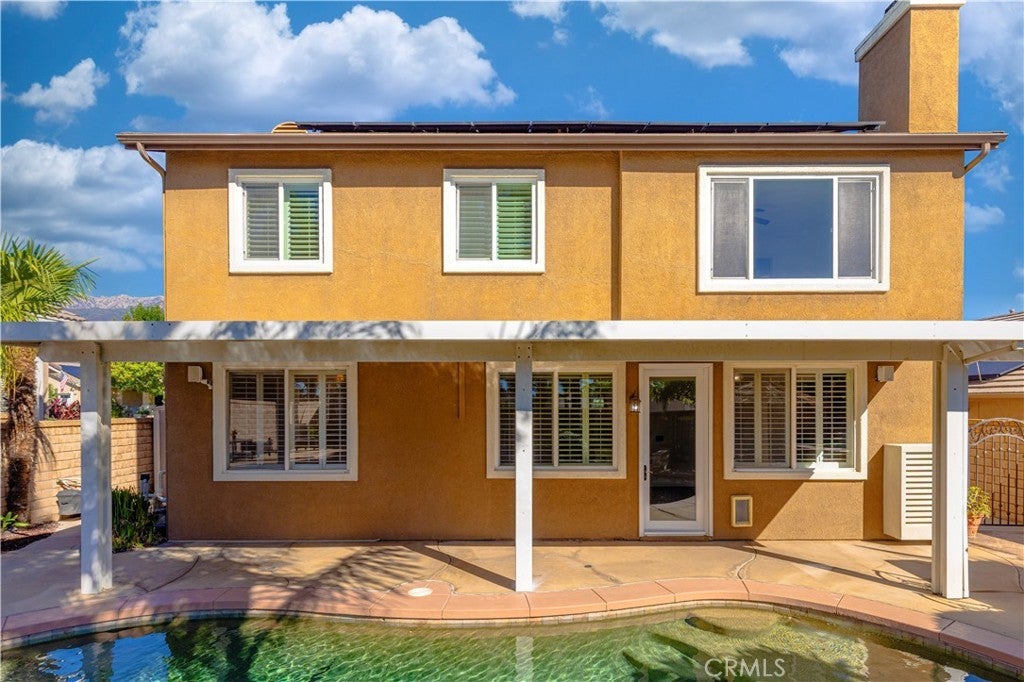 Exquisite Luxury Home with Resort-Style Backyard Oasis! Welcome to this stunningly upgraded residence nestled in one of Rancho Cucamonga’s most sought-after neighborhoods, within the award-winning Etiwanda School District. Ideally positioned just steps from the scenic Pacific Electric Trail, this exceptional home perfectly blends sophistication, comfort, and convenience, designed to complement today’s active yet refined lifestyle. Step inside to discover beautifully appointed interiors featuring custom natural slate flooring, elegant crown molding, and detailed baseboards throughout. The open-concept design offers multiple living spaces, including two generous family rooms, a formal dining area with finished with stylish SPC vinyl flooring that beautifully replicates the warmth and texture of real wood, and a chef’s kitchen, perfect for entertaining and everyday living alike. The kitchen is a true showpiece, boasting premium appliances including a FOTILE range hood, sleek quartz countertops, and seamless access to the breathtaking backyard retreat. Unwind in the inviting family room with its stone-accented entertainment wall and fireplace, or escape to your private outdoor paradise. The resort-inspired backyard showcases a sparkling in-ground pool and spa, a covered patio, a fully equipped outdoor kitchen, and a charming Hawaiian-style seating area, ideal for year-round relaxation and entertaining. The thoughtfully designed layout includes a private first-floor guest room, while the elegant wrought-iron staircase leads to an expansive upper level featuring a loft retreat, luxurious primary suite, and two additional bedrooms. Additional highlights include an energy-efficient solar system, custom built-in closets, plantation shutters, outdoor furniture and sound system throughout, offering both style and substance at every turn. This move-in-ready home truly checks every box, combining timeless design, modern upgrades, and exceptional value. Why settle for less when this rare gem already has it all?