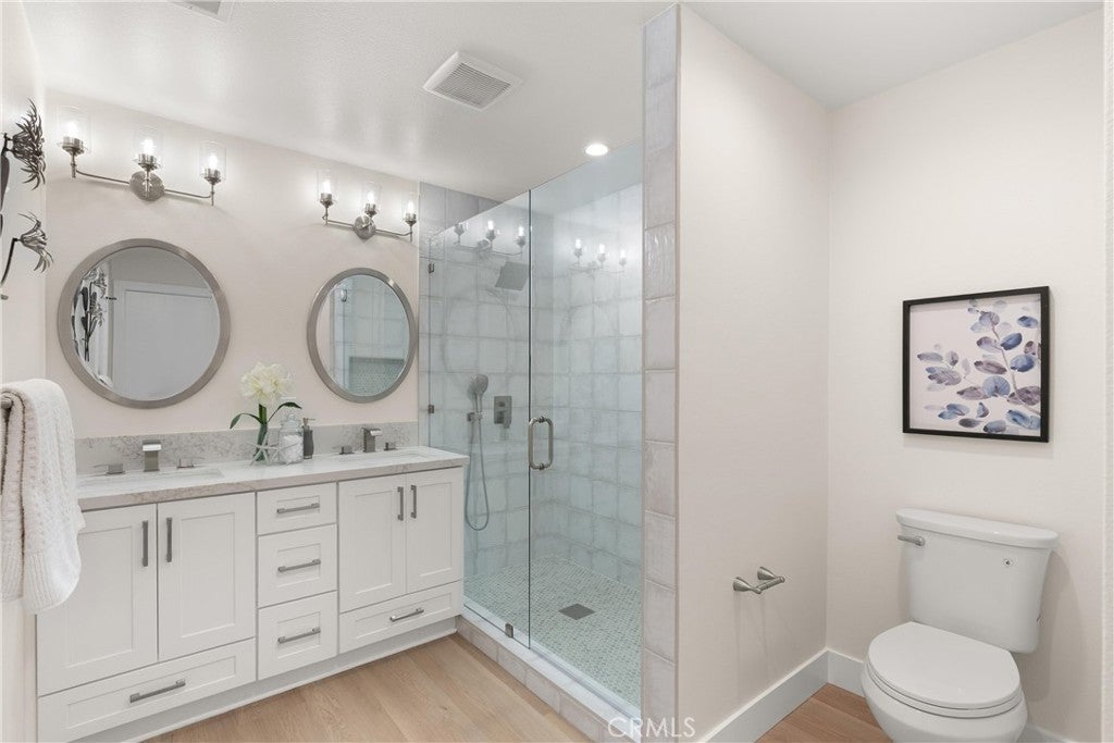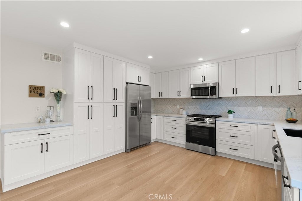 You can stop chasing homes that are missing the mark. 619 S Shields Drive is exceptionally remodeled and redesigned for modern living. From the outside, this home is a large charming, classic tract home located in a nice neighborhood in Anaheim plenty of curb appeal. Now, the inside of this home is anything but classic; it has been fully remodeled top to bottom, with high-end modern finishes throughout. Once inside, you are welcomed in by new custom tile work leading you to the large, separate living room. This space feels light and bright with its large picture window, and a beautifully redone fireplace finished with custom tiles and wood mantle. On the other side of the entry is one of large 2 downstairs bedrooms that are designed with privacy in mind, with the largest one currently set up as a family room. The luxury flooring throughout the home is elegant and worry free. The star of this home is the completely custom and re-designed kitchen that features white shaker cabinets, stainless steel appliances, herringbone style backsplash, quartz countertops, soft closing drawers, and lazy susan for additional storage. And you’ll have the perfect flow from the kitchen to the backyard, making entertaining a breeze. The downstairs bathroom also received a major remodel with a large custom walk-in shower accented by custom tile work, and a double sink vanity for extra convenience. And the second downstairs bedroom has direct access to this bathroom, so it feels like a master suite. Upstairs, there are 3 more large bedrooms and an updated hall bathroom with plenty of space. The home sits on an expansive lot with room for a pool. In addition, this home can accommodate all your parking needs, with an expansive driveway perfect for cars, trucks, RVs, AND a 3 car garage with a pull-thru door into the backyard. No detail or finish was missed in this home, including features like: brand new central heating and air, new windows and doors, fresh paint throughout, ceiling fans and recessed lighting added to all bedrooms, and sprinkler system added to front and rear. So if you’re looking for a large, custom, turnkey home in Anaheim, schedule your tour today!