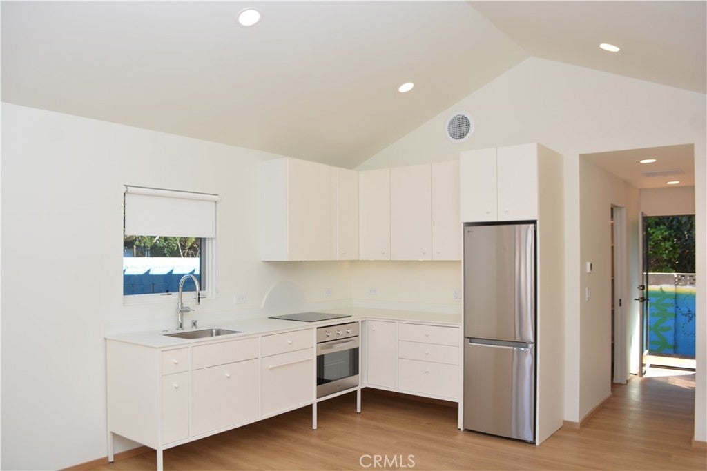 Be the very first to live in this brand new Samara manufactured ADU. Great attention to detail both inside and out. Owner was sensitive to maximizing privacy for both homes. Dual pane windows, stone plank flooring, and neutral paint throughout. Studio great room has cathedral ceilings, recessed lights and French doors out to deck. Kitchen includes all appliances: induction cooktop, convection oven, refrigerator, and drawer dishwasher. Kitchen has ample upper and lower cabinetry for storage. Hall includes built-in closet system with hanging space, built-in dresser, and shelving. Bathroom features walk-in shower, stone counters, and built-in linen storage. Unit was just built in 2025. Has heat-pump, high efficiency heating and cooling but also open west facing window and French doors and take in the ocean breezes. Locked, gated entrance with own secure mailbox on Orion Dr. Street parking. Located in a quiet, mixed residency neighborhood featuring everything from 4-plexes to multi-million dollar homes. Three quarters of a mile to beach as the crow flies. Close to Bolsa Chica Wetlands and associated walking trails. Retail services 1/2 mile away in Harbour Village including Trader Joe's. Rent includes water, electricity, wi-fi, and trash.