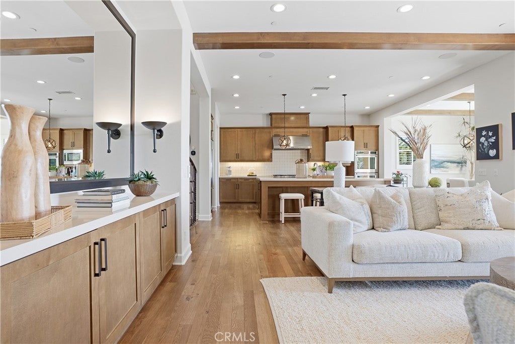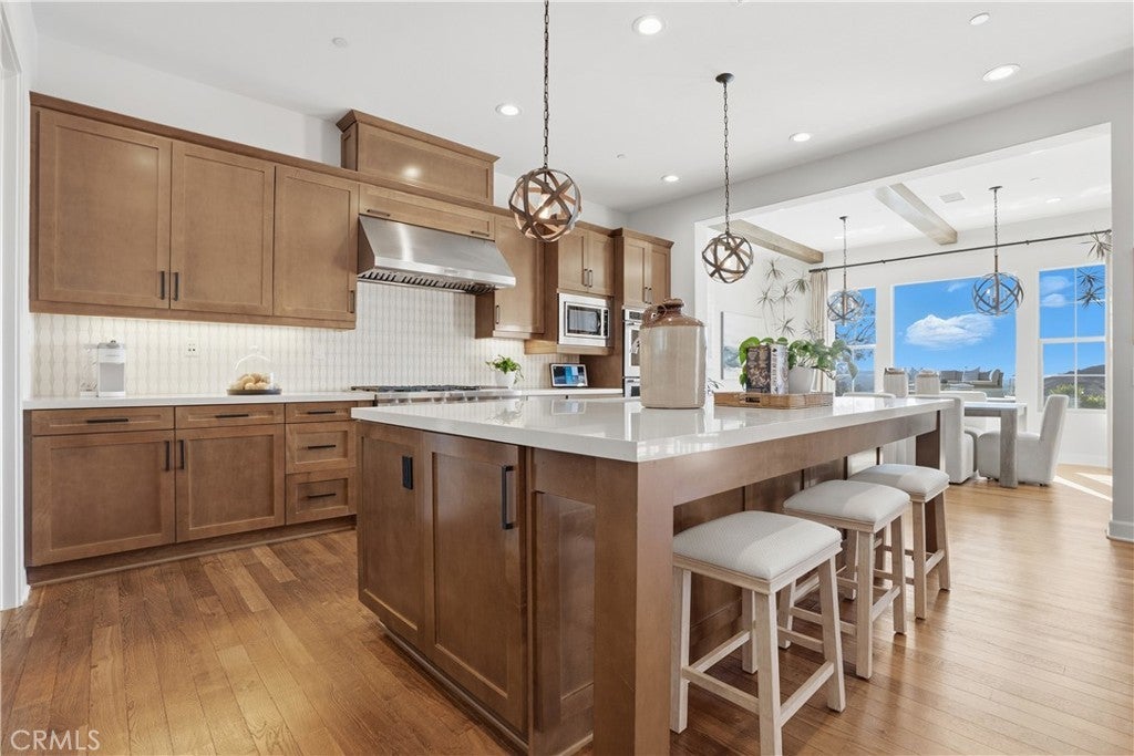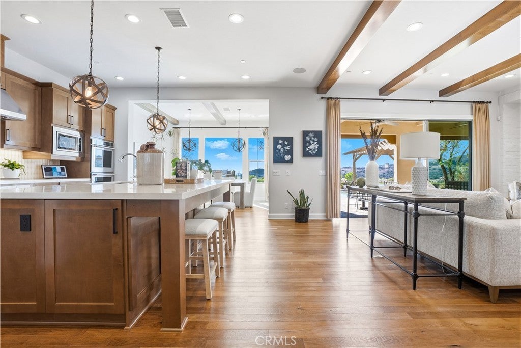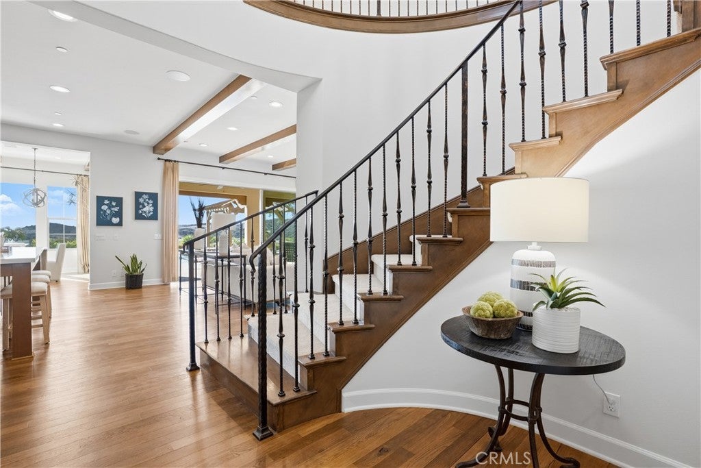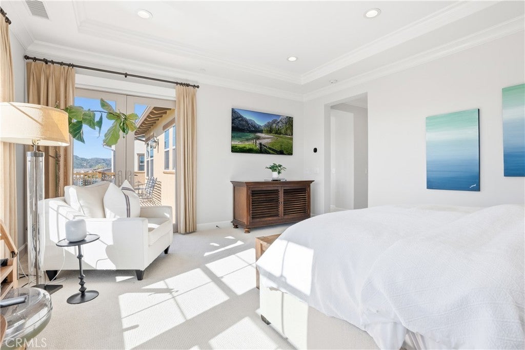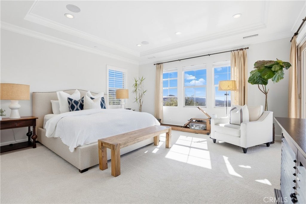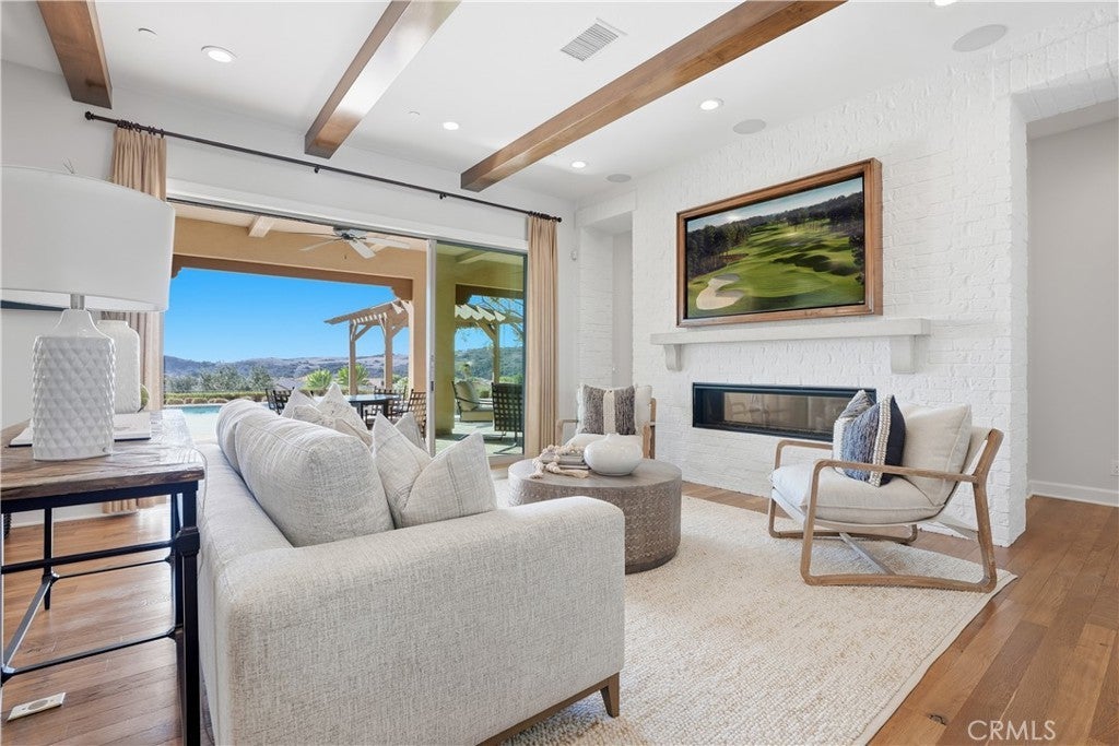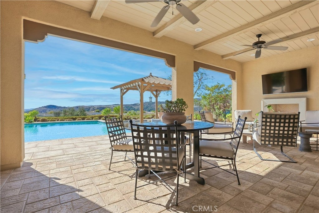 Looking for a pool VIEW home in Aubergine, right here in the award-winning community of Rancho Mission Viejo? This one’s a gem, tucked on one of the quietest view streets in RMV, where ocean breezes roll in every afternoon. It’s the kind of spot that reminds you why life in RMV feels like a staycation every day. This former MODEL HOME defines resort style living at its finest and is set on an 8,379 sq ft ideal lot. This professionally designed Adobe Ranch style model home showcases high-end craftsmanship and resort-style living in the heart of Rancho Mission Viejo. Featuring 4 bedrooms, 4.5 baths, a private office, and an upstairs loft, this residence blends sophistication with everyday comfort. Step inside to a grand entry with a sweeping iron staircase that sets the tone for elegance throughout. The chef’s kitchen impresses with a large kitchen island, walk-in pantry, custom maple shaker cabinetry, stainless steel appliances, upgraded quartz countertops, and a designer tile backsplash. The kitchen flows seamlessly into the spacious great room with fireplace and formal dining area, creating the perfect space for hosting and gathering. Upstairs, each bedroom features its own en-suite bath, while the primary suite offers a true retreat complete with a spa-inspired bath, expansive walk-in closet, and a private balcony overlooking ocean-facing sunsets toward Dana Point. Designed for the ultimate indoor-outdoor lifestyle, stacking glass doors open to an expansive California Room with fireplace and TV, extending to a private backyard oasis featuring a great size pool, sunken fire pit lounge, and panoramic quiet views. Every inch of this Tri Pointe model home is enhanced with designer upgrades, thoughtful details, and curated finishes offering a rare opportunity to own one of Rancho Mission Viejo’s most coveted showcase properties. The interior of the home was just painted as well as new carpet upstairs. Exclusive to Rancho Mission Viejo residents are all amenities in the Villages of Sendero, Esencia, Rienda, and future Villages. There are community amenities for all from breath-taking resort-style pools and spas, Esencia school K-8, community farms, fitness centers, guest house, putting green, bocce ball courts, tennis and pickle ball courts, playgrounds, coffee shop, fire pits, an arcade and so much more!