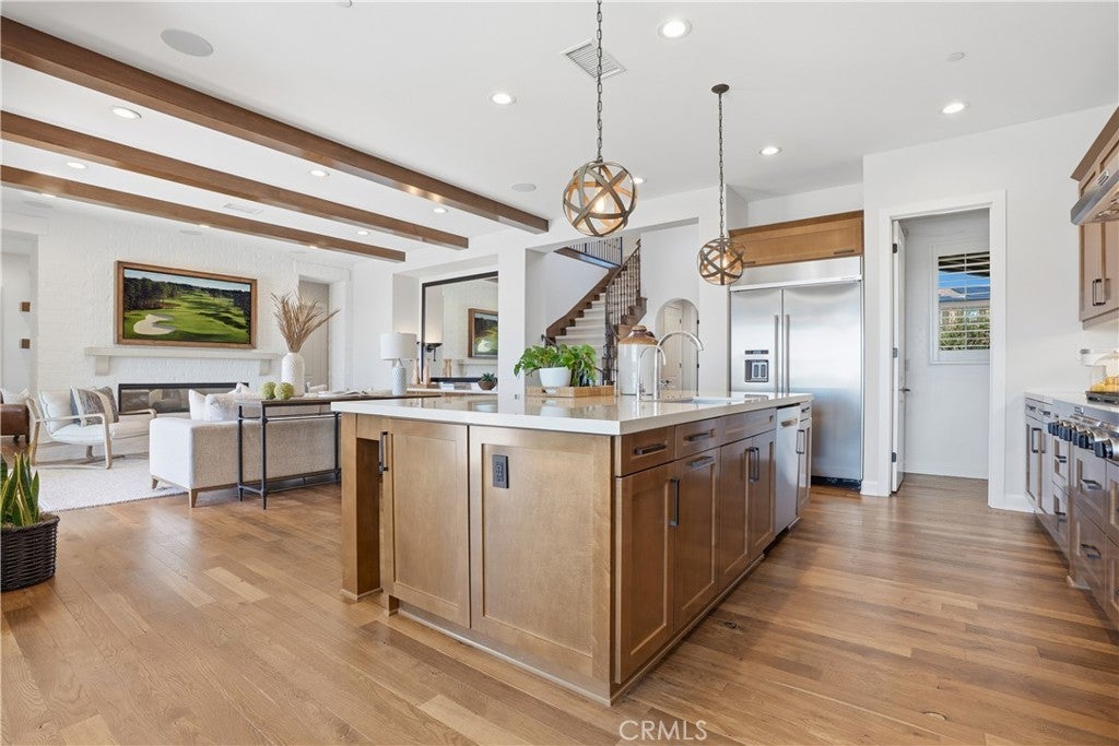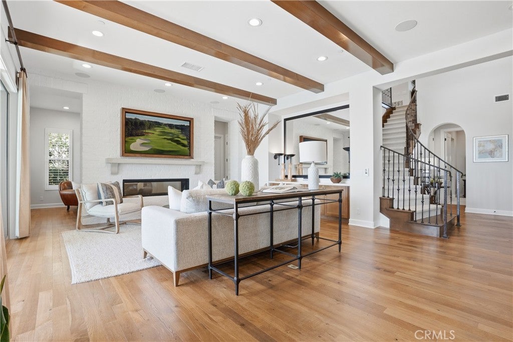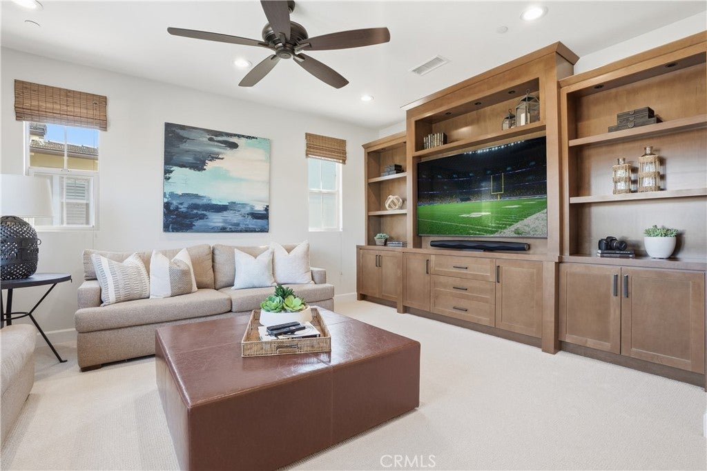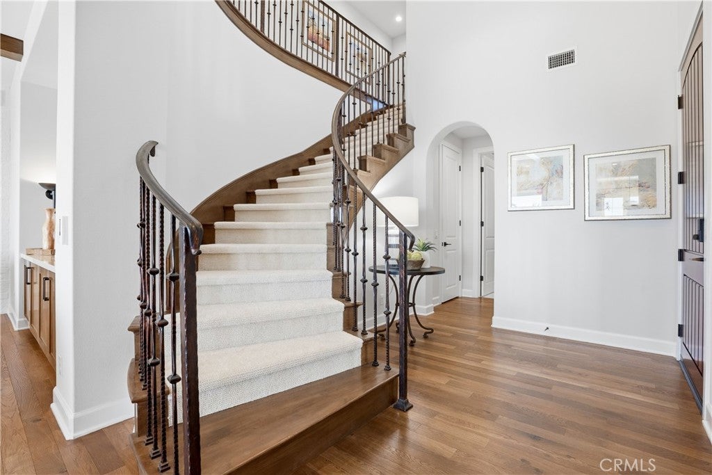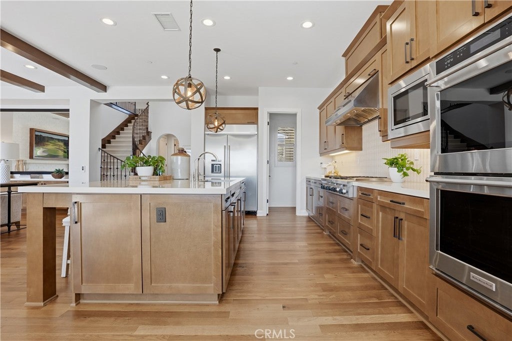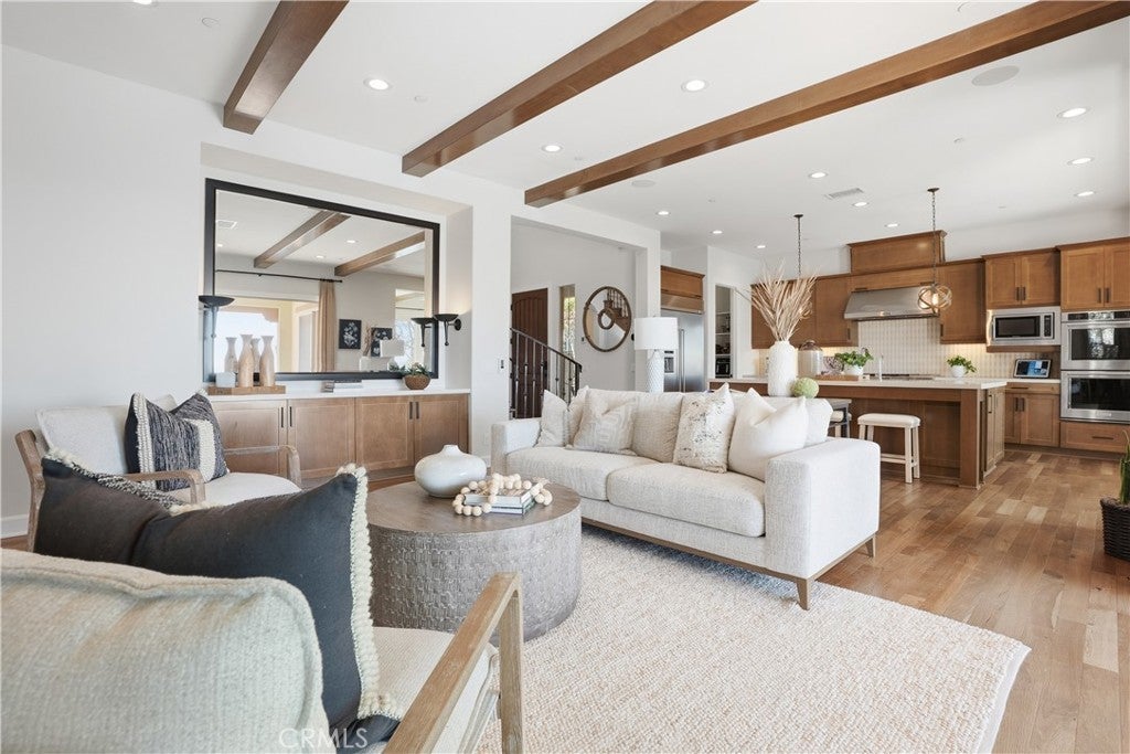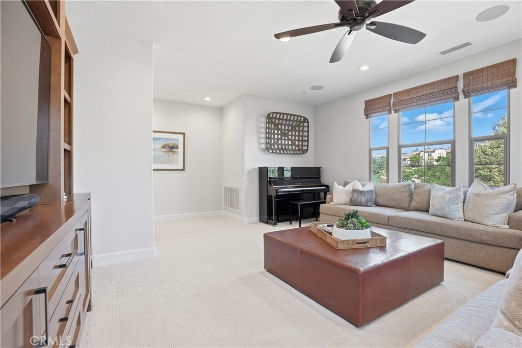 Looking for a pool VIEW home in Aubergine, right here in the award-winning community of Rancho Mission Viejo? This one’s a gem, tucked on one of the quietest view streets in RMV, where ocean breezes roll in every afternoon. It’s the kind of spot that reminds you why life in RMV feels like a staycation every day. This former MODEL HOME defines resort style living at its finest and is set on an 8,379 sq ft ideal lot. This professionally designed Adobe Ranch style model home showcases high-end craftsmanship and resort-style living in the heart of Rancho Mission Viejo. Featuring 4 bedrooms, 4.5 baths, a private office, and an upstairs loft, this residence blends sophistication with everyday comfort. Step inside to a grand entry with a sweeping iron staircase that sets the tone for elegance throughout. The chef’s kitchen impresses with a large kitchen island, walk-in pantry, custom maple shaker cabinetry, stainless steel appliances, upgraded quartz countertops, and a designer tile backsplash. The kitchen flows seamlessly into the spacious great room with fireplace and formal dining area, creating the perfect space for hosting and gathering. Upstairs, each bedroom features its own en-suite bath, while the primary suite offers a true retreat complete with a spa-inspired bath, expansive walk-in closet, and a private balcony overlooking ocean-facing sunsets toward Dana Point. Designed for the ultimate indoor-outdoor lifestyle, stacking glass doors open to an expansive California Room with fireplace and TV, extending to a private backyard oasis featuring a great size pool, sunken fire pit lounge, and panoramic quiet views. Every inch of this Tri Pointe model home is enhanced with designer upgrades, thoughtful details, and curated finishes offering a rare opportunity to own one of Rancho Mission Viejo’s most coveted showcase properties. The interior of the home was just painted as well as new carpet upstairs. Exclusive to Rancho Mission Viejo residents are all amenities in the Villages of Sendero, Esencia, Rienda, and future Villages. There are community amenities for all from breath-taking resort-style pools and spas, Esencia school K-8, community farms, fitness centers, guest house, putting green, bocce ball courts, tennis and pickle ball courts, playgrounds, coffee shop, fire pits, an arcade and so much more!