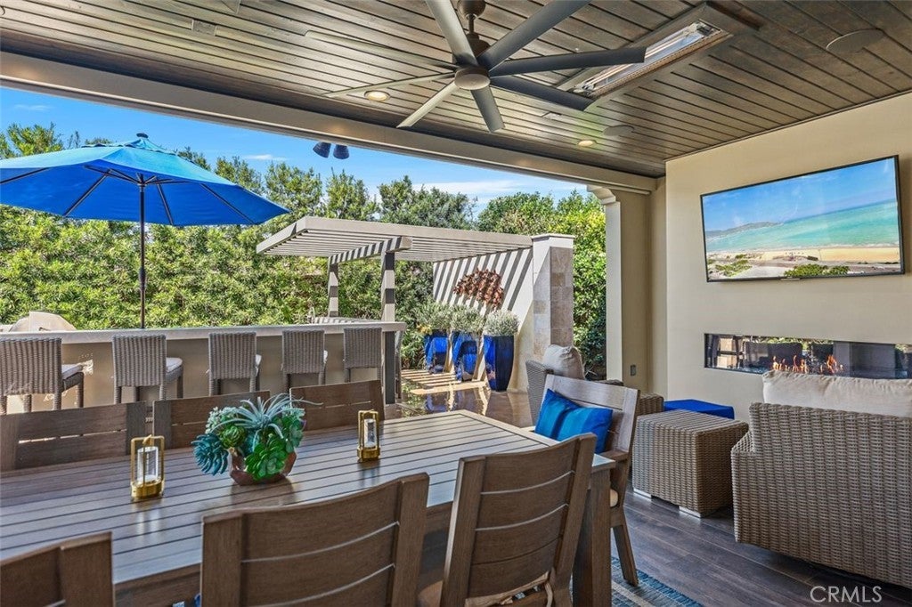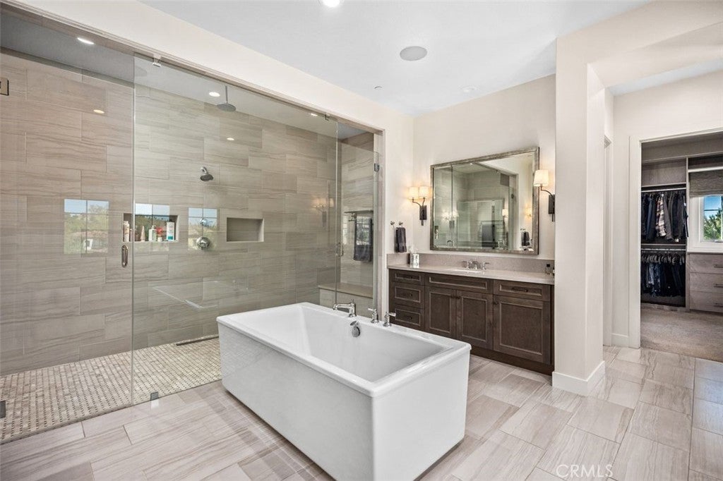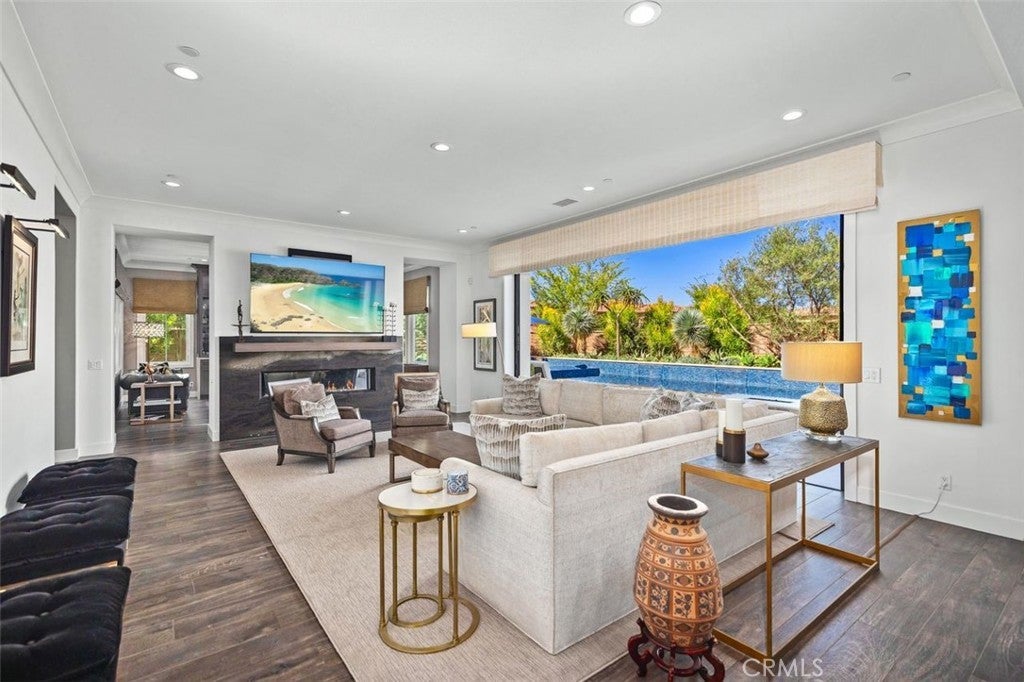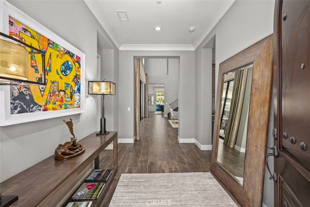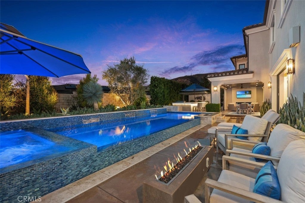 Nestled Amongst Tranquil Avocado Orchards and Rolling Hills, This Extraordinary Alta Vista Residence Embodies the Pinnacle of Modern California Luxury. Perched on an elevated corner lot with commanding hillside views, 116 Knob Creek rests within the exclusive Vistas enclave at The Groves of Orchard Hills. Boasting over $1 million in interior and exterior upgrades, this modern architectural masterpiece blends refined sophistication with effortless indoor-outdoor living. From the moment you arrive, the home’s modern interpretation of Spanish Colonial architecture is framed by lush landscaping, citrus trees, and a welcoming pedestrian approach. Inside, more than 6,000 square feet of open-concept living unfolds beneath soaring ceilings, where abundant natural light connects the interiors to serene surroundings. The dramatic foyer introduces a spectacular formal dining room with clerestory windows rising over twenty feet, flanked by dual glass staircases with sleek steel accents. Perfect for entertaining, this grand space opens to a private courtyard with a tranquil wall fountain. The magnificent great room, anchored by a 60-inch stone-clad linear fireplace, flows seamlessly to a resort-style California Room designed for alfresco gatherings. The chef’s kitchen is a showpiece appointed with Sub-Zero, Wolf, and Miele appliances, dual integrated refrigerator/freezers, quartz countertops, and custom Genoa cabinetry. Multiple pocket doors dissolve the boundaries between indoor and outdoor spaces, revealing a breathtaking backyard oasis. Outdoors, enjoy a full outdoor kitchen with Lynx professional BBQ, refrigerator, icemaker, and sink all overlooking a vanishing-edge quartz pool and 100 sq. ft. spa finished in luminous blue glass tile. The dual-zone yard is framed by citrus and stone fruit trees, modern planters, and inviting lounge spaces perfect for poolside evenings. A main-level guest suite provides comfort and privacy, while four ensuite bedrooms reside upstairs. The luxurious primary suite captures sweeping hillside views reminiscent of the Tuscan countryside, featuring a spa-inspired bath, private retreat, and expansive walk-in closet. A spacious bonus room with a built-in media center completes the upper level. Additional highlights include a rare four-car garage with epoxy floors and custom cabinetry, designer lighting, Baldwin hardware, luxury flooring, and a comprehensive smart-home system with cameras, automated shades, and LED mood lighting.