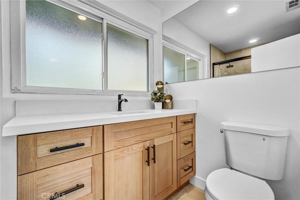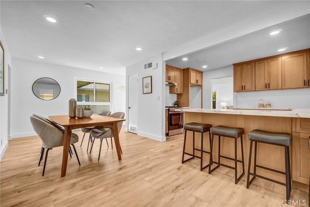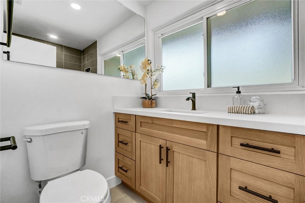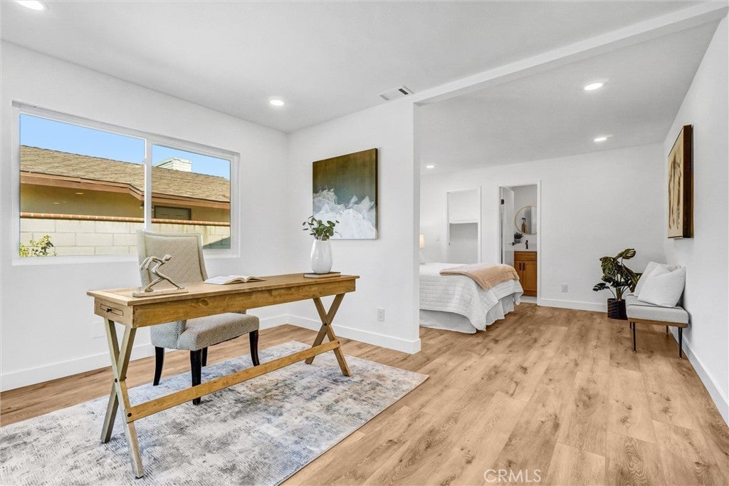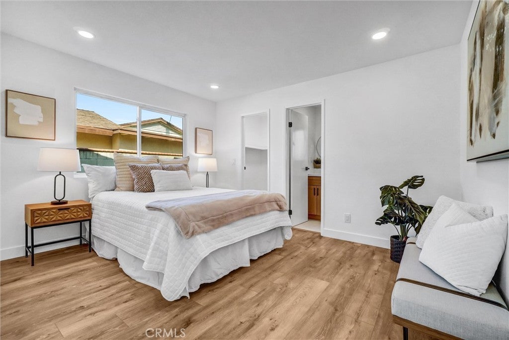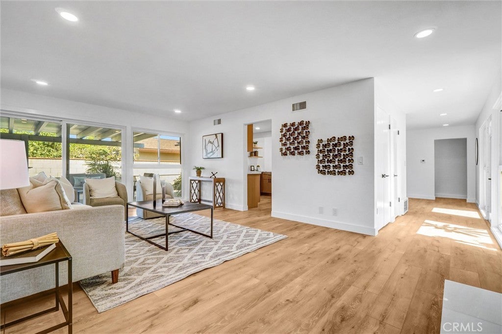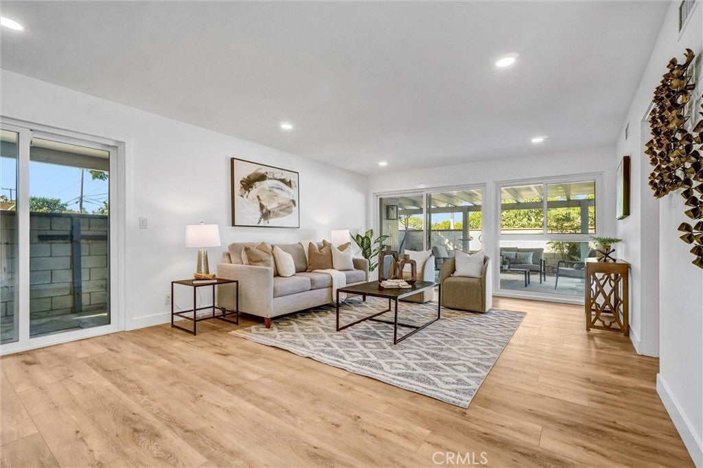 Beautifully upgraded corner-lot home featuring 4 bedrooms and 3 bathrooms, including 2 primary suites with luxurious, remodeled showers. The main primary suite offers a spacious bonus area perfect for a home office or nursery. Interior upgrades include luxury waterproof laminate flooring, recessed lighting, fresh interior paint, dual-pane windows, new baseboards, and central AC. The chef’s kitchen showcases oak cabinetry, high-end quartz countertops, peninsula seating, tile backsplash, and stainless steel appliances. The large living room boasts a gas fireplace with a custom tile wall and dual sliding doors leading to a covered patio and private backyard, ideal for entertaining. Additional highlights include 48 paid-off solar panels, a 4-car tandem garage (approx. 723 sq ft) with ADU potential, and RV parking measuring 50’x16’. Located in a desirable Anaheim neighborhood near parks, schools, shopping, and freeways. Move-in ready with modern finishes and endless potential!