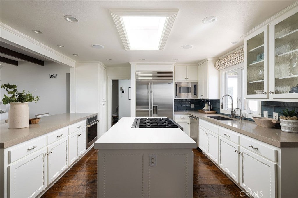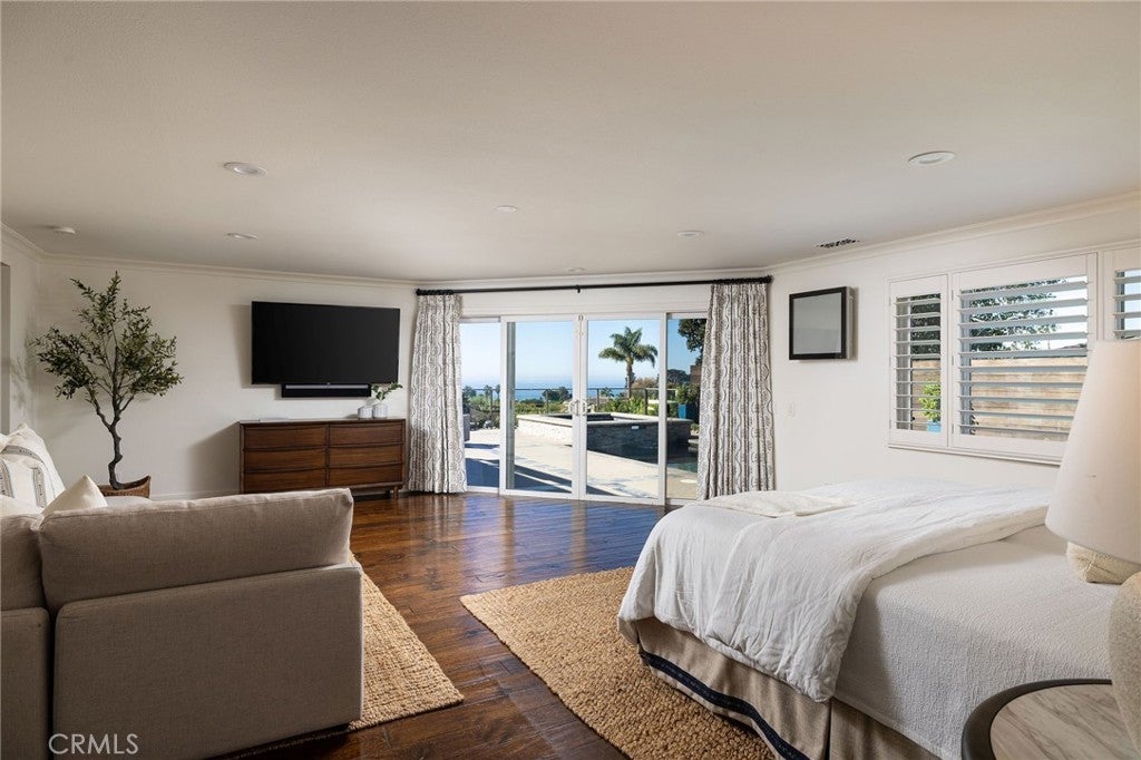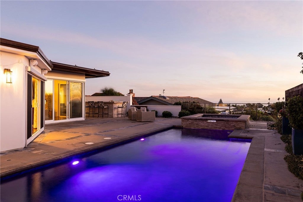 Coastal Elegance Meets Modern Luxury in Monarch Bay Terrace Perched in the prestigious enclave of Monarch Bay Terrace, this exquisitely designed single-level ranch-style residence epitomizes refined coastal living. With four spacious bedrooms, three luxurious bathrooms, and a dedicated home office, this private sanctuary blends timeless architecture with modern sophistication—all set against a backdrop of sweeping ocean views. Enjoy panoramic Pacific vistas from all main living areas and the serene master suite, where rich hardwood walnut floors run throughout the home, grounding each space in warmth and refinement. Retractable awnings and electronic vanishing screens soften indirect sunsets and offer effortless transitions between indoor comfort and outdoor splendor. Designed for seamless flow, the virtually stepless floor plan invites gentle ocean breezes and natural light into every corner of the home. The fully usable, secure flat lot is a rare gem in the community. Anchored by a state-of-the-art saltwater pool shored up on a concrete foundation, the outdoor living space has been intelligently crafted to maximize both utility and luxury. A detached cabana—fully outfitted for year-round comfort—offers a shaded retreat, while built-in storage discreetly supports the wraparound putting green and manicured grounds. Mature citrus trees grace the inland side of the home, complementing a fully equipped outdoor bar and grilling area that faces the ocean—perfect for entertaining with style and ease. Advanced 360-degree remote surveillance ensures total peace of mind, while smart design touches throughout the home reflect a commitment to elegance, innovation, and resort-caliber living. Every inch of this extraordinary home has been meticulously curated to deliver the ultimate in privacy, comfort, and coastal sophistication.