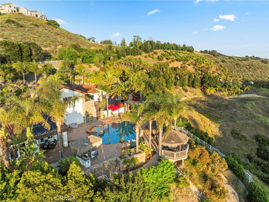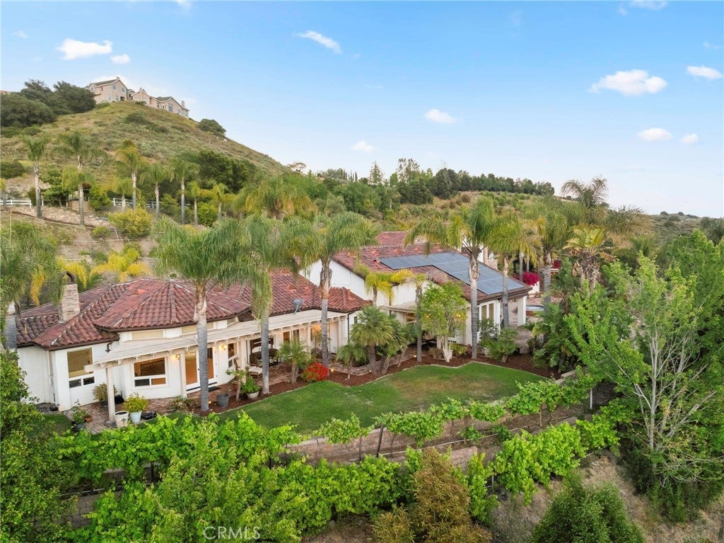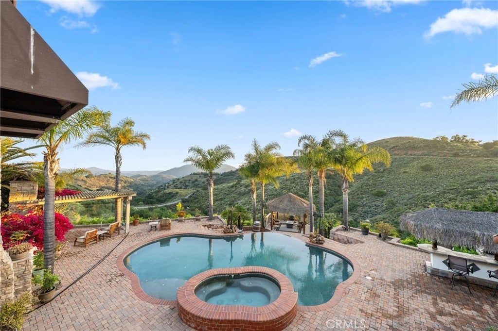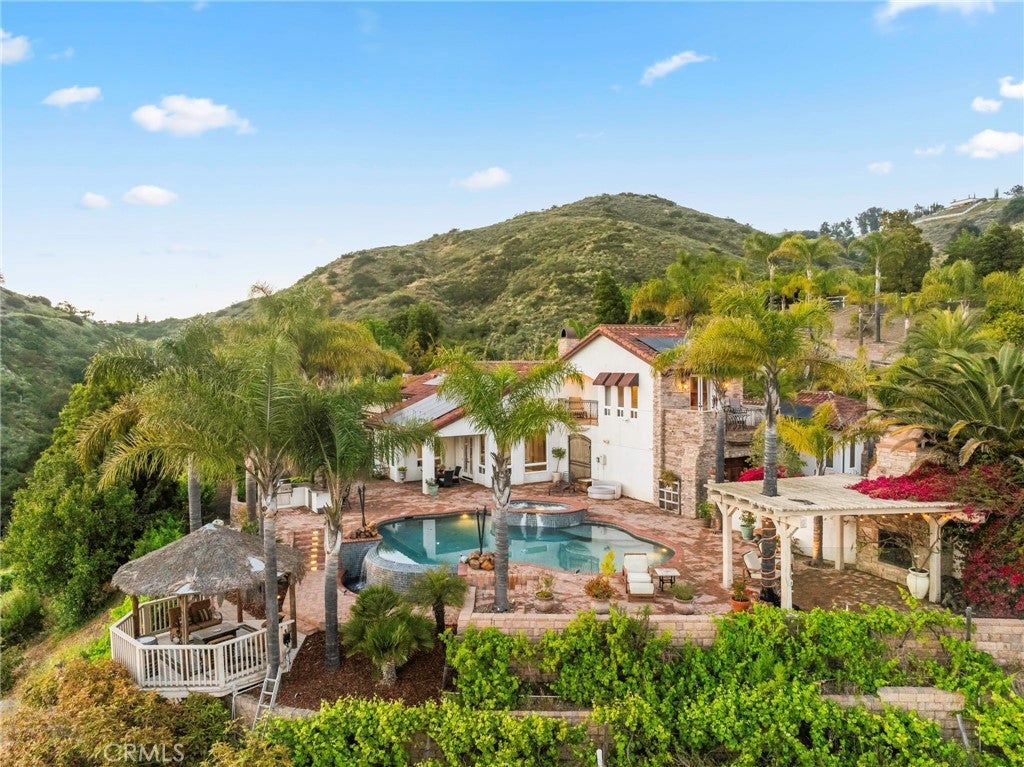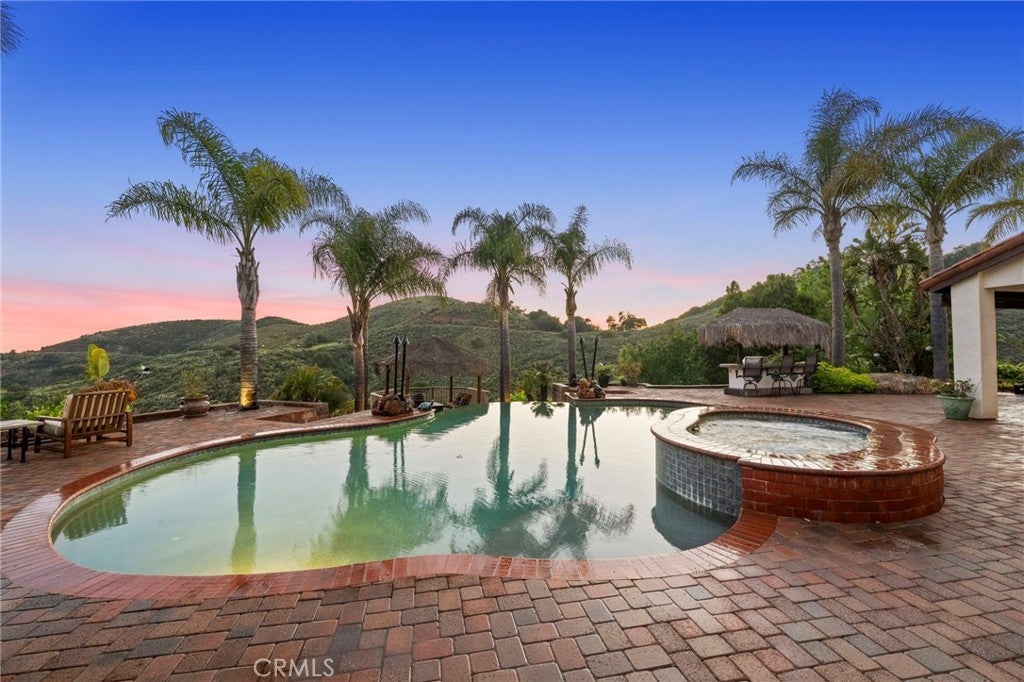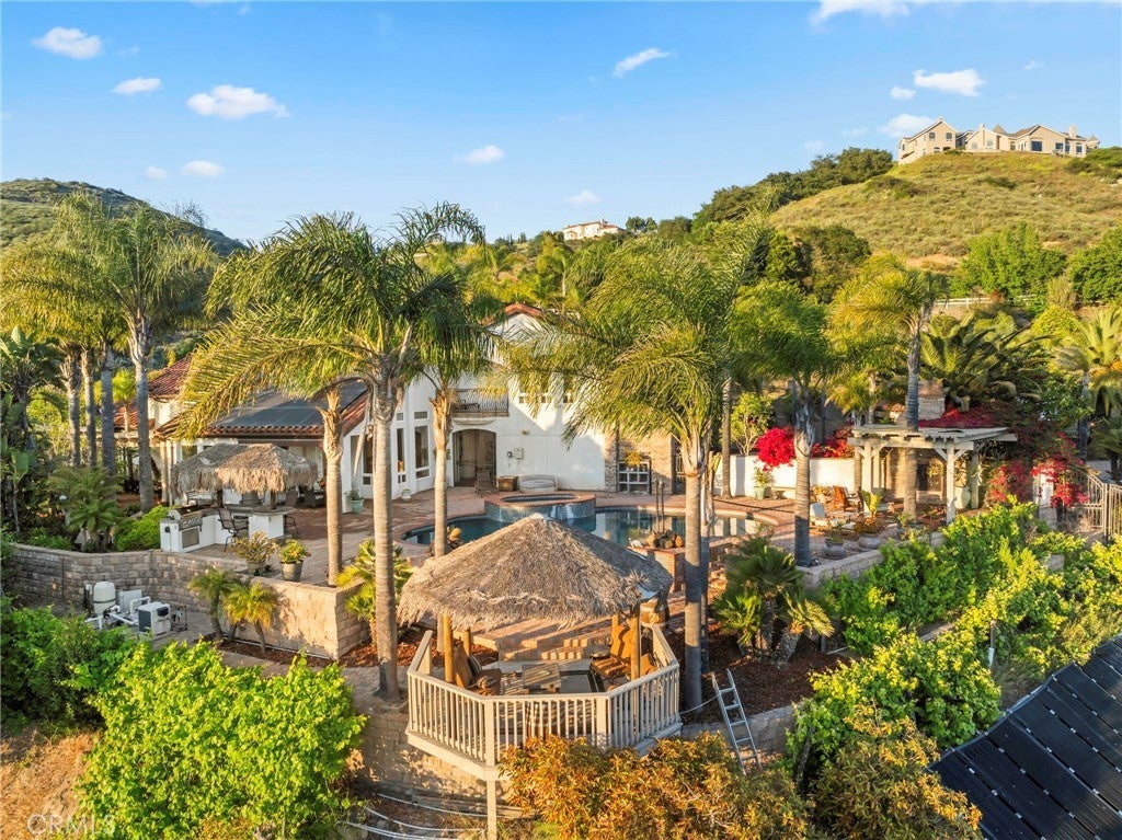 Welcome to 44915 Palladian in the beautiful De Luz community in the hills above Old Town Temecula, tucked away in one of the most premiere privately gated communities in the Temecula Valley, Renaissance Estates. This luxury estate property on almost five acres is thoughtfully laid out with over 4400 square feet of living space, arriving through your very own private electric gate entrance. Beautiful gourmet kitchen with an abundance of wood cabinets and a six-burner Viking stove, Sub Zero refrigerator, and a large walk-in pantry. The main house features a huge master suite with a spacious master bath, including your own two-person jetted tub and a two-sided fireplace. The main house guest bedroom has a walk-in closet, private bath, and its own private patio. The separate casita tucked away close by is perfect for guests, visiting grown children or family, or teenagers wanting their own space. It has its own private living area with fireplace and private bath. There is a second separate guest quarters outside the main house with two balconies and a private bath, the only part of the estate on the second level with views abound. The backyard has a private infinity edge pool, raised spa, forever views all the way to the ocean, outdoor fireplace, palapa BBQ island, and lots of sitting areas. Tropical landscaping all around with many fruit trees. Beautifully finished four-car garage. There is a one-car separate garage attached to the main house that could easily be transformed into additional living space. PAID FOR SOLAR too! You just have to see this one to really feel how truly amazing it is. Come see the new oasis waiting for you.