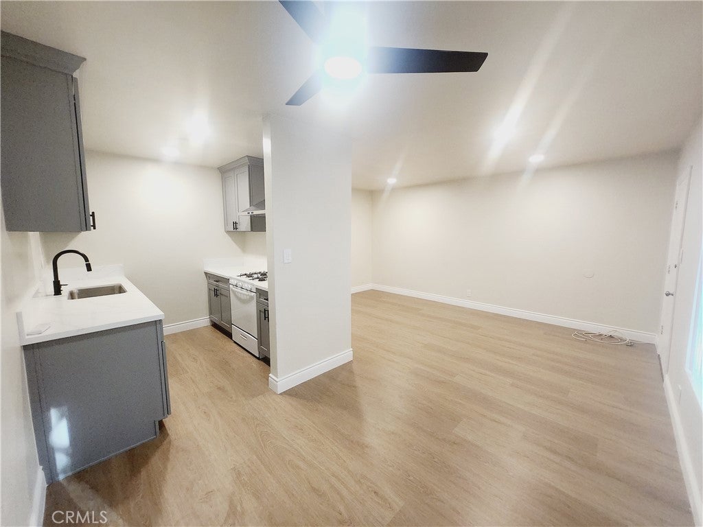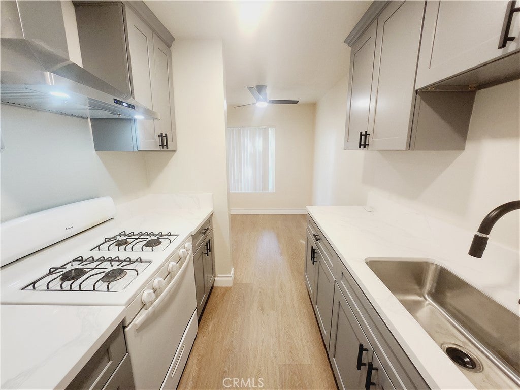 AVAILABLE FOR IMMEDIATE MOVE-IN. This beautifully renovated downstairs 1 BED / 1 BATH apartment is located in a secure, gated 6-unit complex. The unit features a new modern kitchen and bathroom, stylish vinyl flooring, recessed lighting, wall-mounted ductless A/C and heating, and a ceiling fan. The dining area is conveniently located off the kitchen, which includes a gas range. The bathroom is accessible through the bedroom, which also includes a new vanity, ample linen storage, and a spacious walk-in closet. Additionally, the apartment comes with one-half of a shared two-car garage, accessed via the alley. Landlord pays water, gas, trash; tenant only pays for electricity.