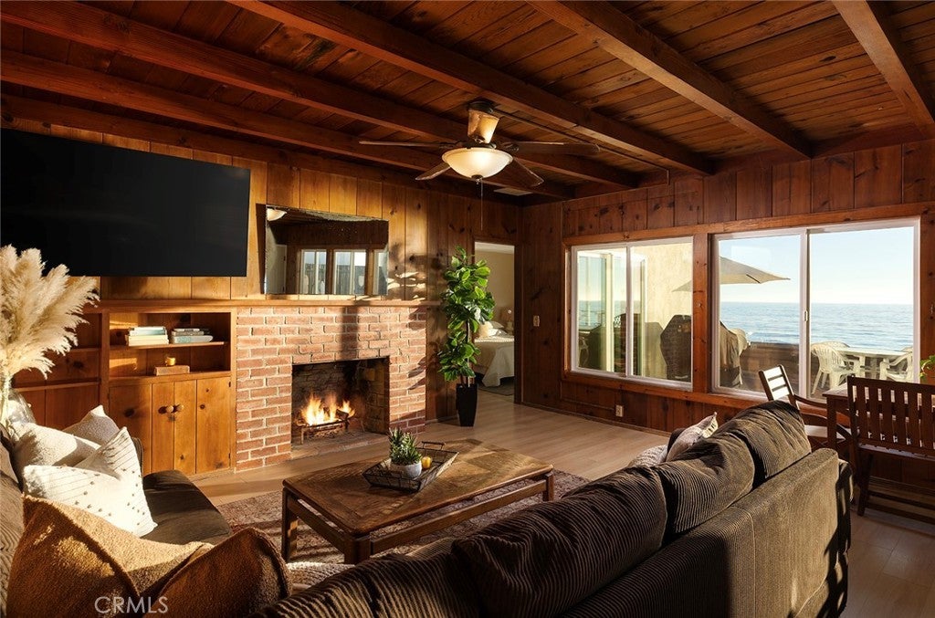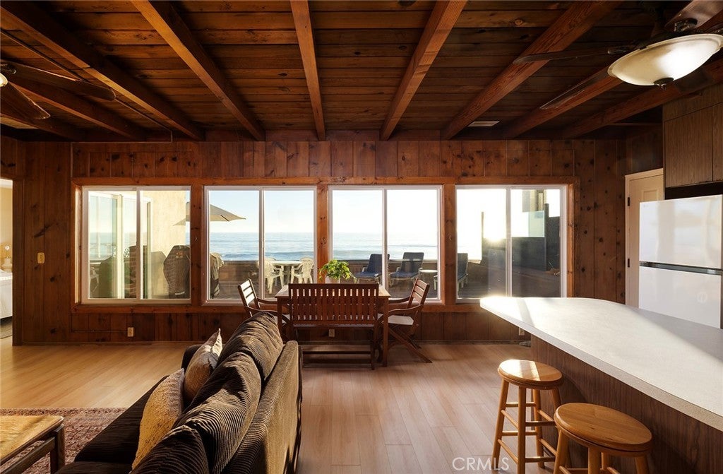 Where classic California lives forever by the sea. Preserved with care and perched directly on the sand, this mid-century beach cottage along Dana Point’s guard-gated Beach Road offers a glimpse into coastal living as it was meant to be—simple, soulful, and endlessly relaxing. Behind the seawall and the sound of the surf, original details tell the story of the home’s 1940s heritage: beamed wood ceilings, paneled walls, and a breezy open layout that connects every moment to the ocean just beyond the deck. Wide windows frame Catalina views, while natural light drifts across warm laminate floors and a palette that feels both nostalgic and current. Three bedrooms and two baths unfold on a single level, offering effortless flow from morning coffee to sunset gatherings. The kitchen remains open to the main living area—where family, friends, and salty air naturally converge. Step outside to the expansive deck and watch the tide roll in from your private stretch of sand—your front-row seat to dolphins, color-soaked skies, and the rhythm of coastal life. Situated halfway between Los Angeles and San Diego—but a world away—Beach Road offers a level of privacy and tranquility rarely found along the Southern California coast. Unobstructed front-row views focus on breaking waves and the azure Pacific Ocean, while Catalina Island, city lights, San Clemente’s pier, and Dana Point’s rugged Headlands draw the eye up and down the shore. Homeowners along this exclusive stretch own to the median high-tide line, creating an unmatched connection to the sand and sea. With a single-car garage and four-car parking pad, this is one of the few places where convenience and serenity meet at the water’s edge. Whether preserved in its current vintage beauty or reimagined as a modern retreat, life here remains centered on the sea—a rare opportunity to experience the heritage of true California beachfront living, timeless and always within earshot of the waves.