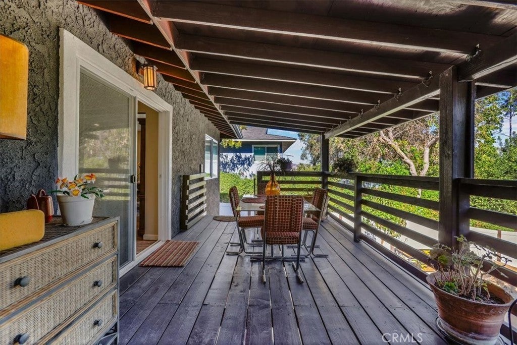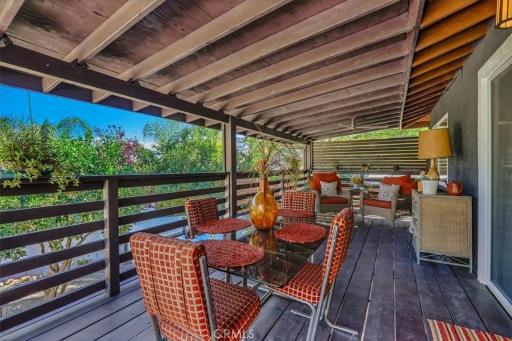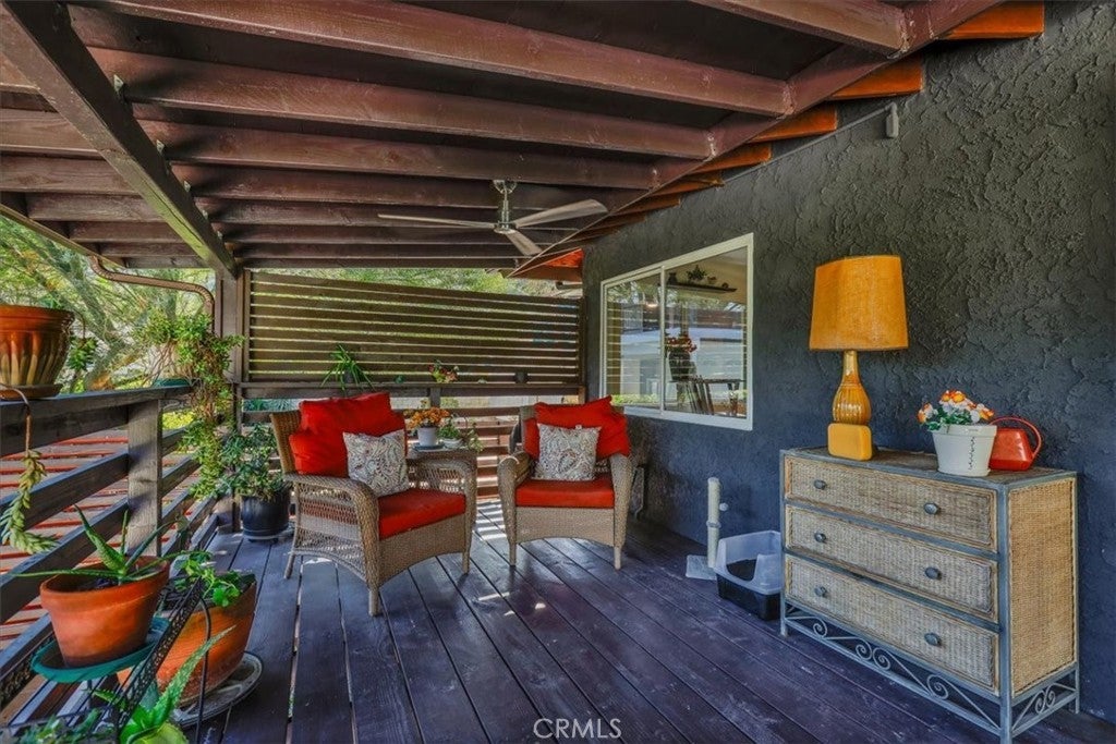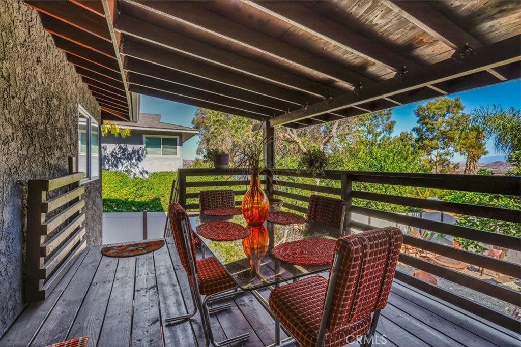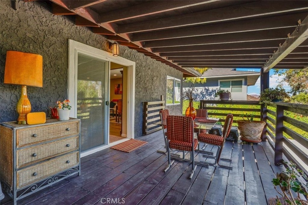 Tucked along a quiet incline in Lake Elsinore, this charming single-level home combines comfort, privacy, and beautiful outdoor living. A private walkway of dark wood leads to a tiled front porch and vibrant orange door, setting a welcoming tone. Inside, the home features cohesive ceilings with recessed lighting and wood-style flooring that extends throughout the main areas. The layout opens to a bright living and formal dining area, flowing into a spacious kitchen with an additional dining nook and sliding doors leading to the deck. A central hallway offers convenient access to the laundry area, two secondary bedrooms (one with garage access), a full bathroom, and the primary suite with an ensuite bathroom. Each bedroom includes ceiling fans and natural light. The true highlight of the home is its expansive, covered deck, crafted with rich dark wood, a ceiling fan, and serene views of the landscaped yard below. The backyard feels like a private retreat, featuring tiered spaces with stone and gravel pathways, lush greenery, and a spa tucked beneath the deck. The property also includes a two-car garage and a decorative stone perimeter fence, completing its inviting curb appeal.